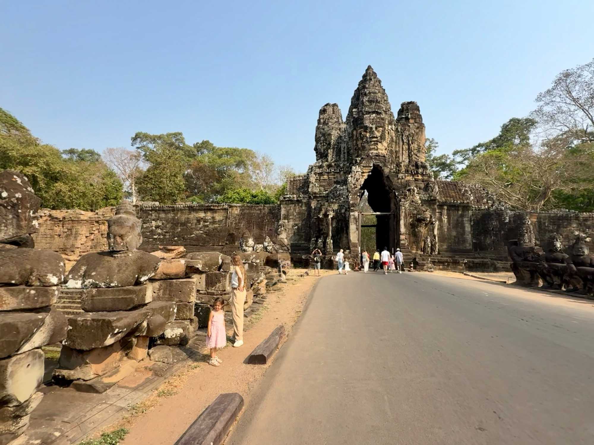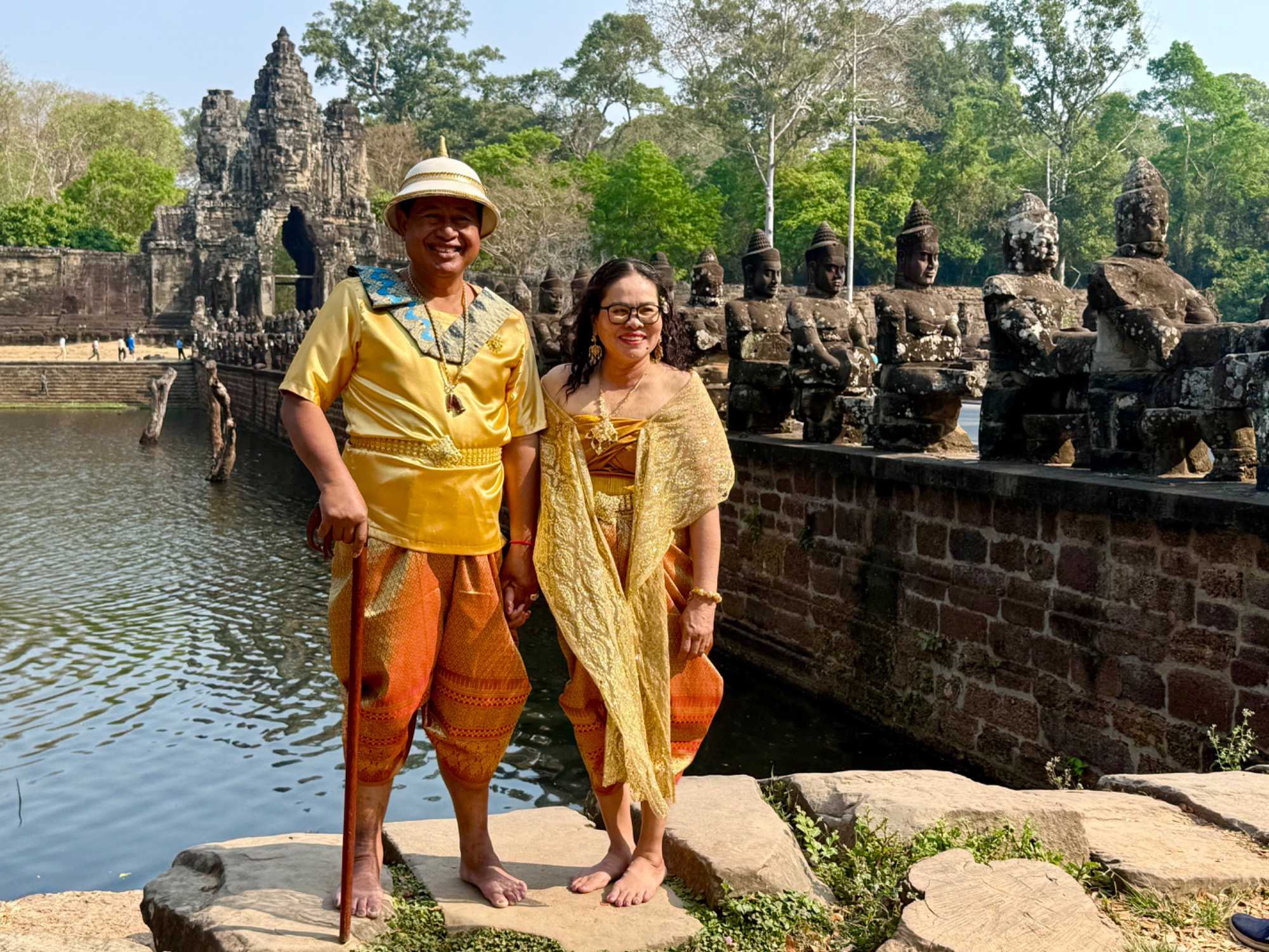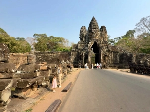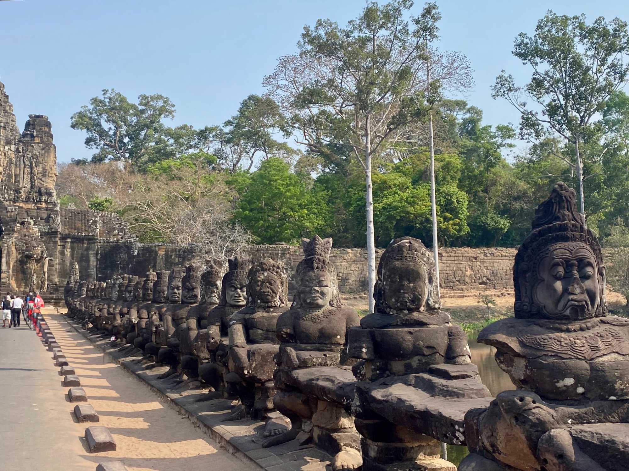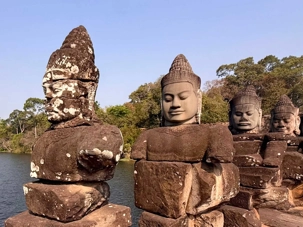Ce matin est dédié à la poursuite de la visite du grand complexe archéologique et nous débutons par Angkor Thom, qui est une ancienne cité fortifiée. Elle a été fondée à la fin du XIIe siècle par le roi Jayavarman VII et servait de capitale de l’Empire khmer. La ville est entourée de hauts remparts et d’un large fossé, avec cinq portes monumentales ornées de visages sculptés. En son centre se trouve le célèbre temple du Bayon, connu pour ses tours à visages souriants. Angkor Thom représente l’un des ensembles architecturaux les plus impressionnants et symboliques du Cambodge.