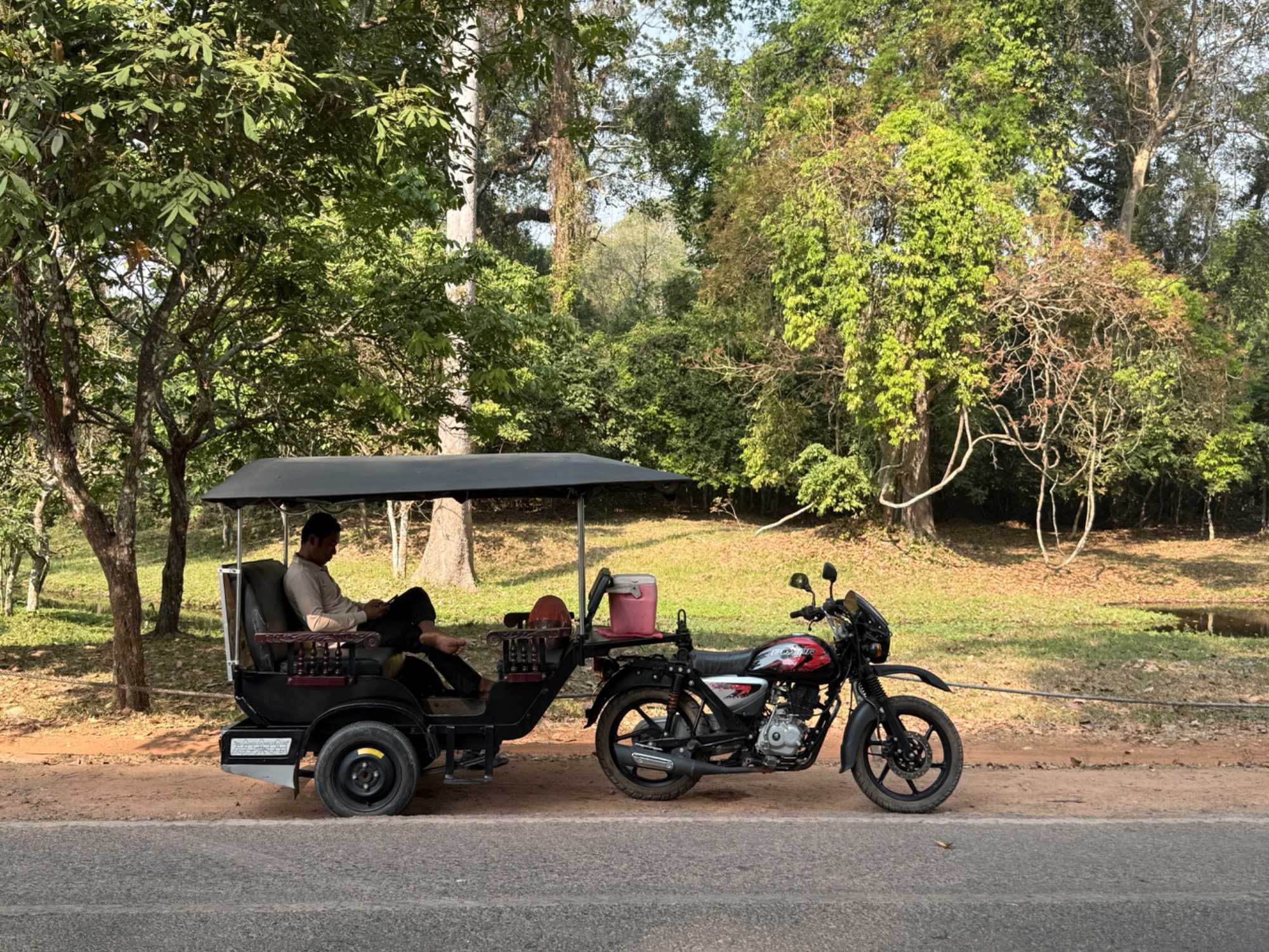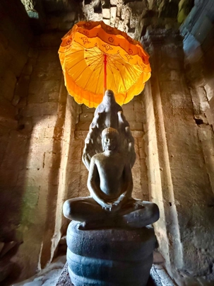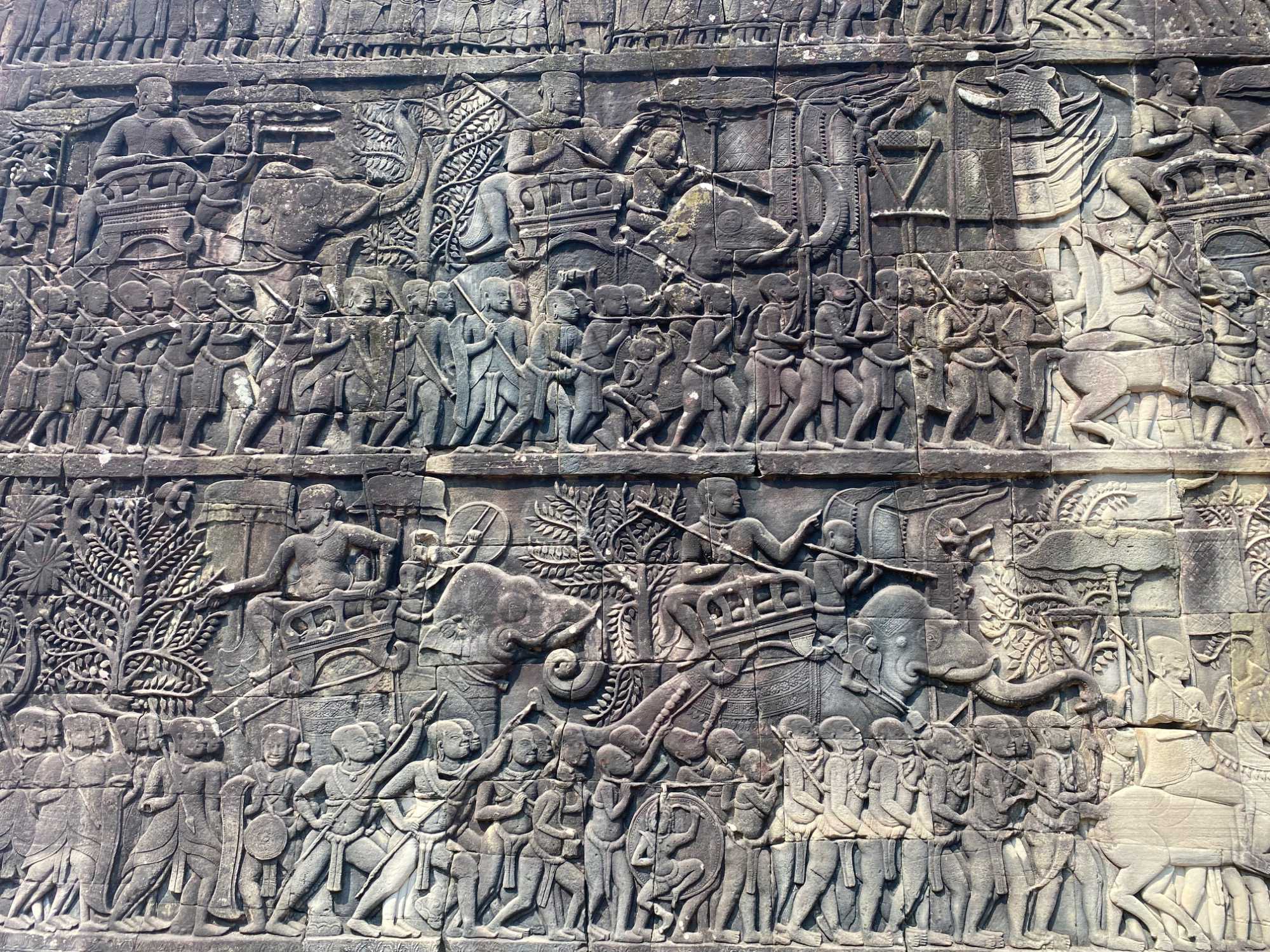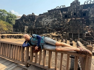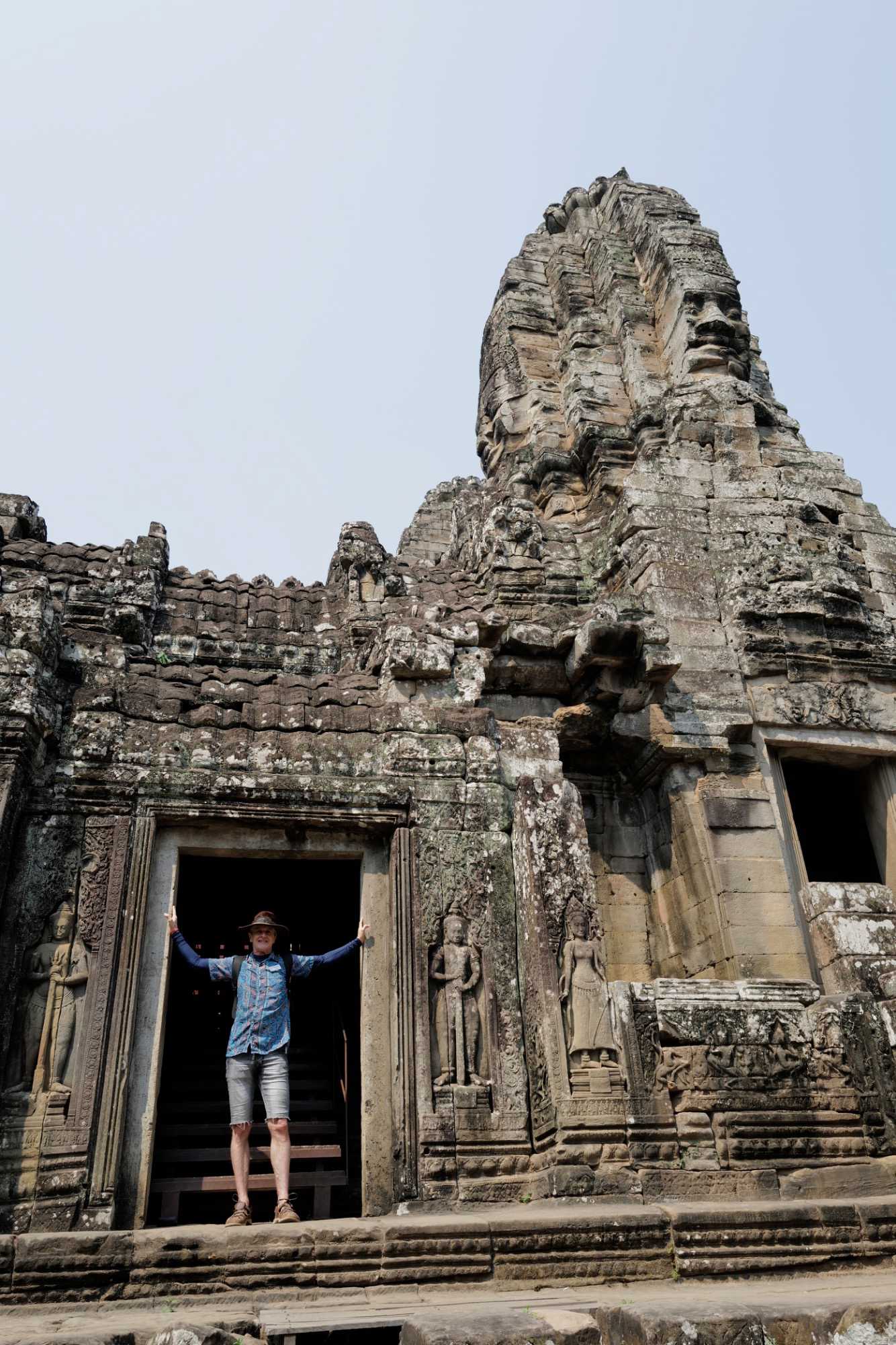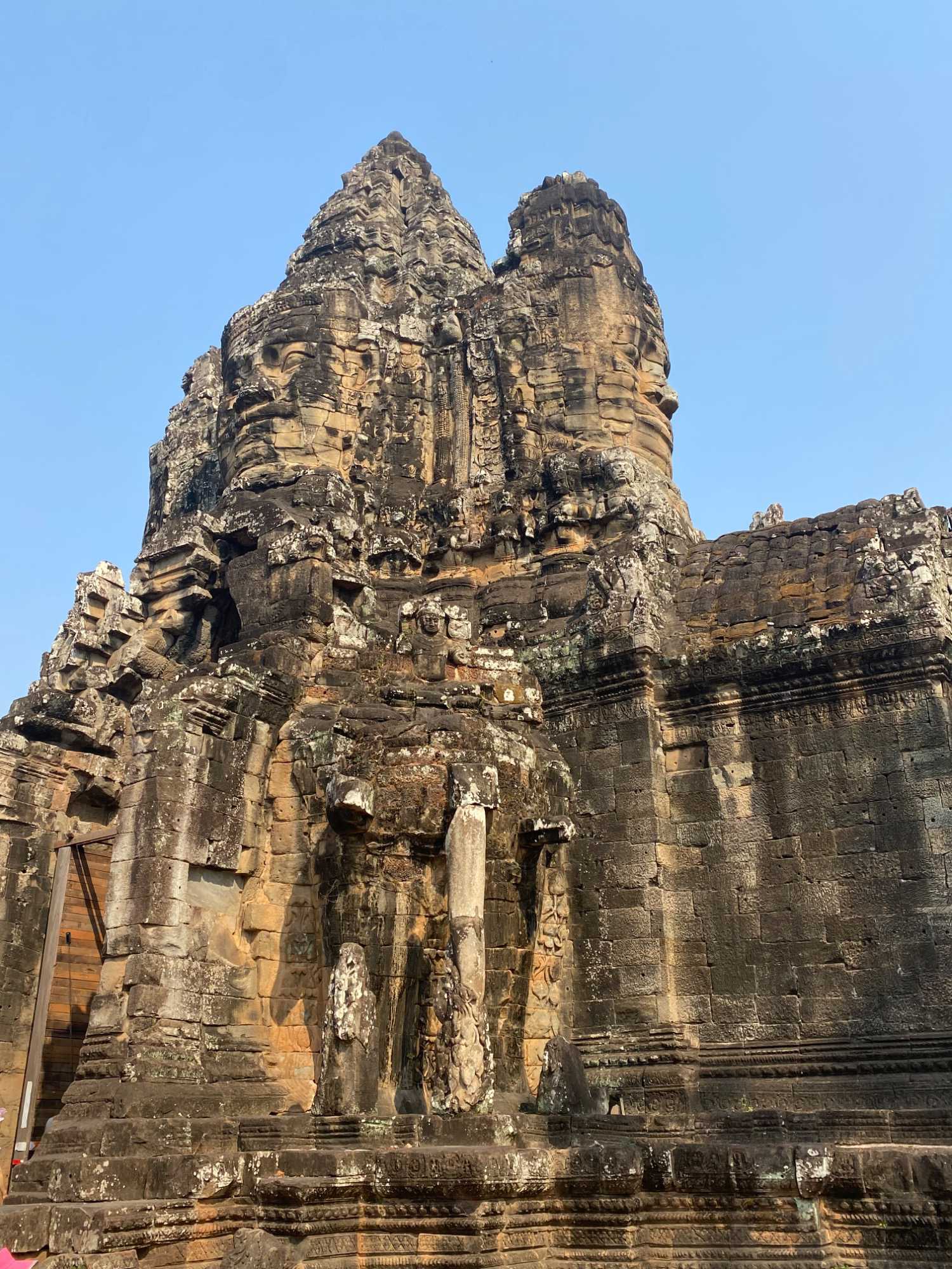 Nous poursuivons notre ballade au temple d’Angkor Thom, ancienne capitale de l’empire khmer. En son centre se trouve le célèbre Bayon, construit au XIIIᵉ siècle sous le règne de Jayavarman VII. Ce temple hindou-bouddhiste est remarquable pour ses immenses tours ornées de centaines de visages sculptés, ainsi que pour ses nombreux bas-reliefs représentant des scènes de la vie quotidienne, des batailles et des récits mythologiques. Elle repose sur trois niveaux concentriques, avec une hauteur totale atteignant les 45 mètres.