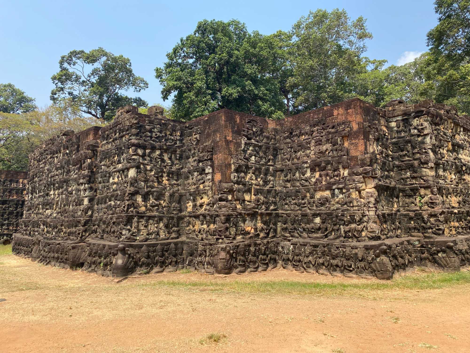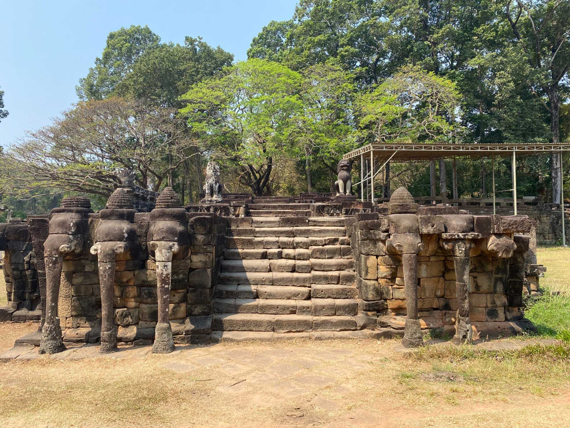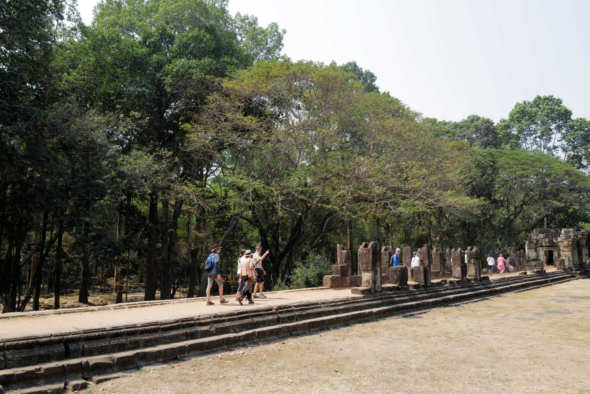 La Terrasse des Éléphants est une vaste plateforme située au cœur d’Angkor Thom. Elle a été aménagée à la fin du XIIe siècle sous le règne de Jayavarman VII. Longue d’environ 300 mètres, elle servait de tribune royale pour les cérémonies publiques, les défilés et les spectacles. Son nom provient des sculptures d’éléphants grandeur nature qui ornent ses murs. La terrasse est aujourd’hui l’un des sites emblématiques d’Angkor, témoignant de la grandeur de l’Empire khmer.
