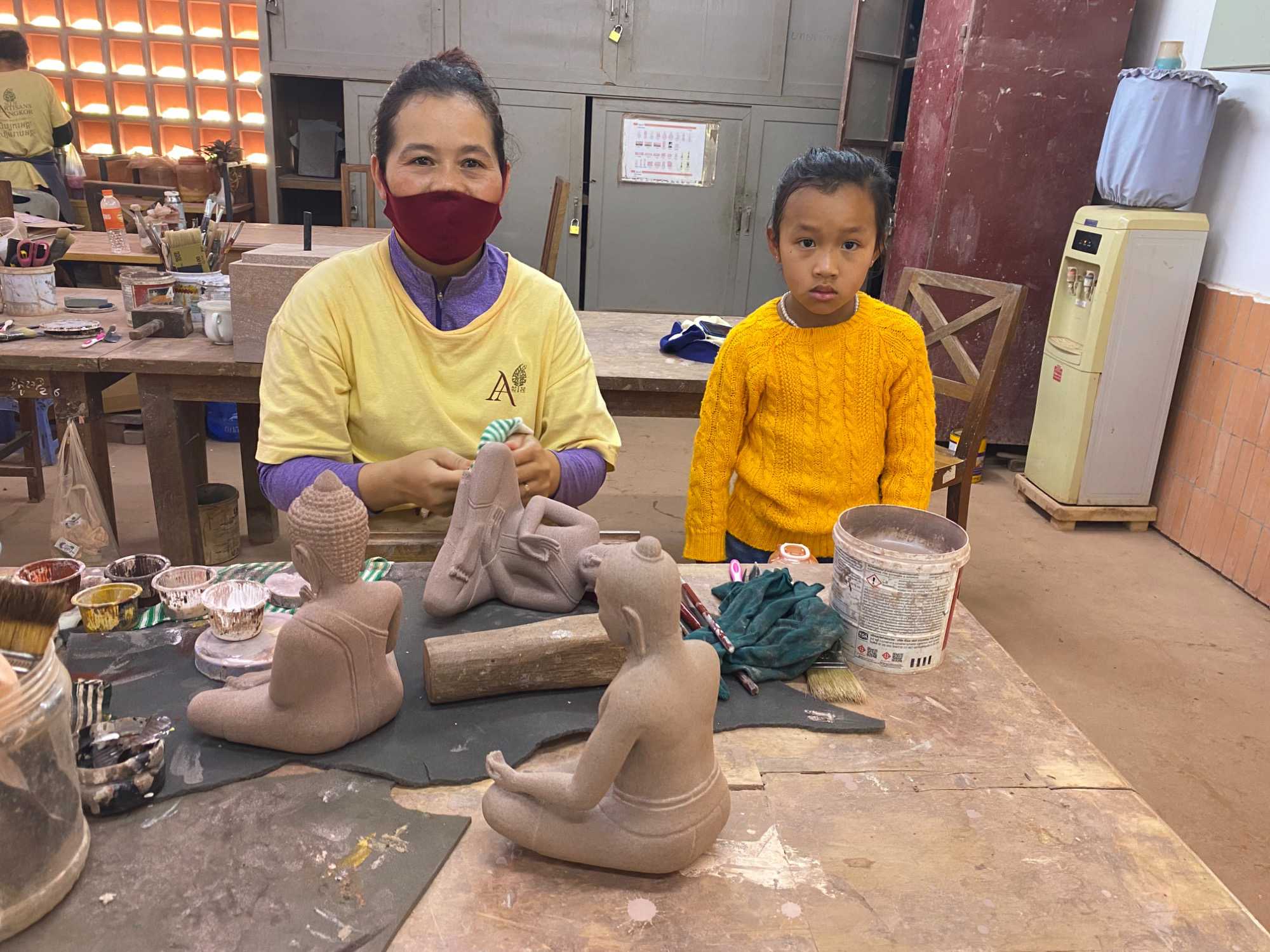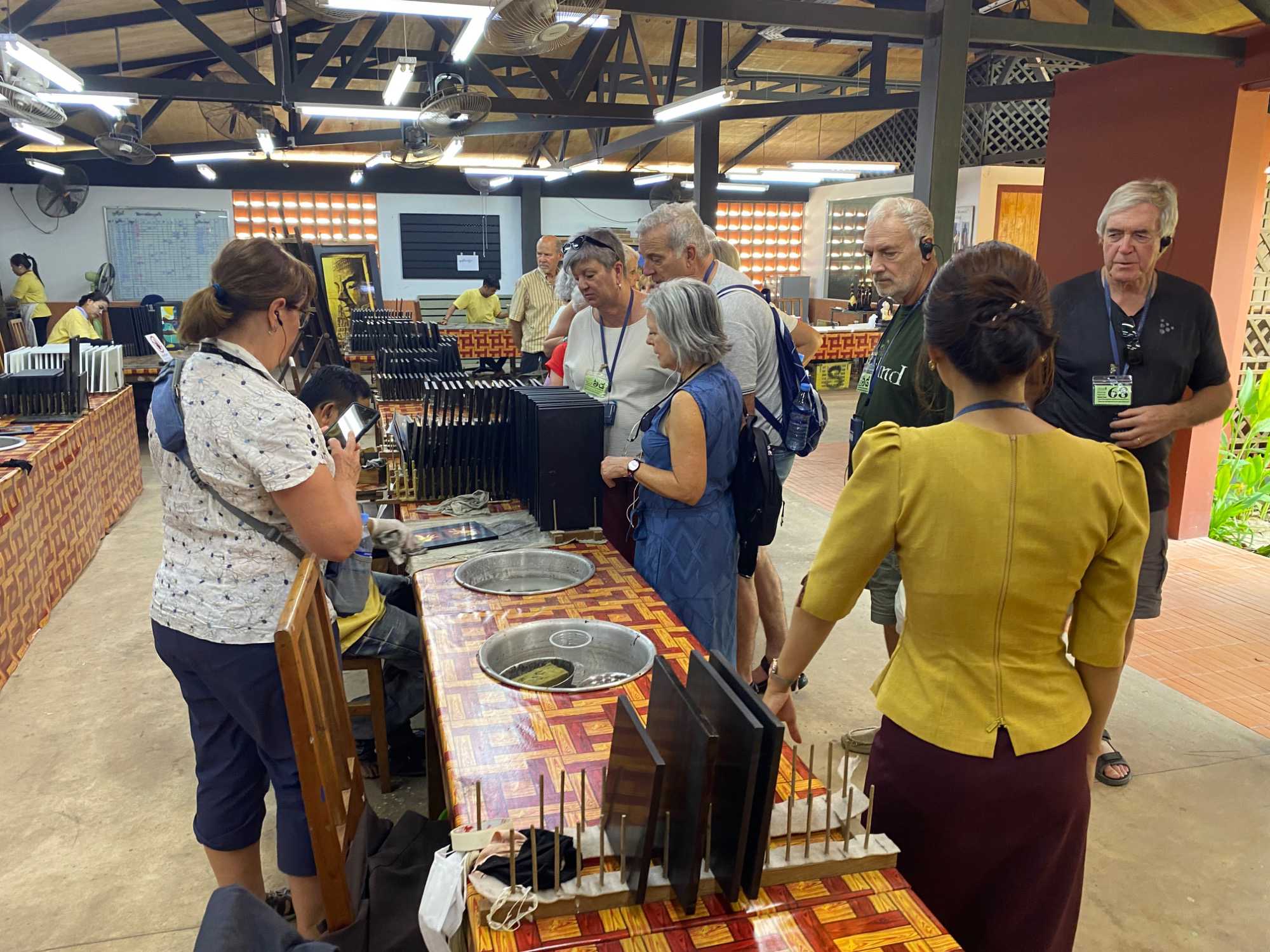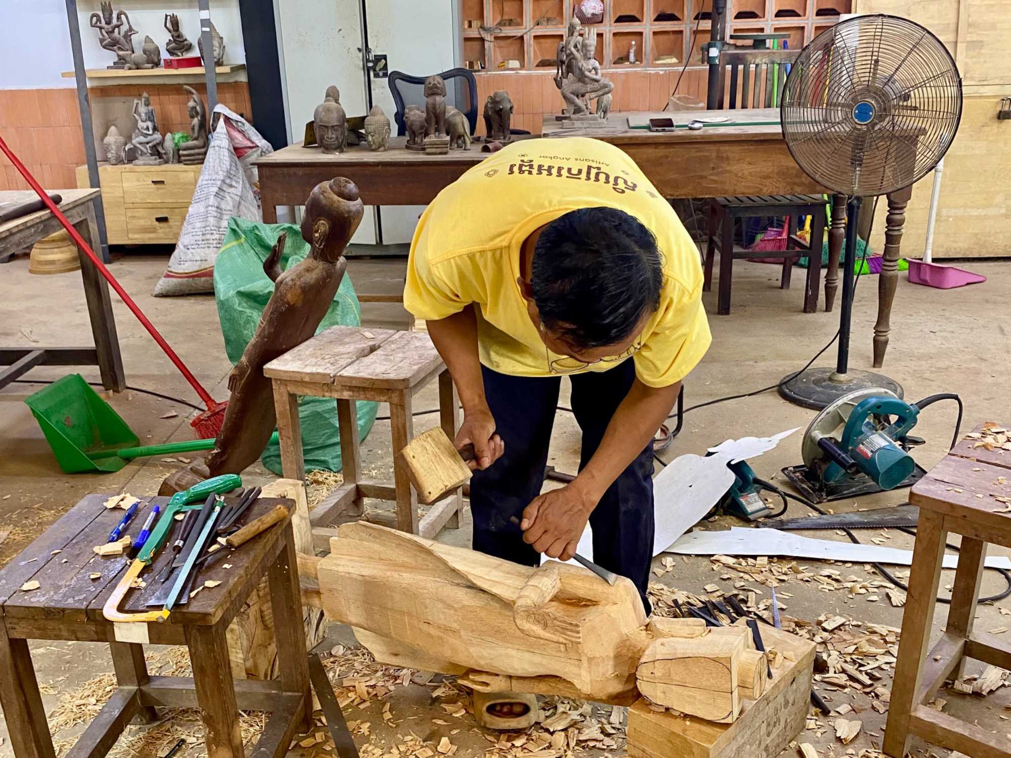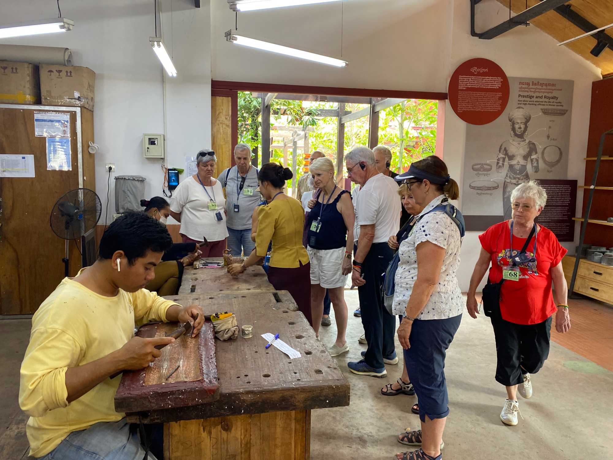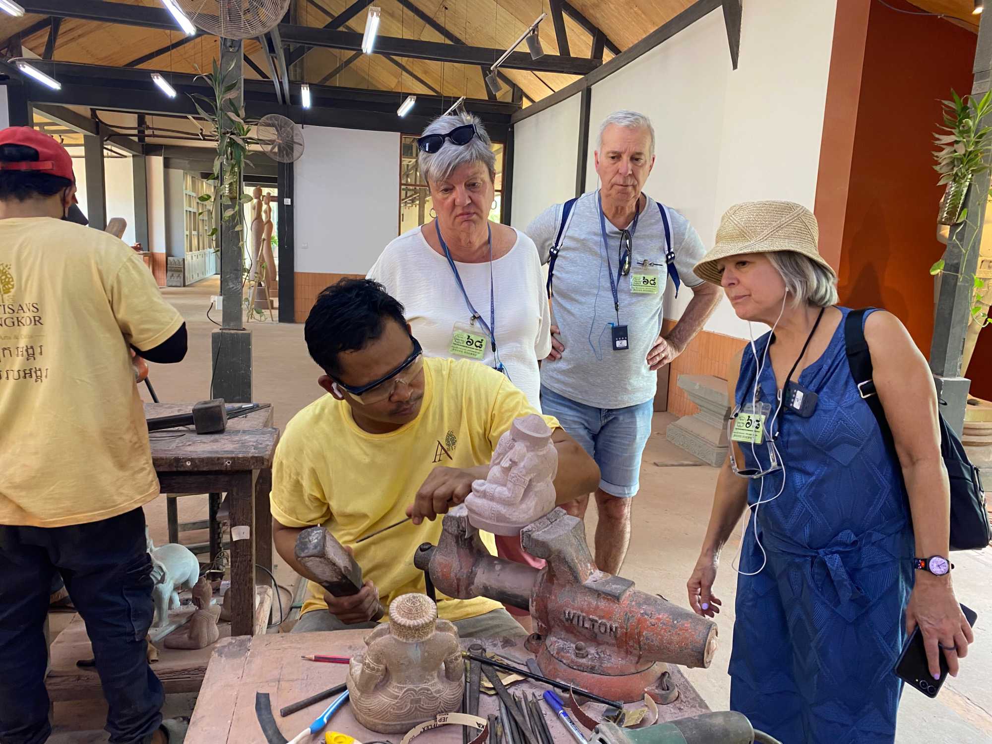 Le chantier-école offre aux jeunes Cambodgiens une formation artisanale solide et participe à la renaissance des traditions artistiques dans les villages. Avant la pandémie de COVID-19, l’organisation employait un nombre encore plus important d’artisans , environ 1500 personnes; aujourd’hui, elle fait vivre environ 500 personnes réparties dans 48 ateliers. Les Artisans d’Angkor représentent ainsi l’un des projets de revitalisation de l’artisanat les plus réussis du Cambodge. Lors de notre visite, les artisans nous dévoilent avec passion toutes les étapes de fabrication, qu’il s’agisse de sculptures ou de laques. Une expérience des plus enrichissantes !