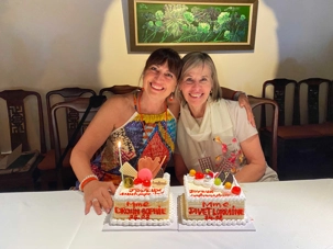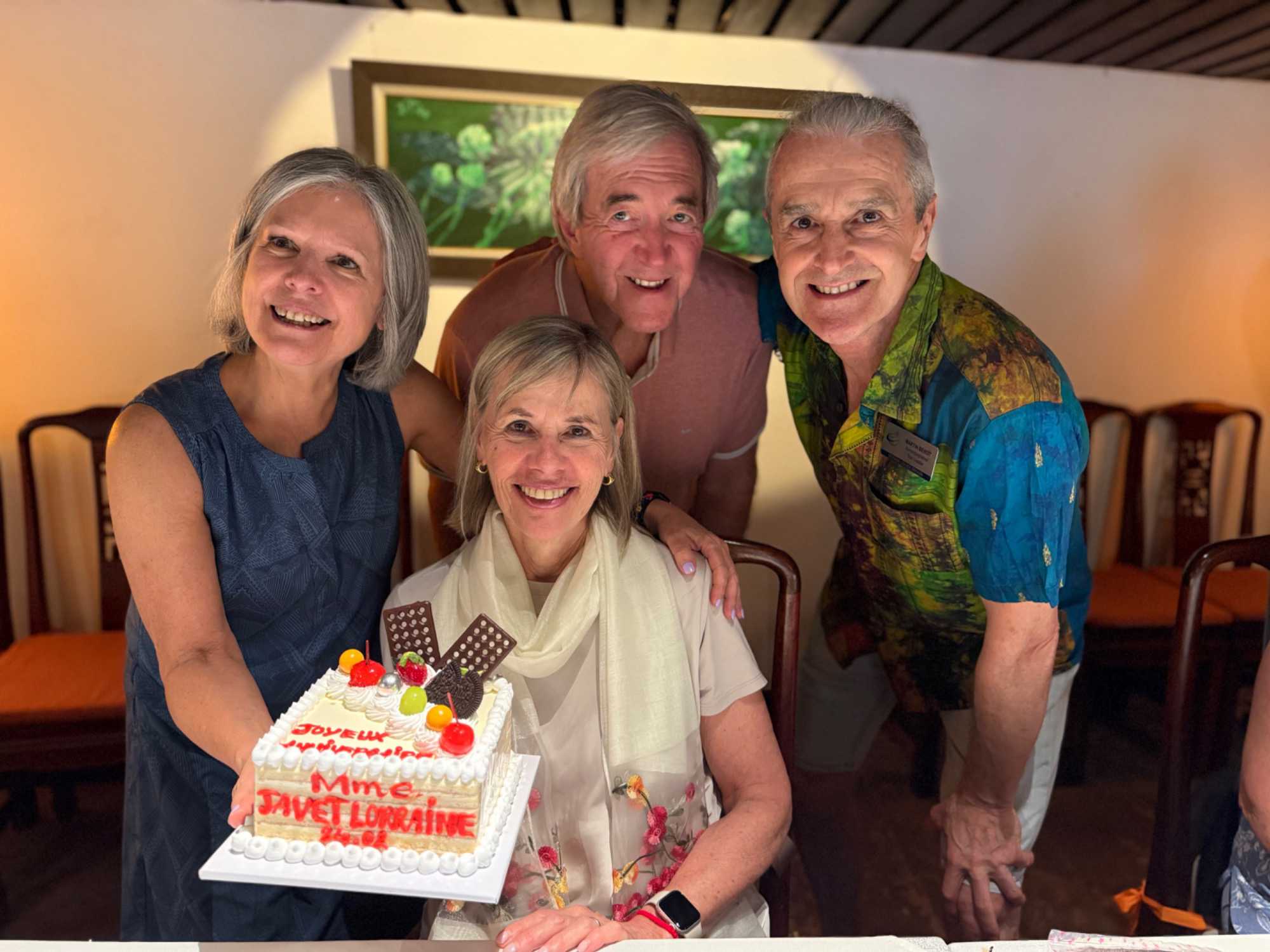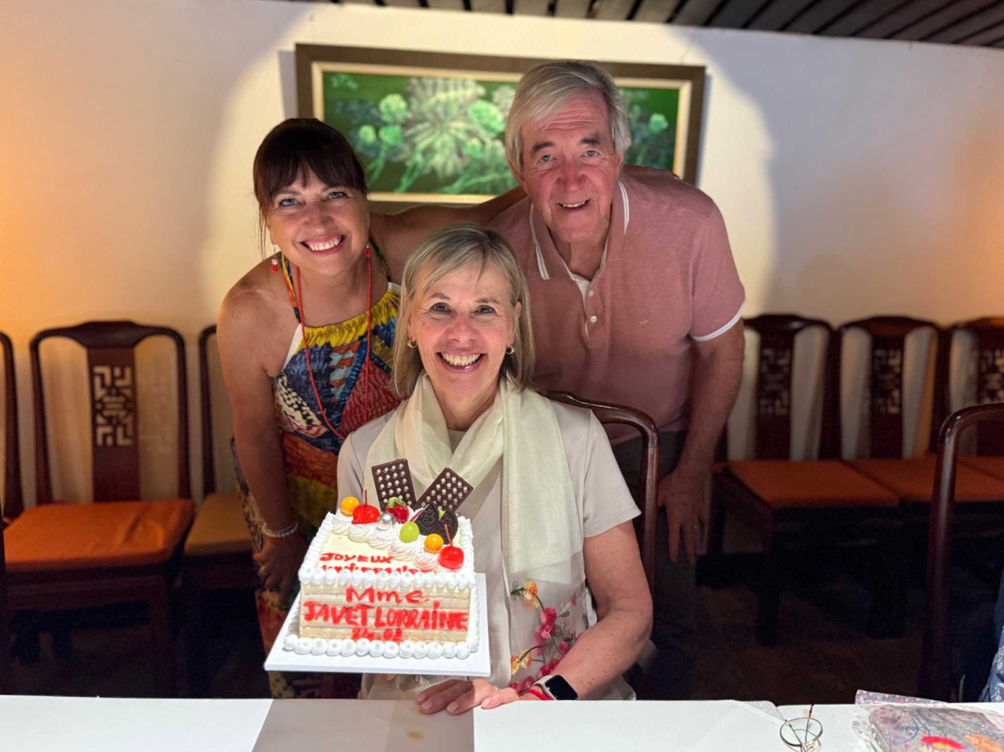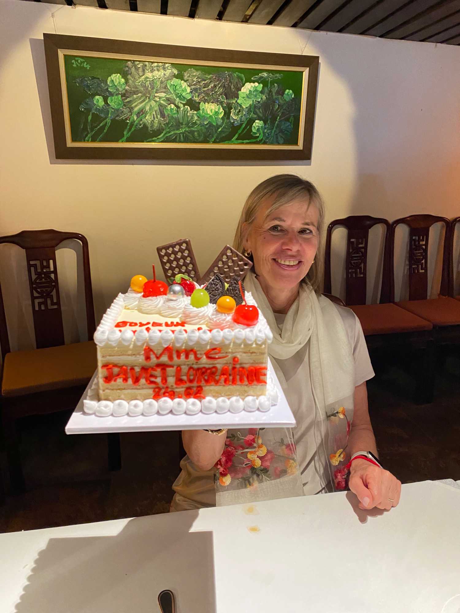 Nous soulignons l’anniversaire de Lorraine avec un gâteau surprise qui ajoute une note sucrée et joyeuse à notre repas. Puis, comme Sophie nous quitte cet après-midi pour poursuivre son périple vers le nord du Vietnam et que son anniversaire approche à grands pas (le 26), nous profitons de l’occasion pour lui offrir, à elle aussi, un gâteau et l’inviter à souffler sa bougie.