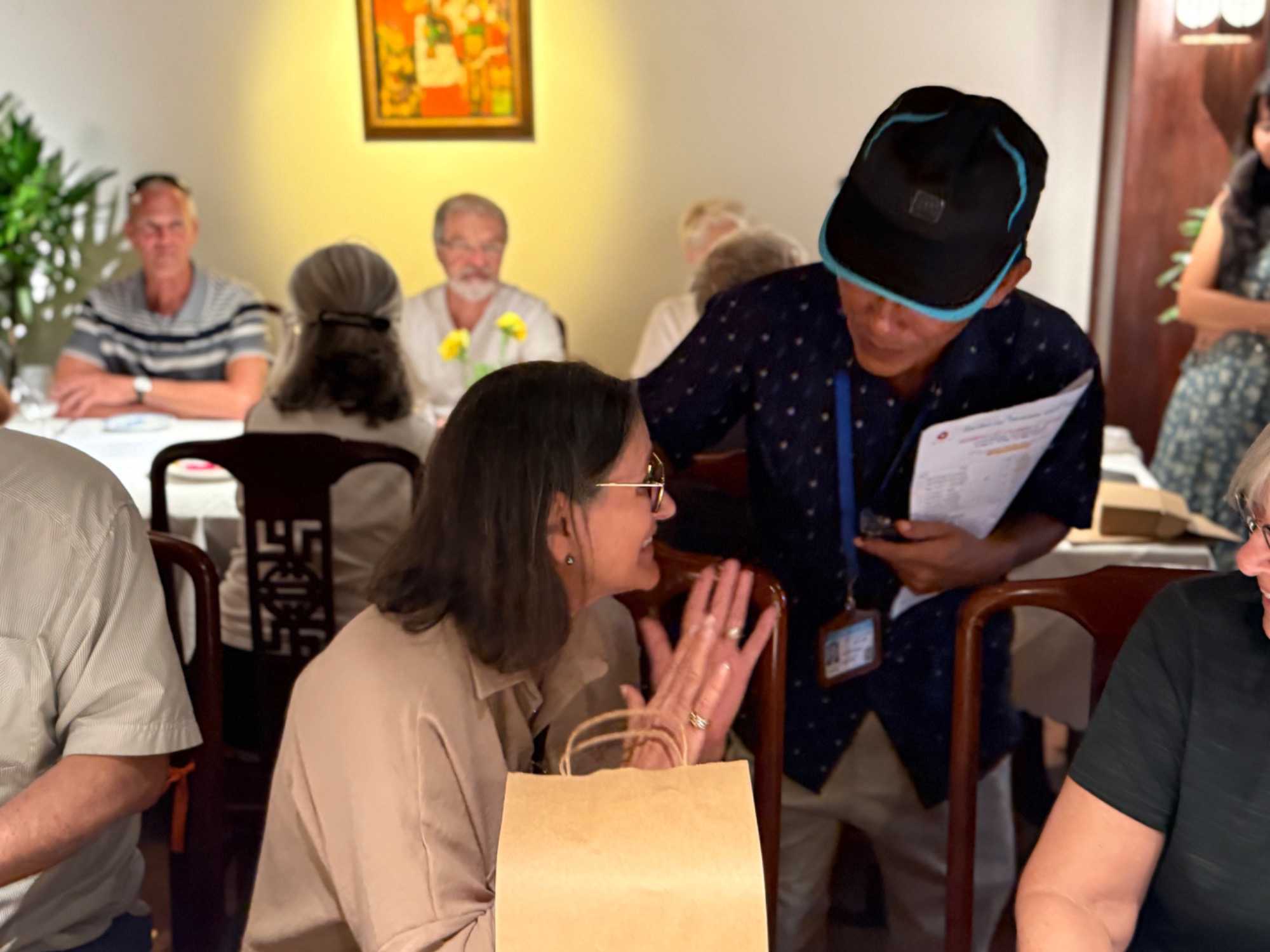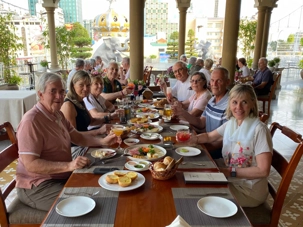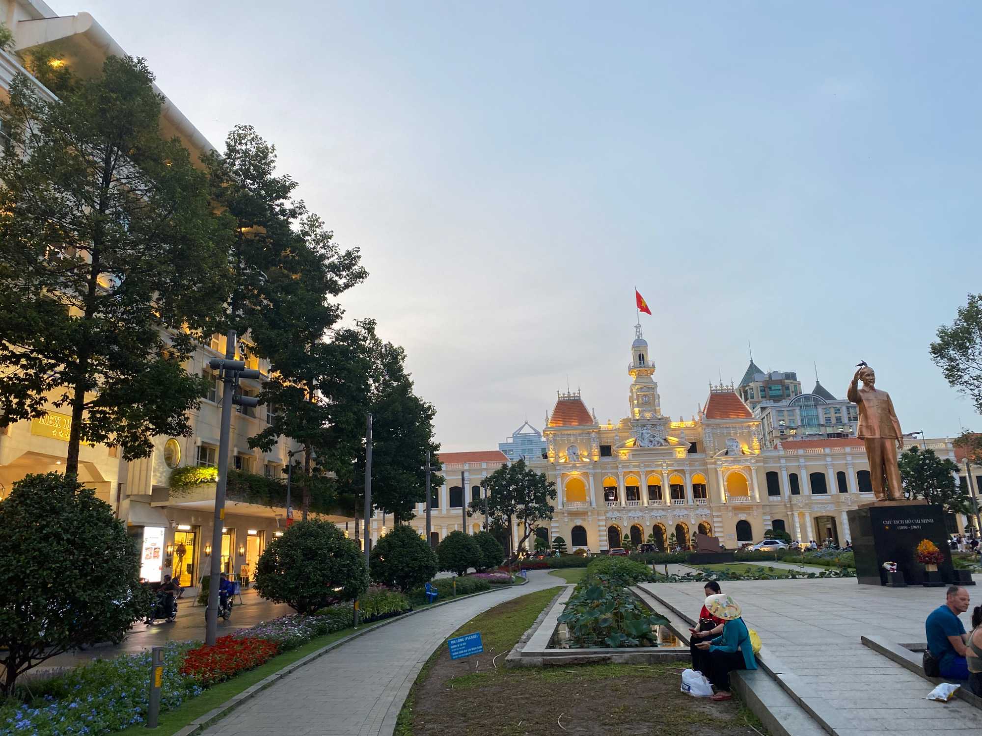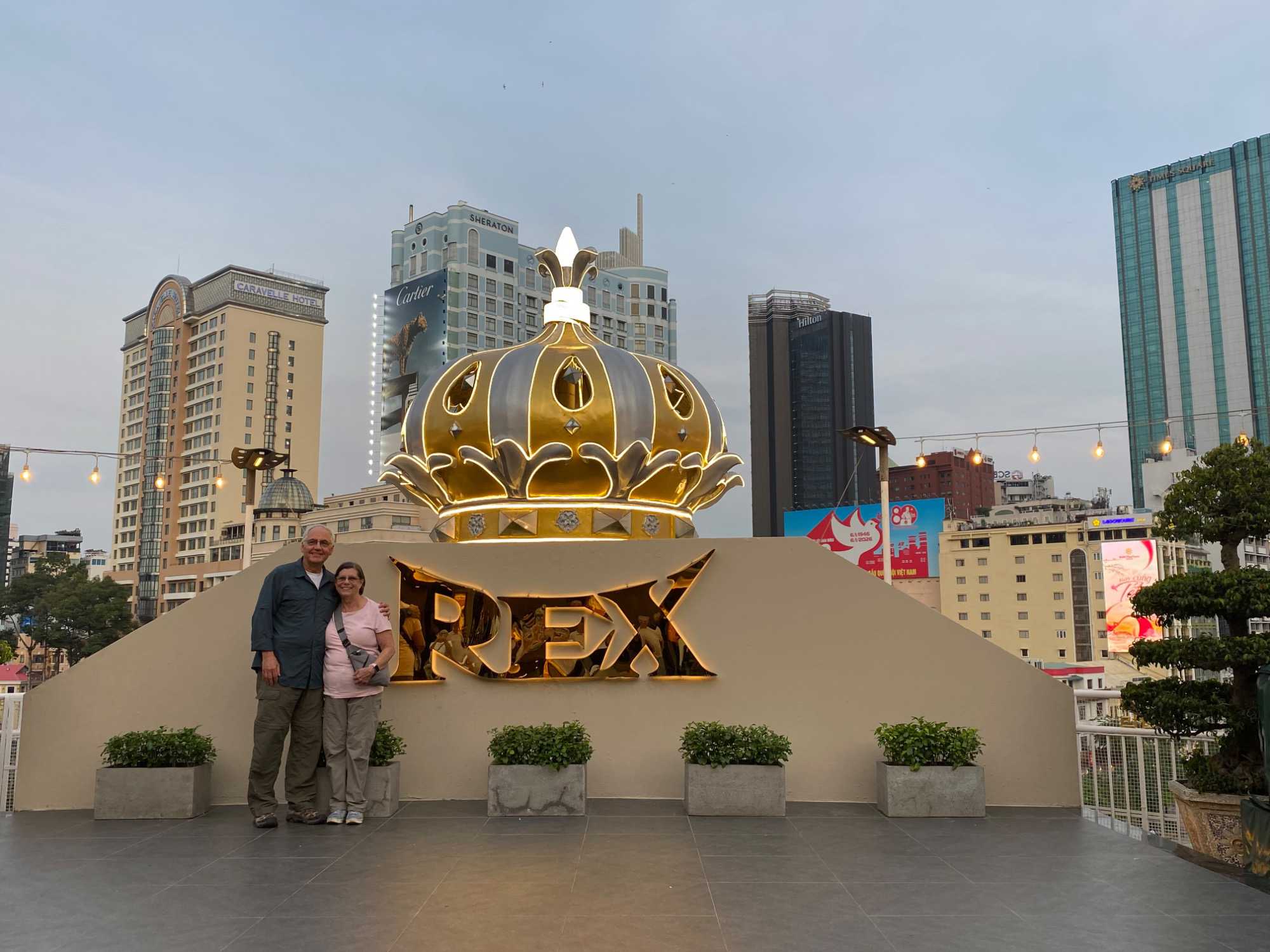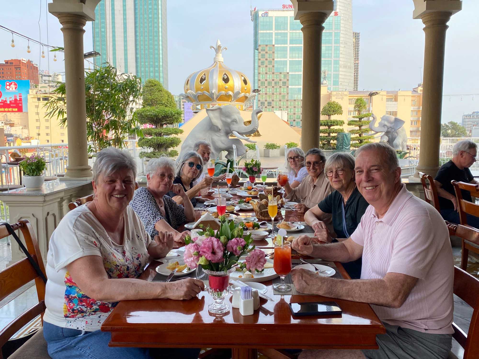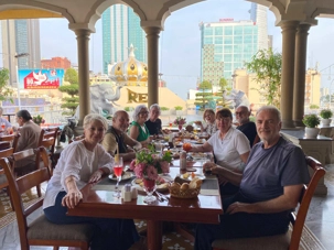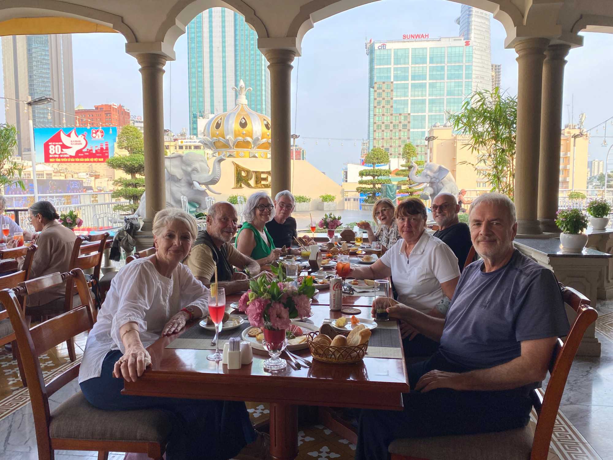 Vers 16 h, nous quittons l’hôtel pour nous rendre au mythique Hotel Rex Saigon. Ancien cinéma à l’époque de l’occupation française, devenu en 1959 le premier hôtel de luxe de Saigon et fréquenté par des dignitaires ainsi que par la presse américaine durant la guerre du Vietnam, il demeure un lieu chargé d’histoire. Installés sur sa célèbre terrasse, nous savourons une dernière collation accompagnée d’un apéritif, tout en admirant la vue imprenable sur l’animation urbaine. Un dernier toast pour célébrer ce voyage exceptionnel et la belle joie de vivre de notre groupe.
