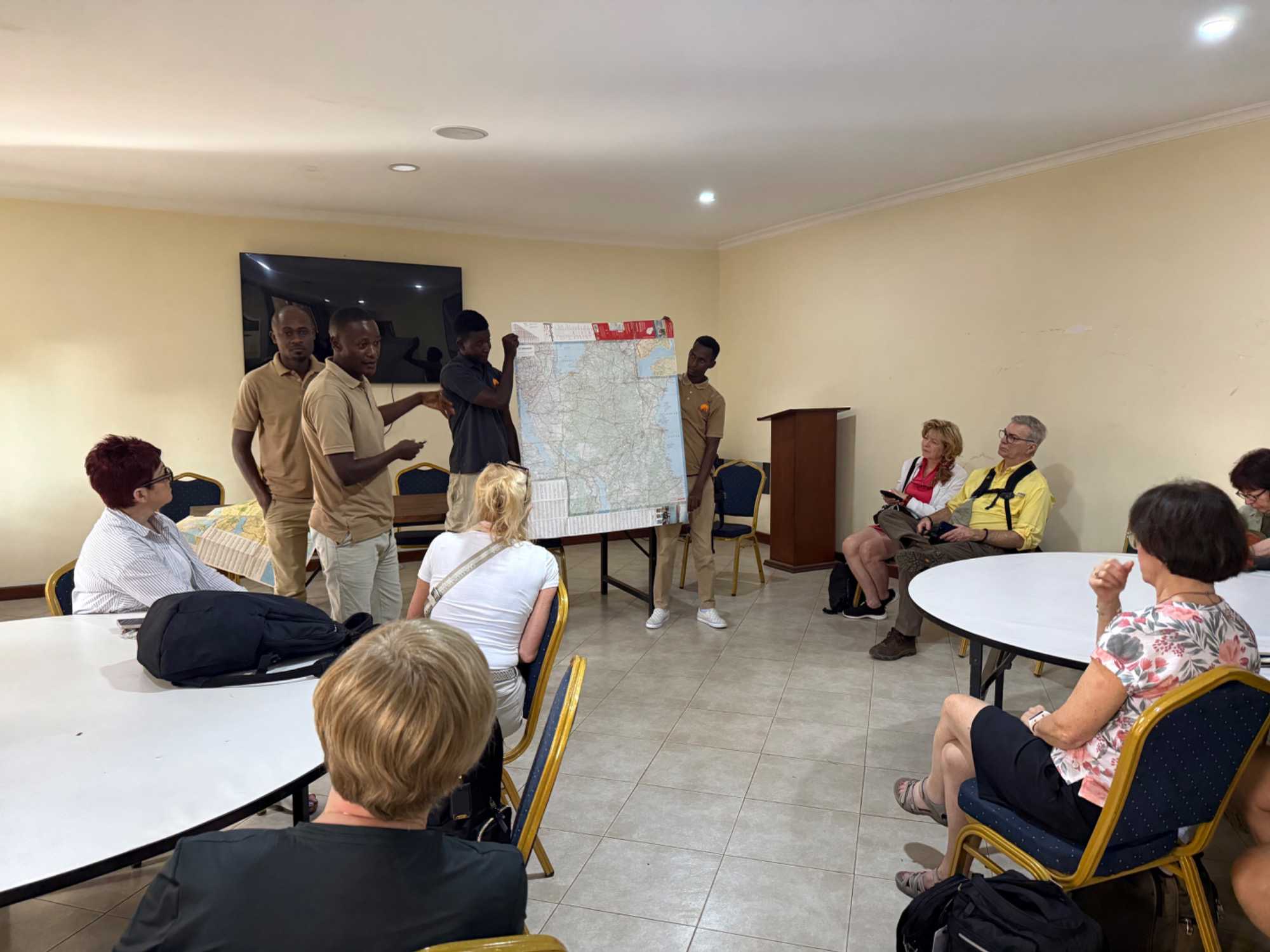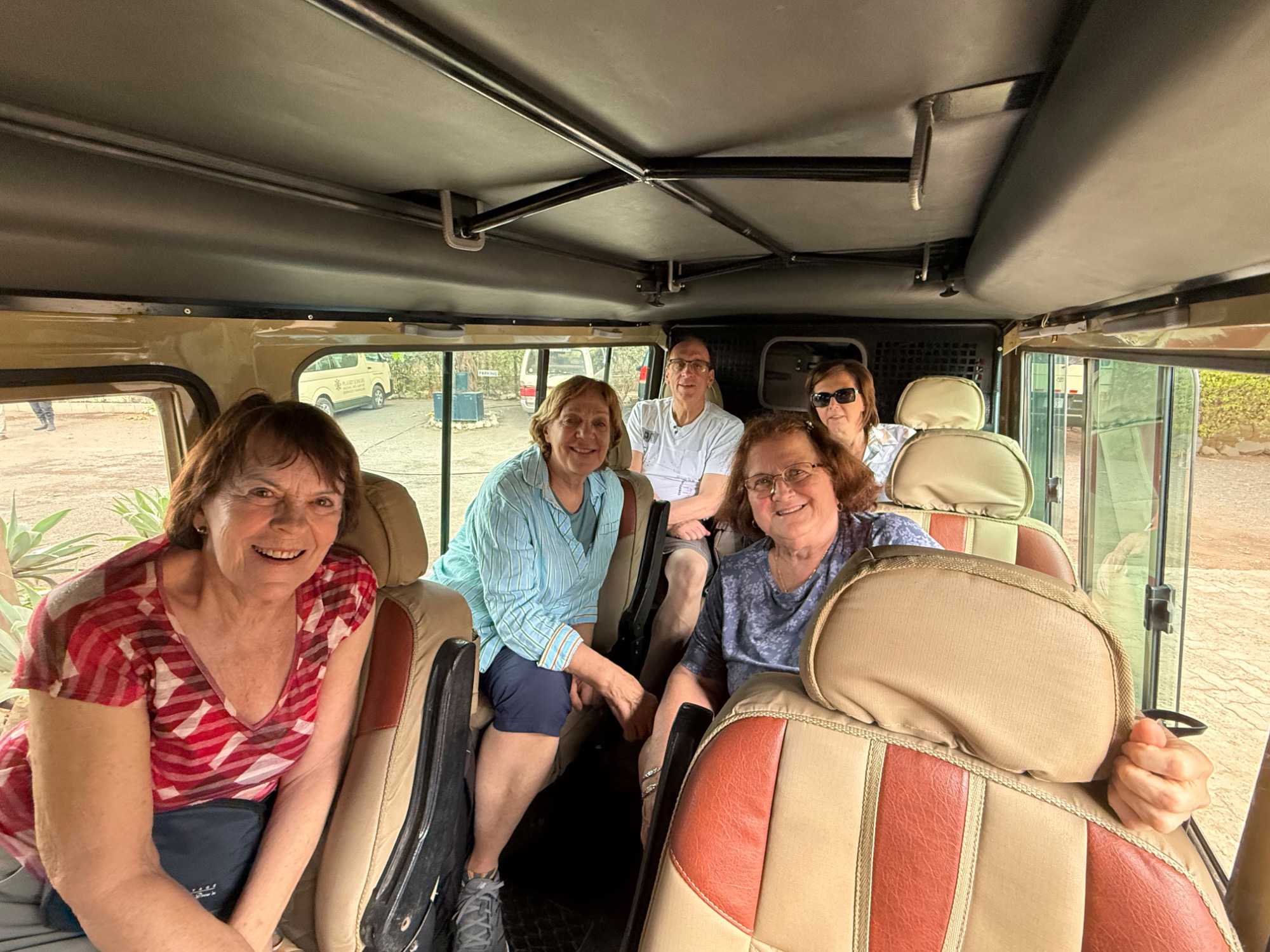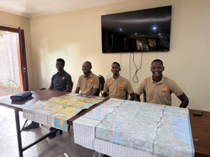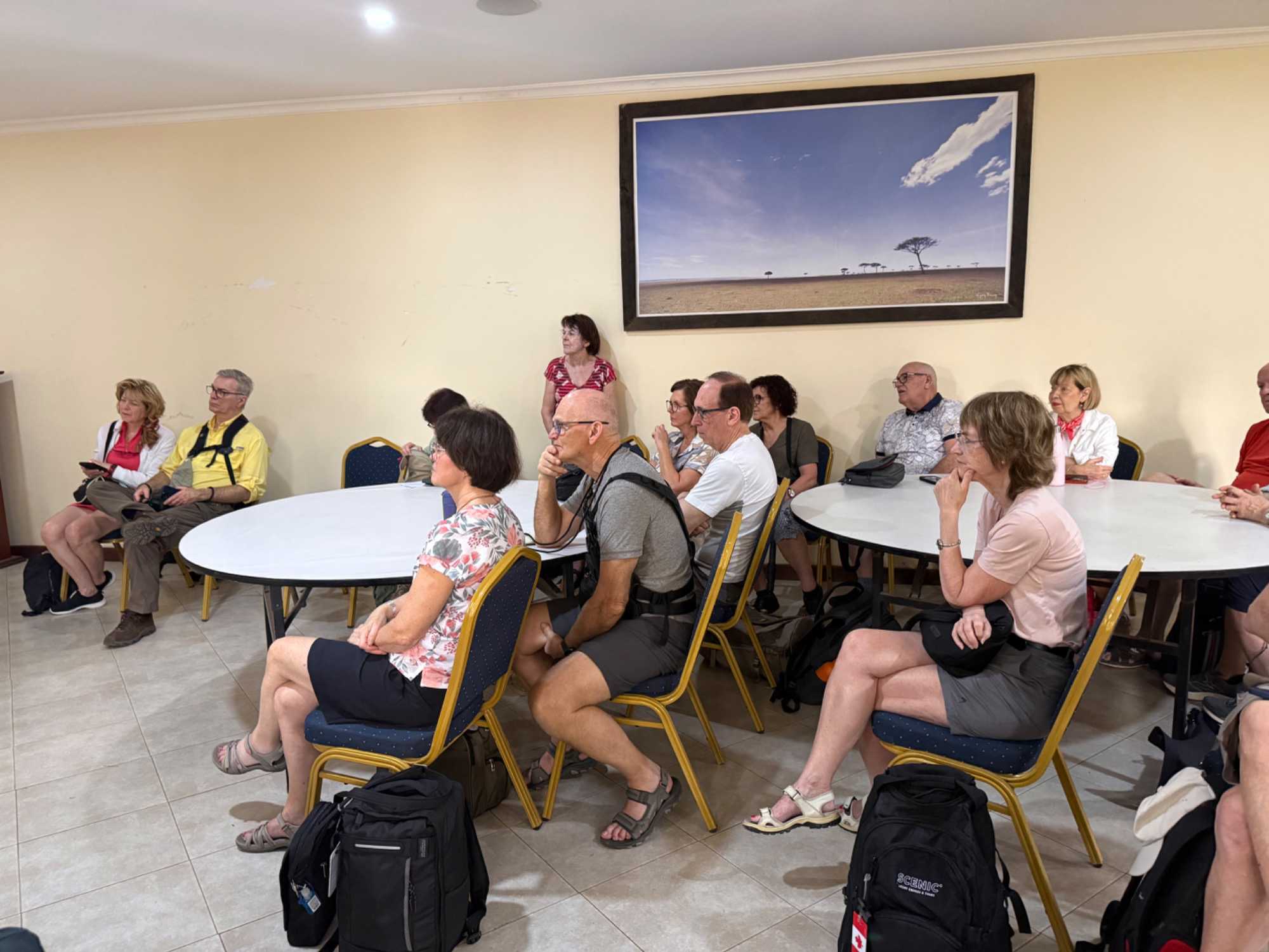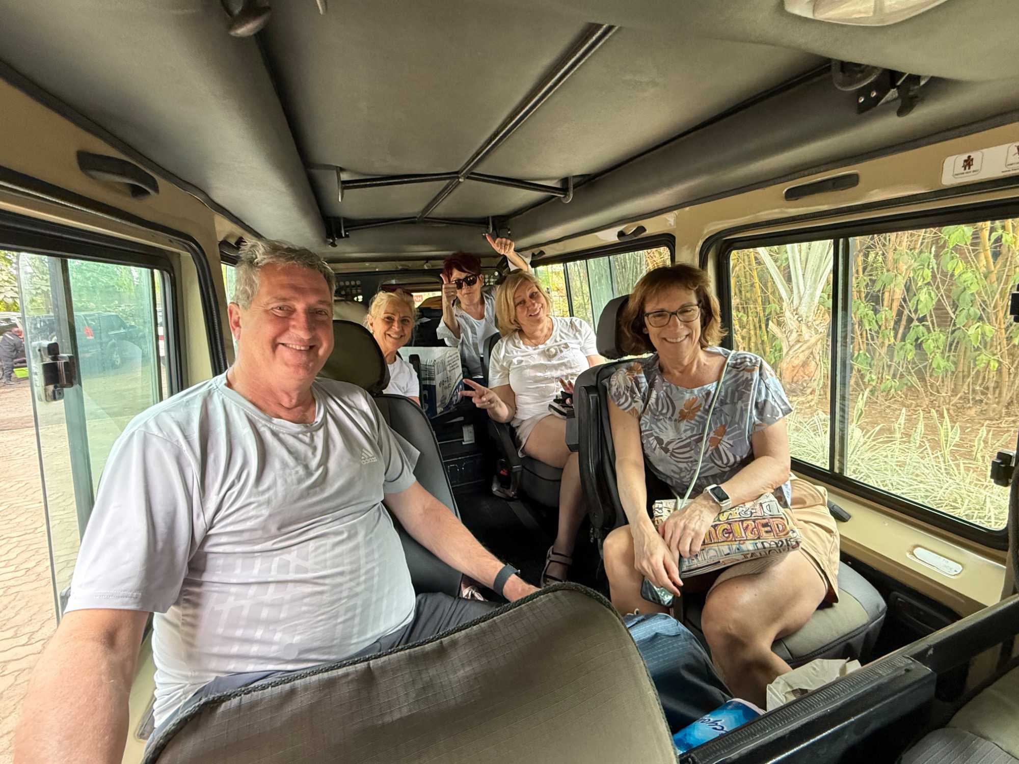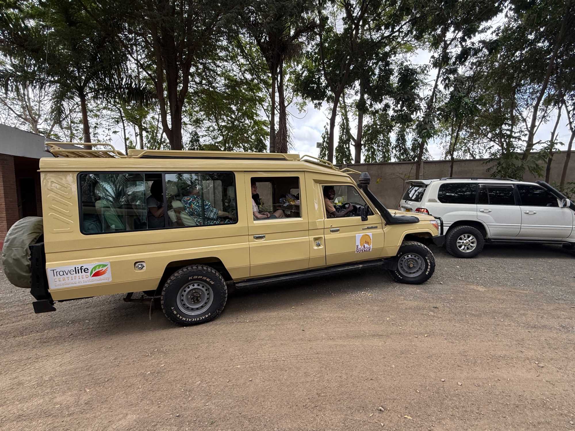 À 8 h 30, nous faisons connaissance avec nos guides-chauffeurs, ceux qui nous accompagneront tout au long du périple à bord de cinq Jeeps. Nous prenons le temps d’échanger, d’écouter, et surtout de nous projeter. Mandela, chef de l’équipe, nous présente avec passion les parcs nationaux que nous visiterons, les régions traversées et le plan de route pour les deux semaines à venir. Ce moment d’échange est précieux : on se sent déjà en confiance, prêts à partir pour cette grande aventure africaine.