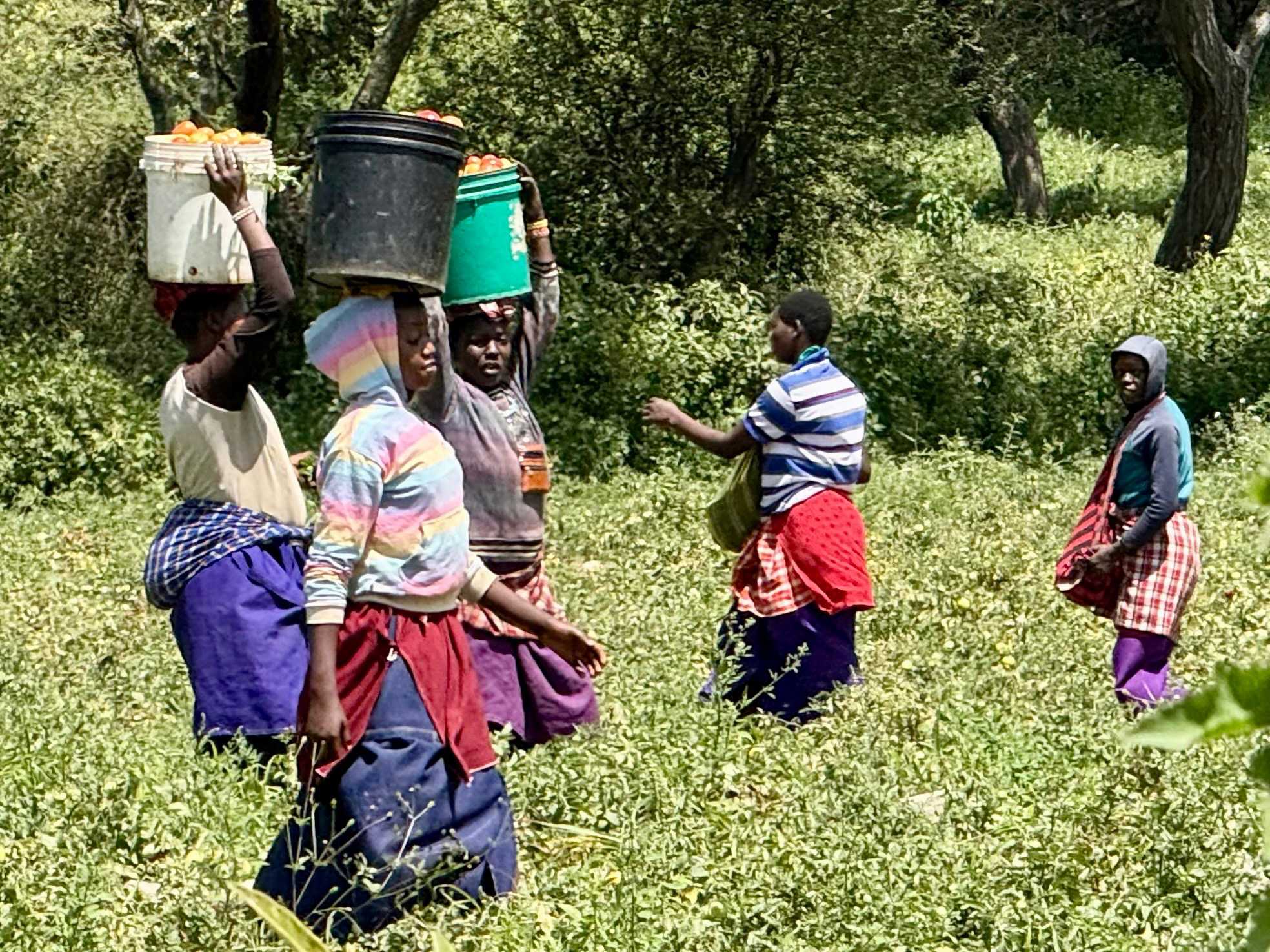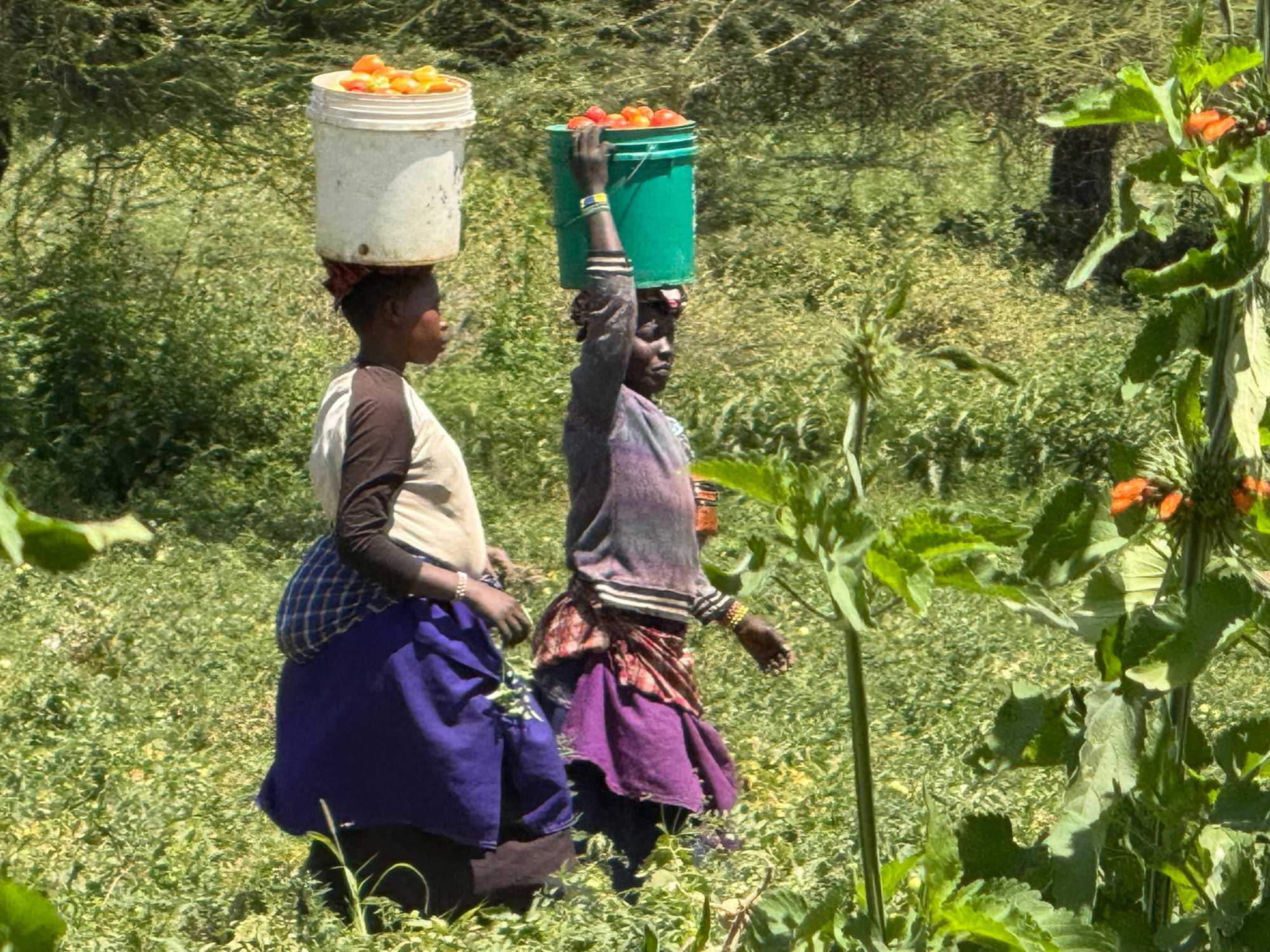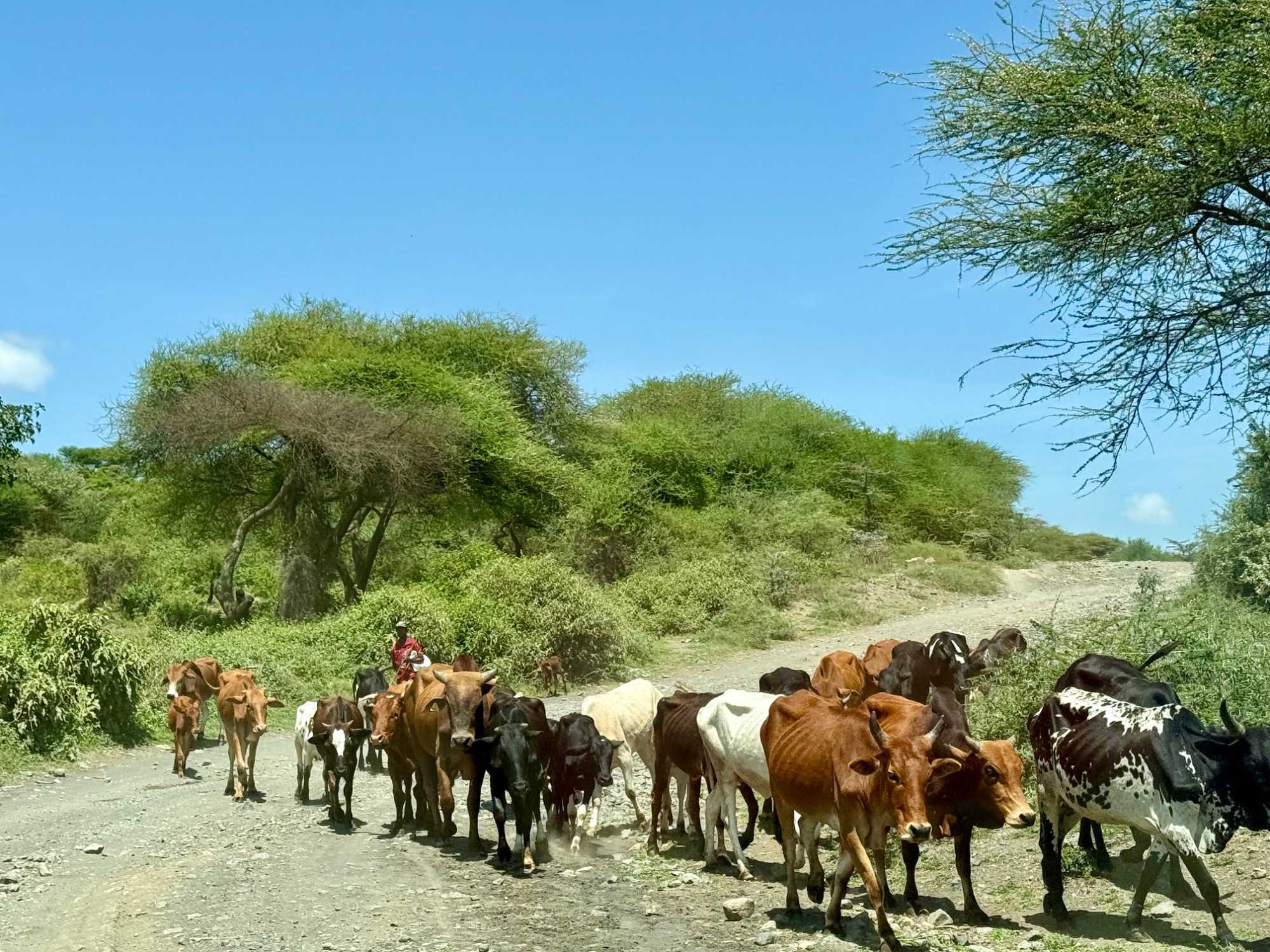En quittant peu à peu les zones plus habitées, nous entrons sur les terres massaï. Sur le bord de la route, nous croisons des Massaïs surveillant leurs troupeaux de chèvres, de vaches et de bœufs. Cette relation étroite avec le bétail fait partie intégrante de leur culture et se transmet de génération en génération. Nous observons aussi des femmes transportant sur leur tête de lourdes charges, parfois des bols remplis de tomates fraîchement récoltées. Une scène qui témoigne d’une grande force, d’une élégance naturelle et d’un mode de vie profondément enraciné dans la tradition.