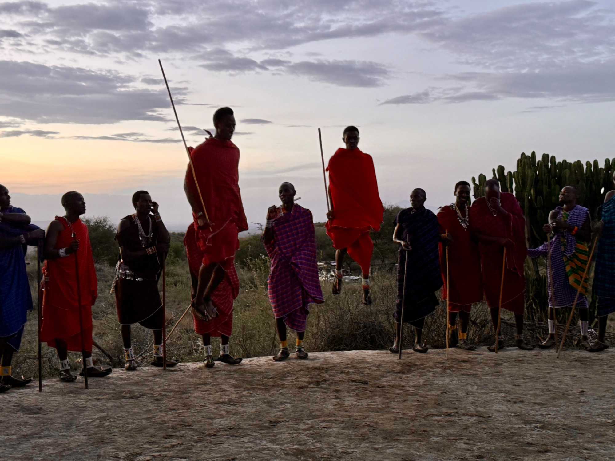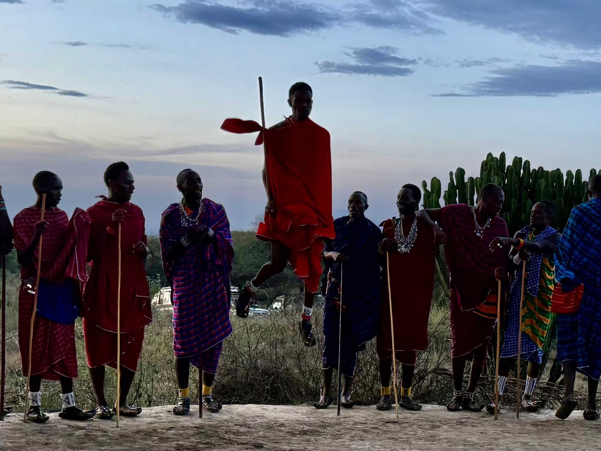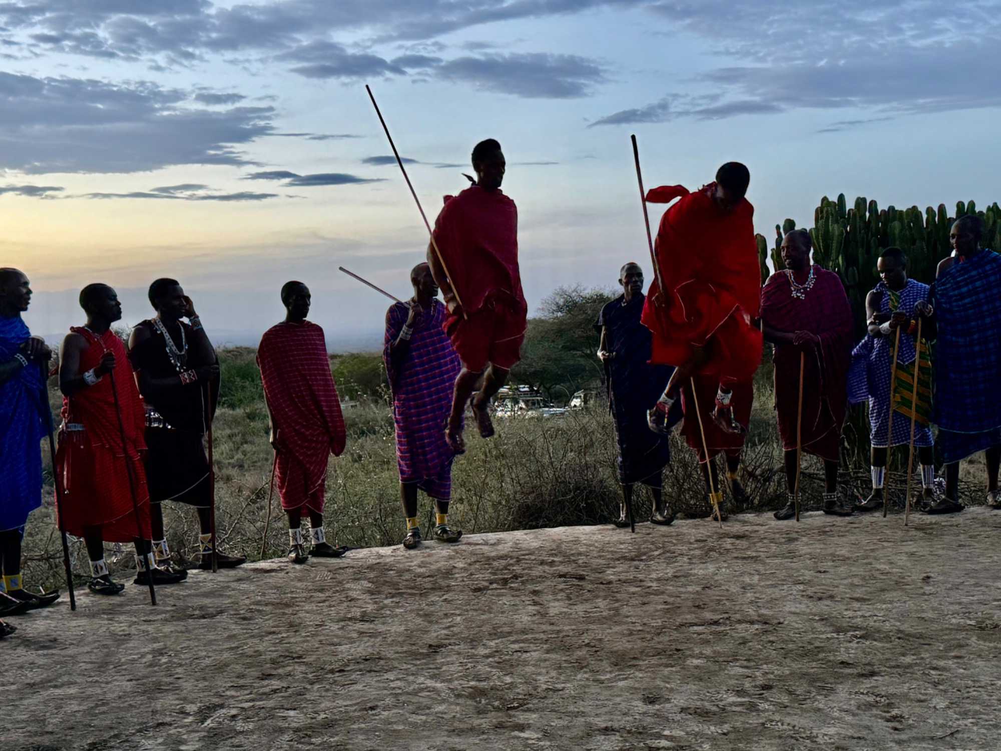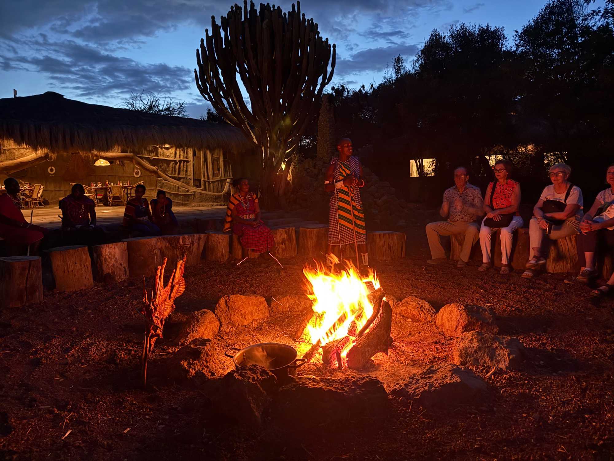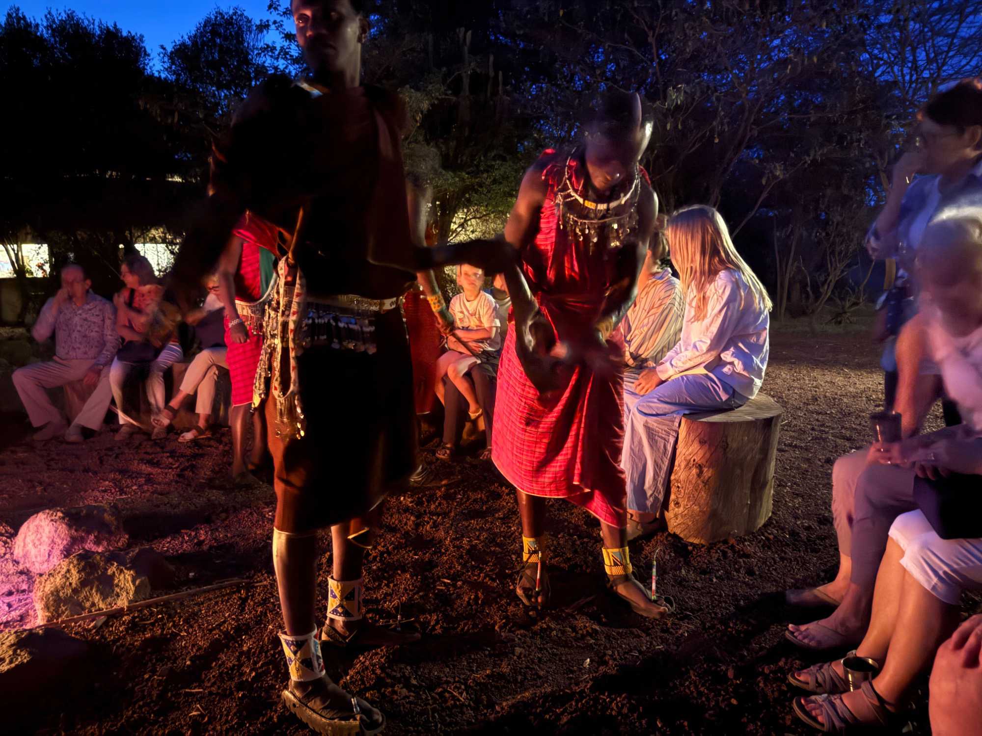 En fin de journée, les festivités commencent au coucher du soleil 🌅. Les danseurs massaï nous offrent une performance impressionnante, ponctuée de leurs fameux sauts spectaculaires, symboles de force et de fierté. J’ai la chance de capturer en photo ces instants où ils semblent littéralement s’élancer vers le ciel. Nous dansons avec eux, partageons des rires, puis nous nous retrouvons autour du feu pour goûter à certaines spécialités locales.
