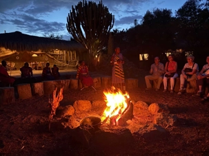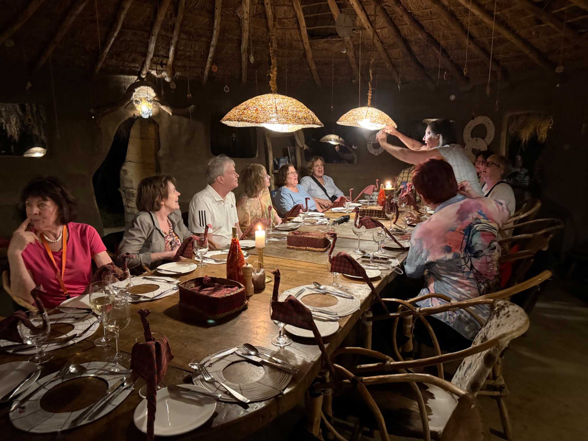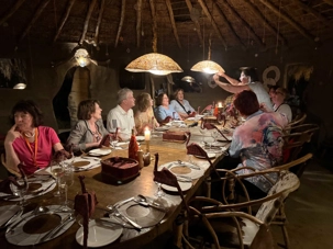 La soirée se poursuit autour d’une belle table, dans une ambiance chaleureuse et conviviale. Le ciel étoilé nous fascine ✨, d’une pureté incroyable. À environ 1 400 mètres d’altitude (près de 5 500 pieds), la température est idéale pour la nuit, autour de 15 degrés. Le jour, avec le soleil, elle atteindra facilement les 28 à 30 degrés, mais pour ce soir, la fraîcheur est parfaite.
