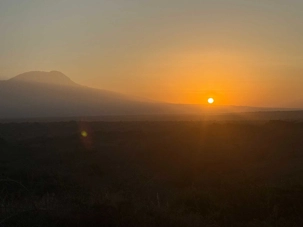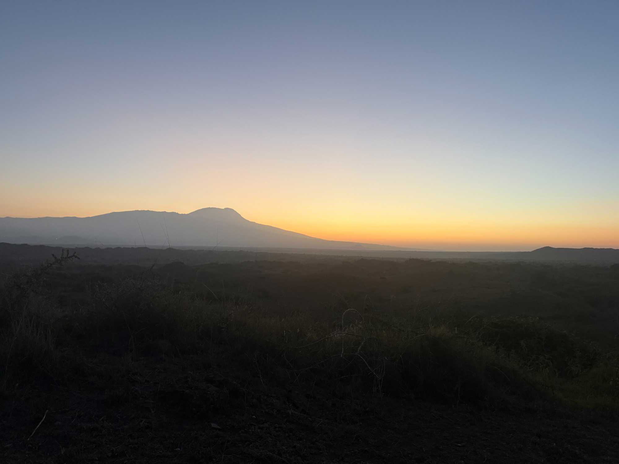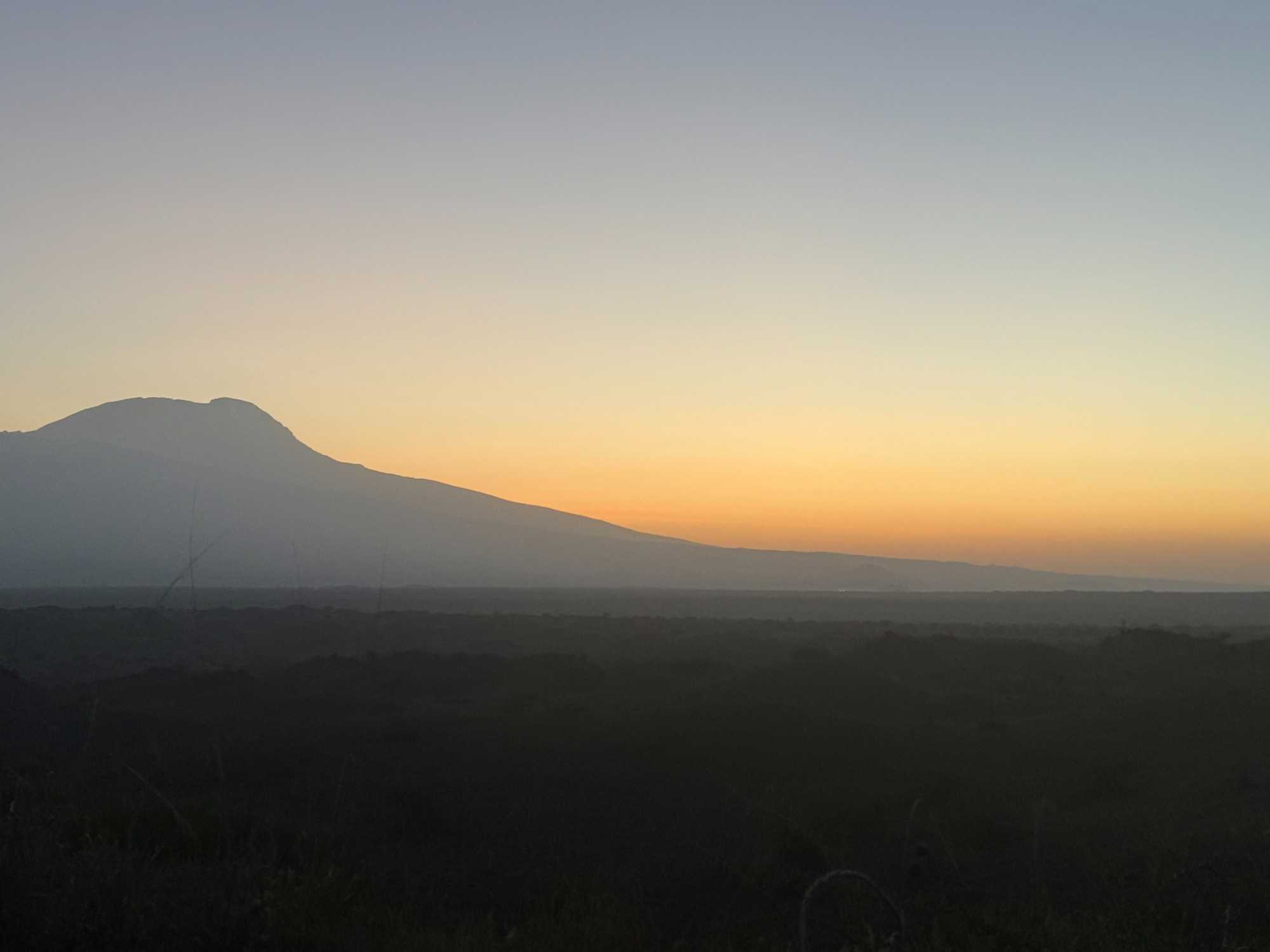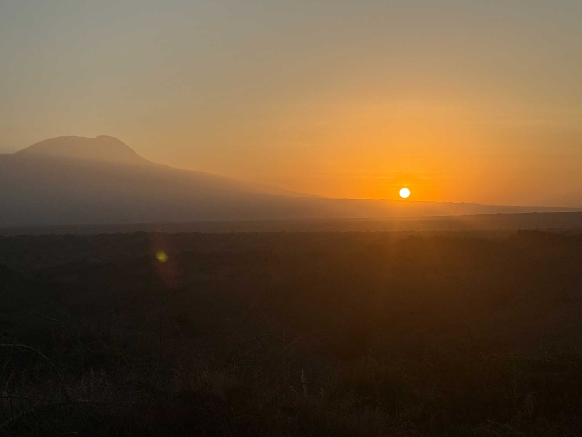 Vers 6 h, le soleil commence doucement à se lever. Les premières lueurs caressent la savane, puis viennent illuminer progressivement la silhouette majestueuse du Kilimandjaro. Les couleurs passent du bleu profond aux teintes rosées, puis dorées. Nous restons là, silencieux, émerveillés. Il y a des moments qu’on ne peut pas presser. Celui-ci en fait partie.