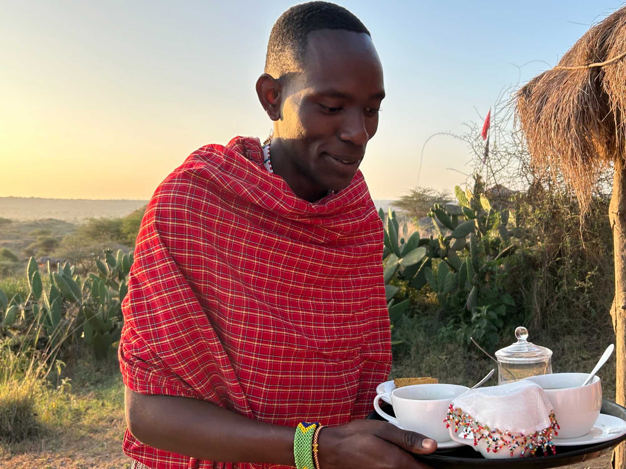 Notre contemplation est agrémentée par la présence de Yohana, notre Massaï préféré, qui vient nous rejoindre avec son éternel sourire. Il s’installe près de nous et nous parle de sa vie, de ses déplacements, de son quotidien. Il nous apporte du café chaud ☕, un geste simple mais tellement précieux.