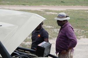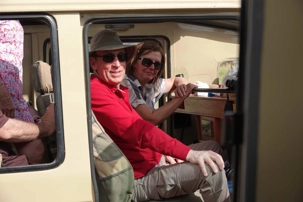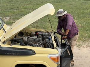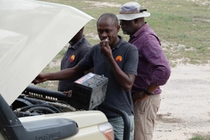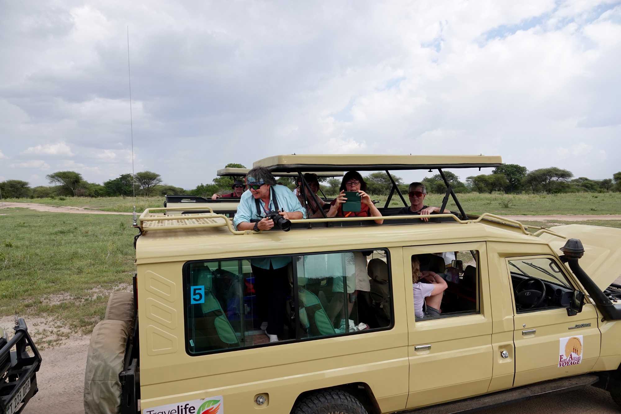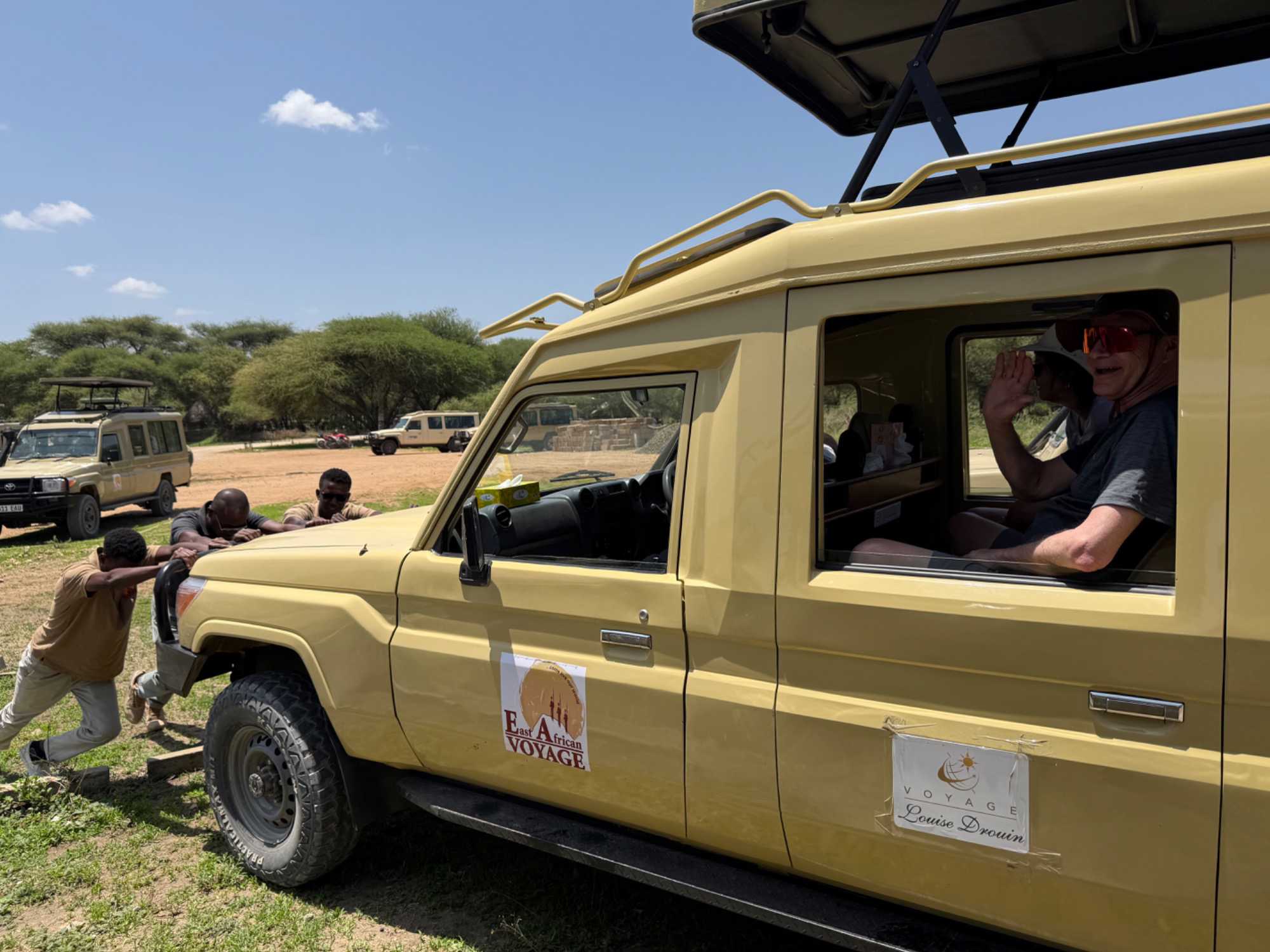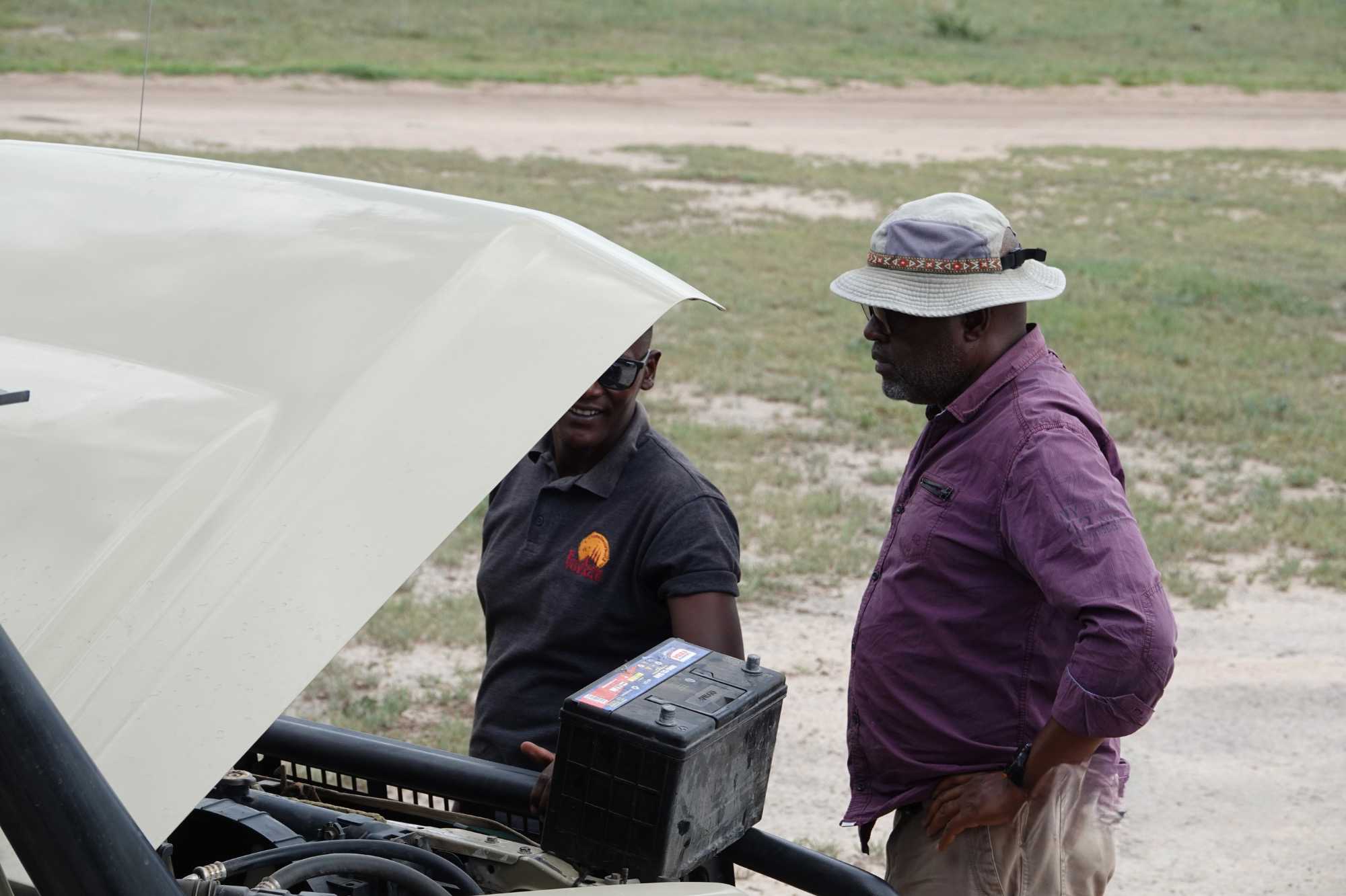 Puis survient une petite aventure : l’une de nos Jeeps a une panne de batterie. Rien de grave, mais il faut intervenir. Les cinq véhicules s’immobilisent à un endroit stratégique pendant que nos chauffeurs-guides, toujours solidaires et efficaces, travaillent ensemble pour résoudre le problème.