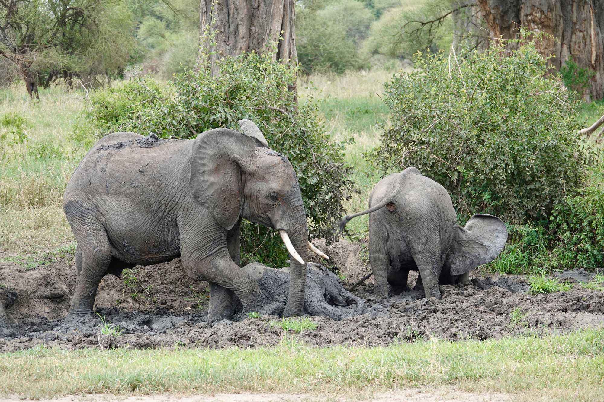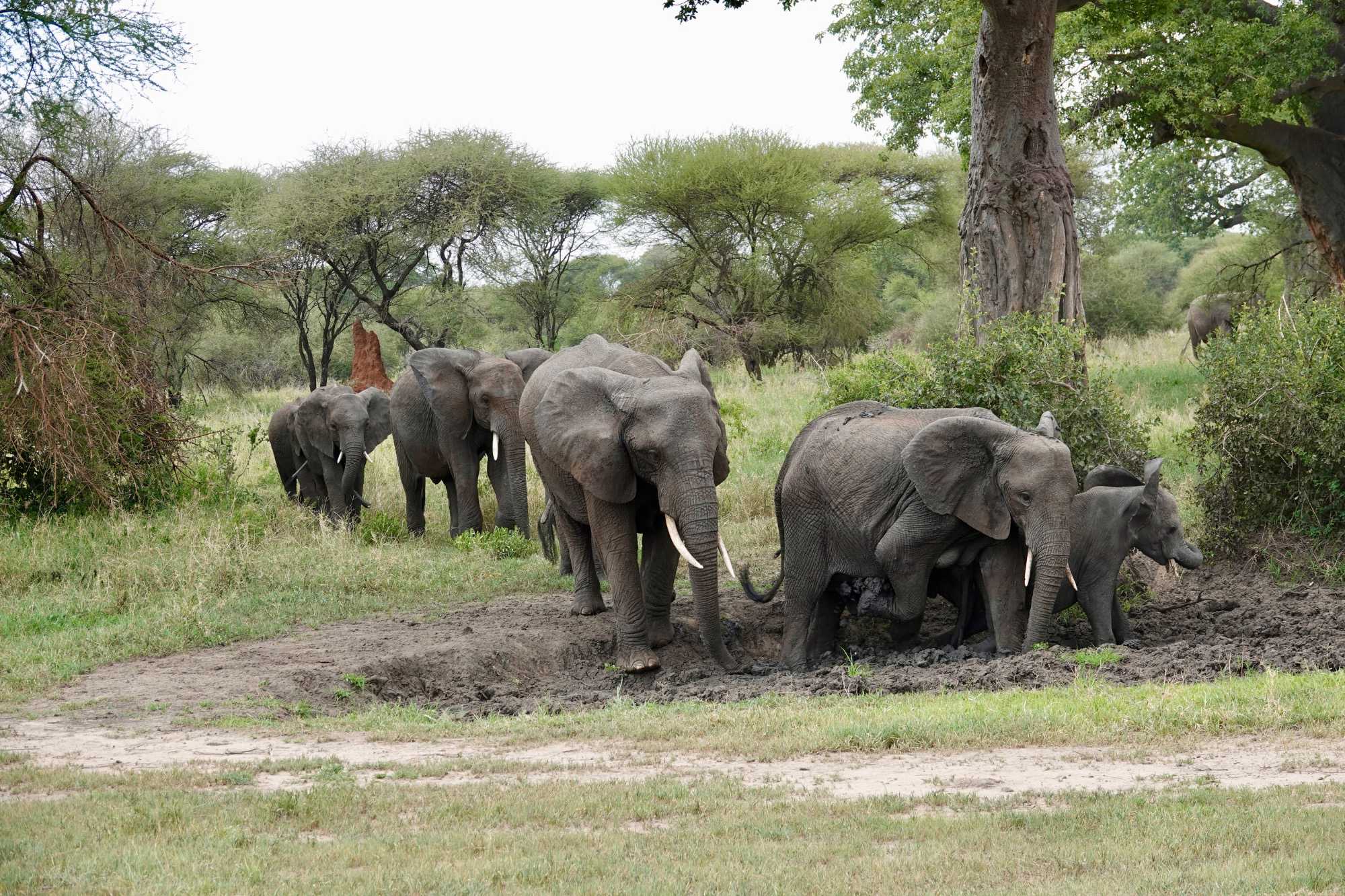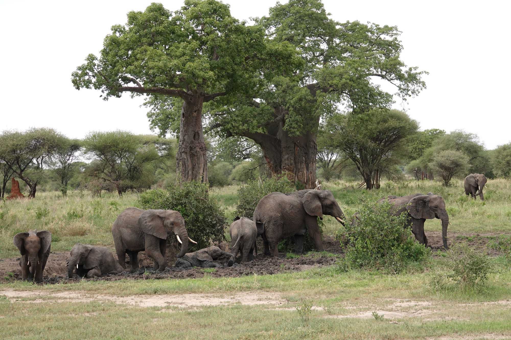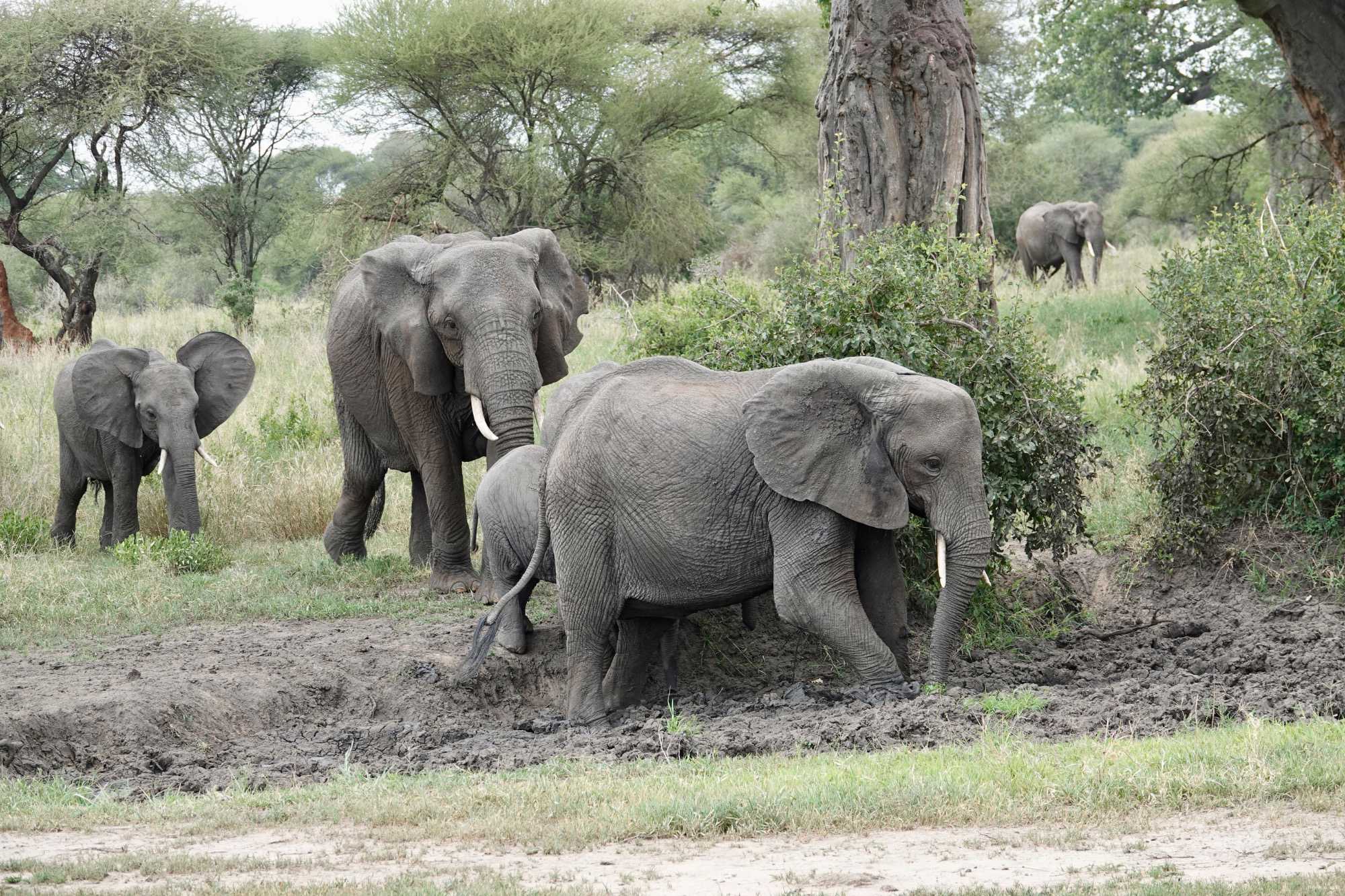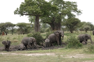 Ceux que nous cherchions toute la journée arrivent tranquillement, majestueusement. Ils s’approchent de nos Jeeps, de plus en plus près, jusqu’à s’arrêter à quelques mètres seulement. Puis, comme si nous n’existions pas, ils commencent à s’amuser dans un bain de boue, à se rafraîchir, à jouer.