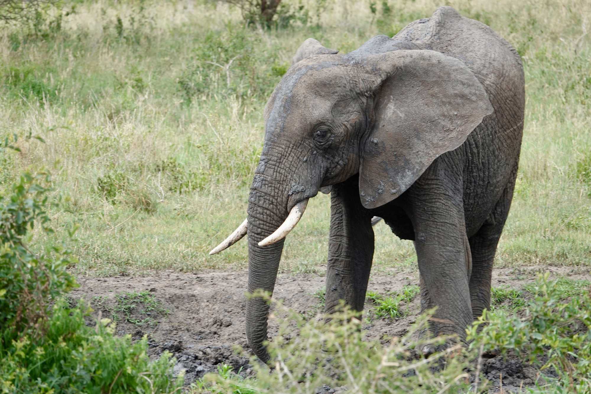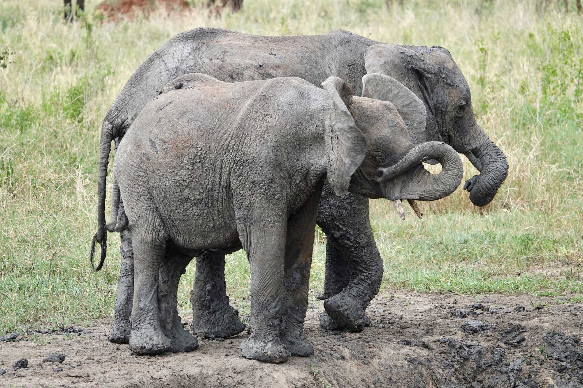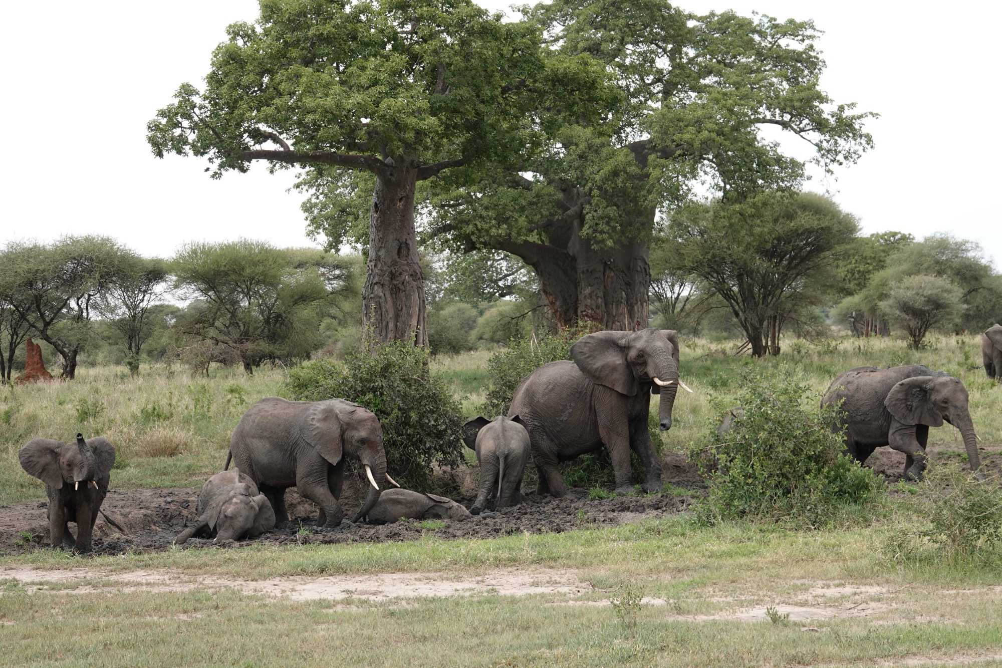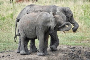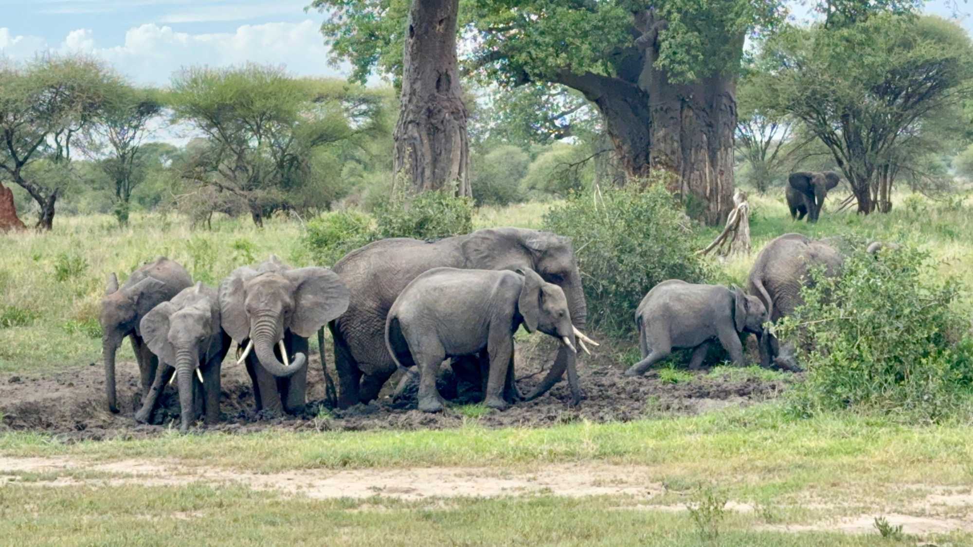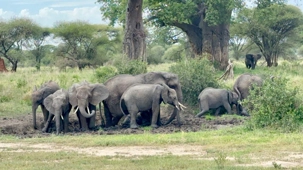 Ceux que nous cherchions toute la journée arrivent tranquillement, majestueusement. Ils s’approchent de nos Jeeps, de plus en plus près, jusqu’à s’arrêter à quelques mètres seulement. Puis, comme si nous n’existions pas, ils commencent à s’amuser dans un bain de boue, à se rafraîchir, à jouer.