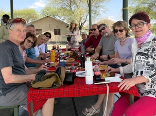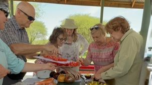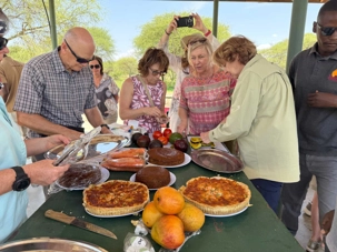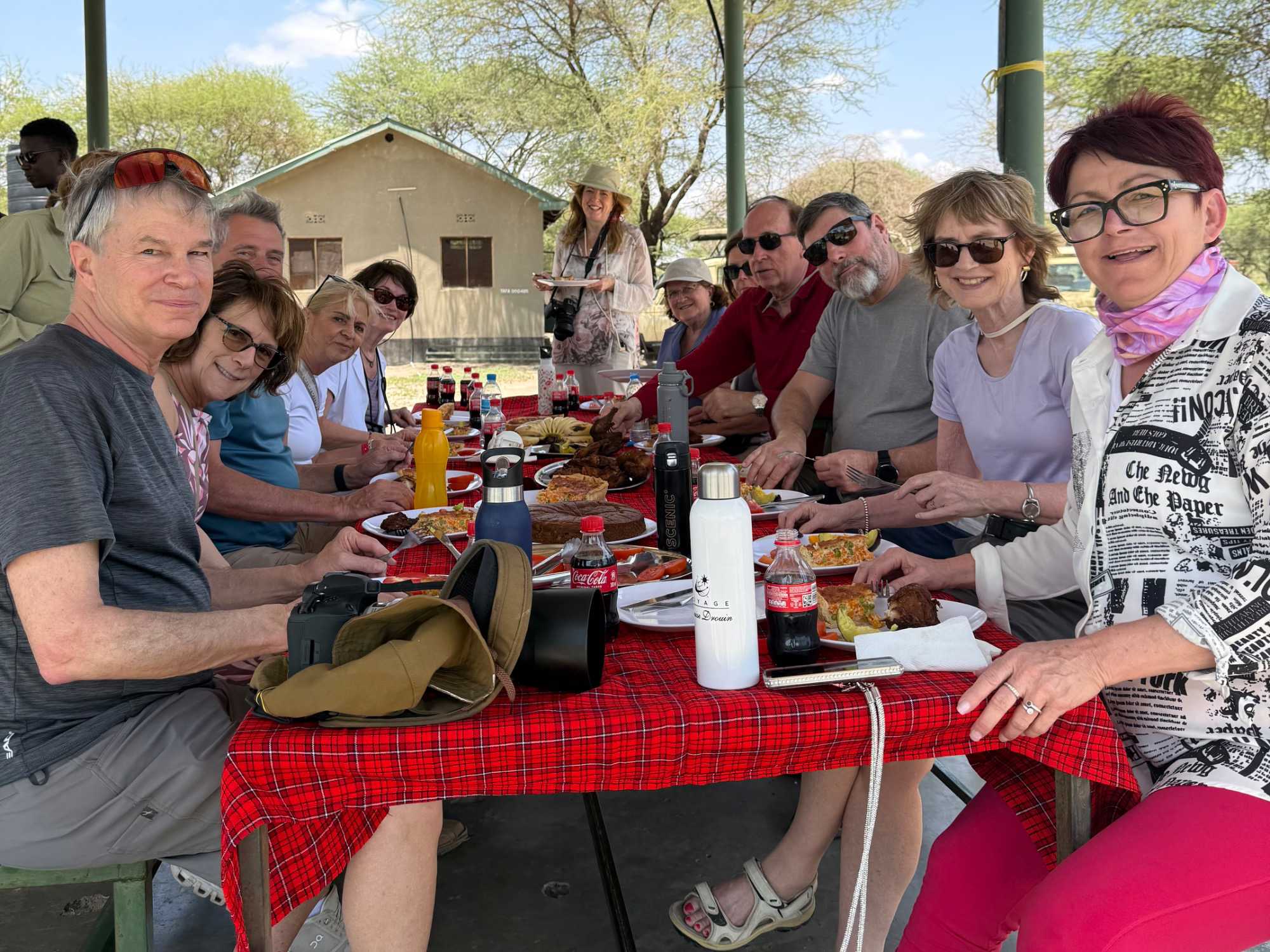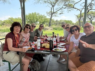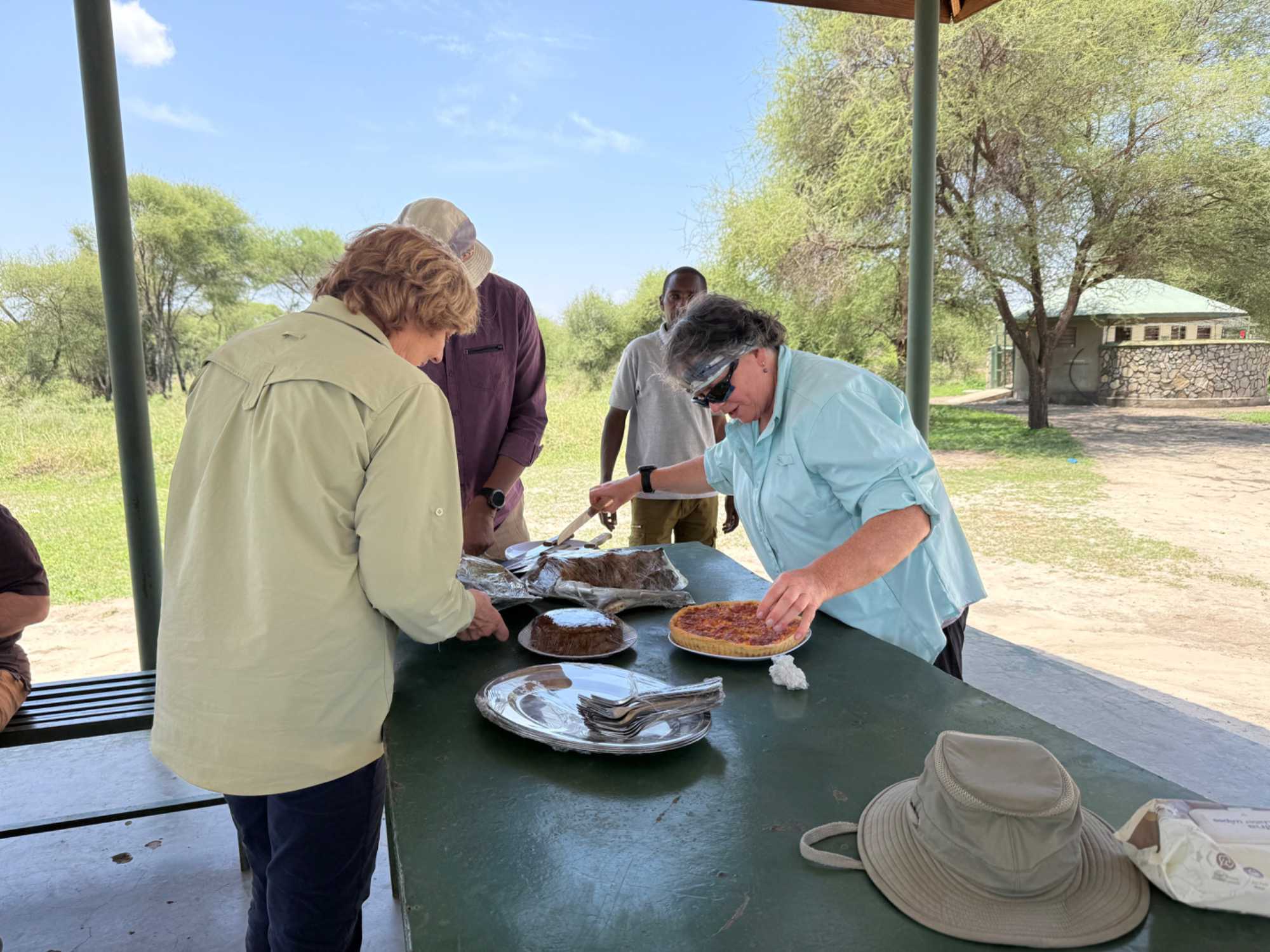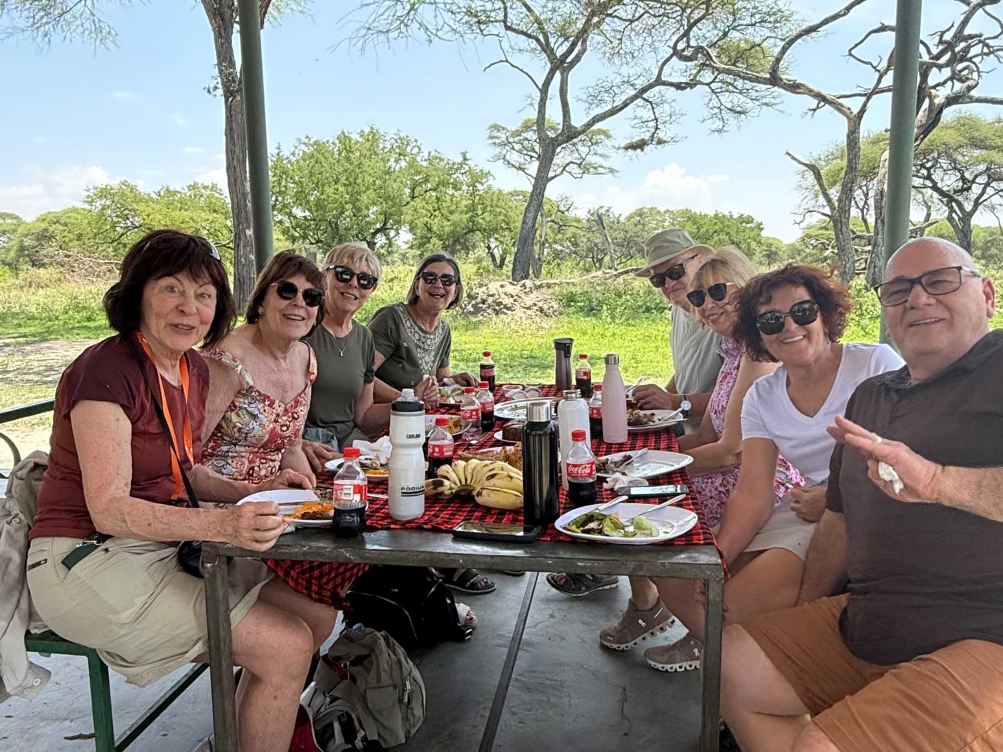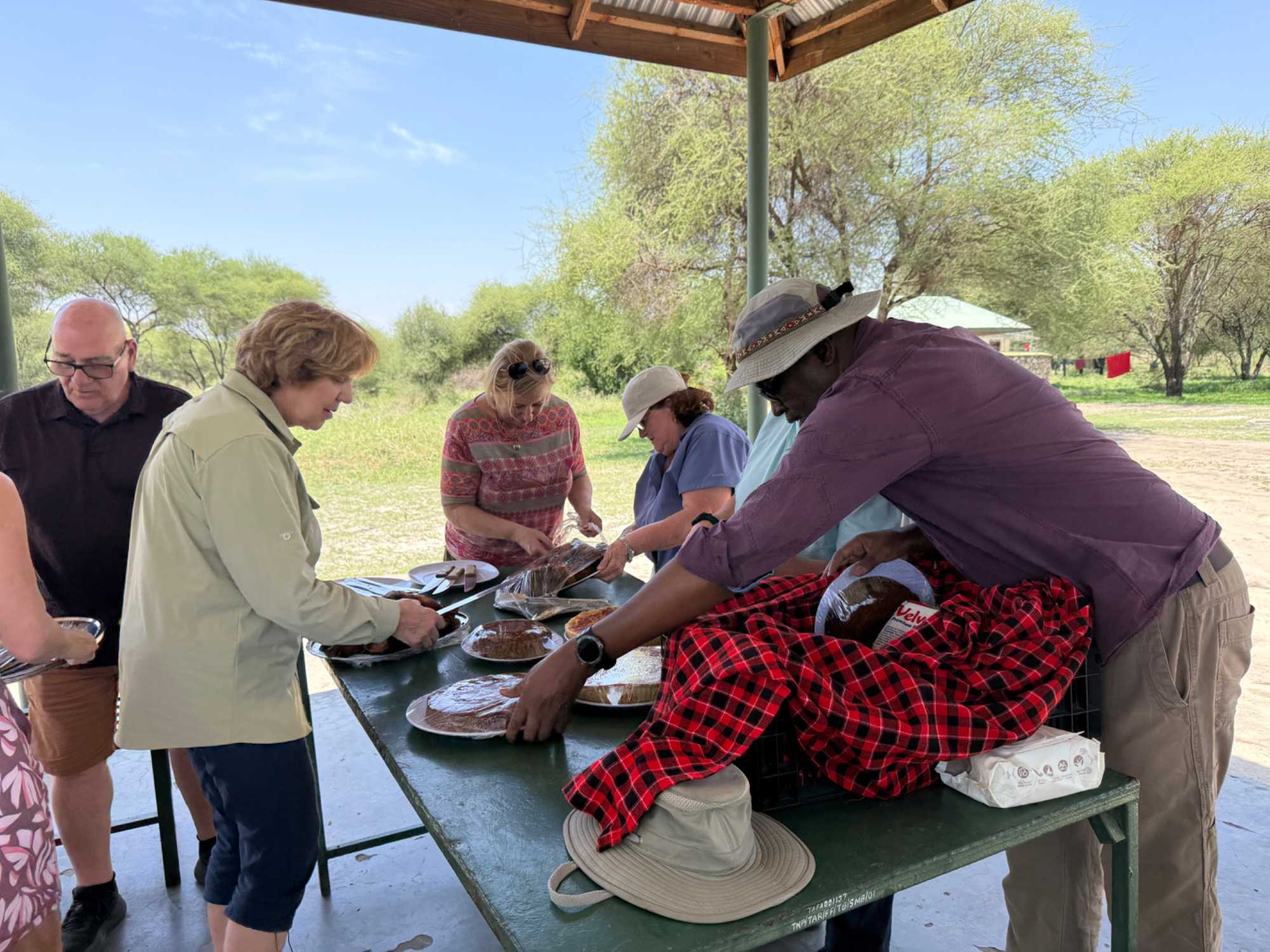 Avant de poursuivre notre exploration plus en profondeur, nous faisons un arrêt pour notre pique-nique. Notre équipe de guides nous a préparé un magnifique repas partagé. À l’ombre, dans un espace aménagé du parc, nous sortons quiches, poulet, gâteaux aux bananes, fruits frais, légumes croquants. Plusieurs voyageurs participent avec enthousiasme : on coupe les légumes, on pèle les fruits, on partage. Une belle brise nous accompagne. Ce moment simple devient un moment précieux 🌿.