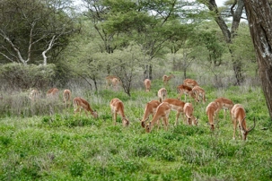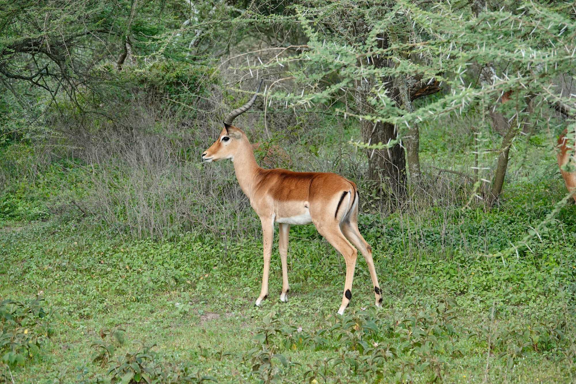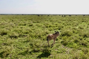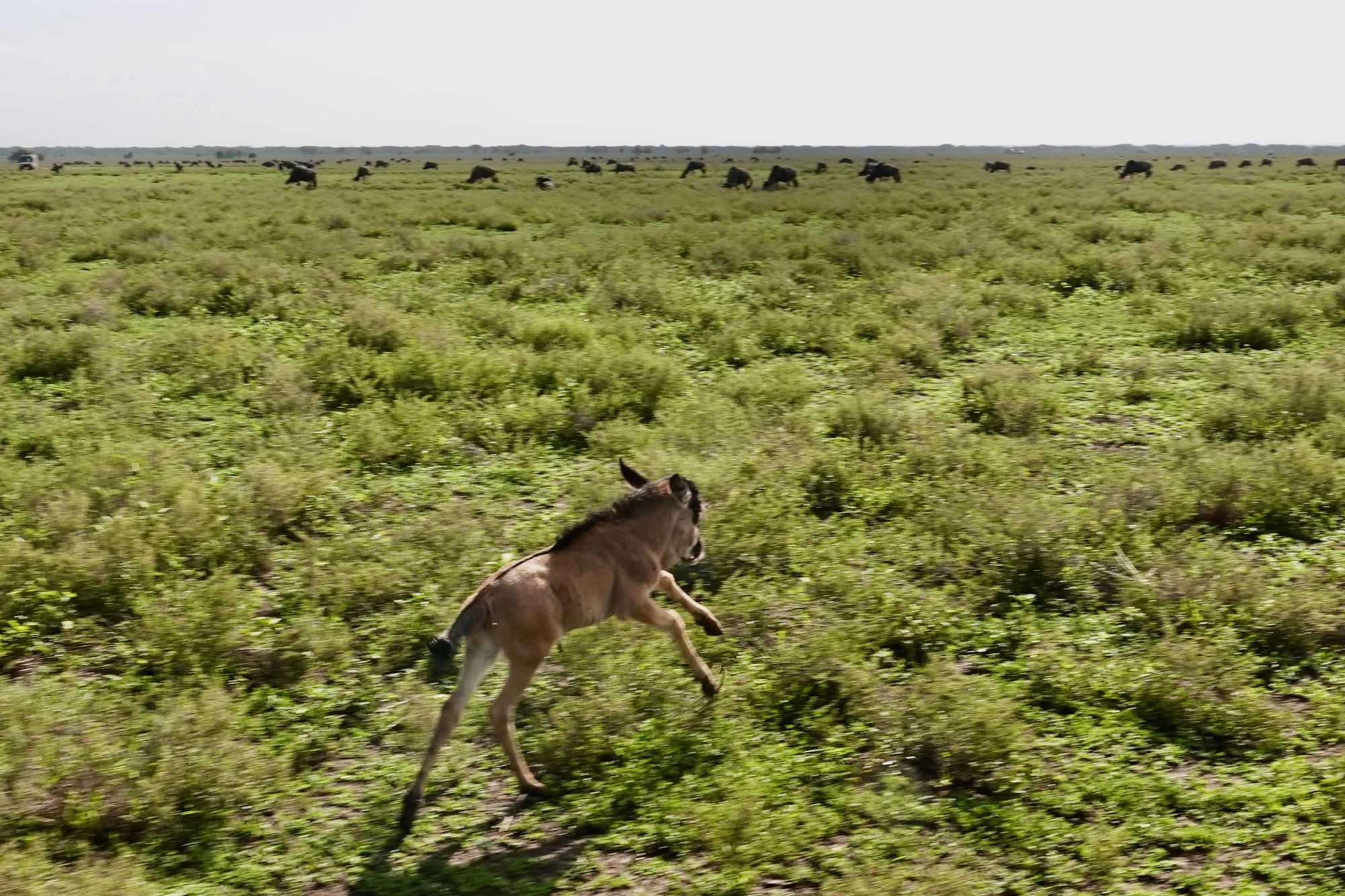 Ce matin-là, après avoir vécu l’émotion de notre premier léopard, une scène aussi inattendue que bouleversante nous attendait. En traversant une grande plaine où les animaux apparaissaient encore au loin, nous avons aperçu un tout petit bébé gnou, âgé de quelques semaines à peine. À notre grande surprise, dès qu’il a vu la Jeep, il s’est dirigé vers nous en se lamentant doucement, comme s’il cherchait de l’aide. La scène nous a profondément touchés. Mandela nous a expliqué que cela arrive parfois lorsque le troupeau se déplace rapidement : un petit peut perdre la trace de sa mère, qu’il reconnaît principalement par l’odeur. Impossible pour nous de repartir en le laissant seul. Sans pouvoir l’embarquer, nous avons décidé d’avancer lentement afin qu’il nous suive en direction du troupeau aperçu au loin. Le petit s’est mis à courir derrière la Jeep, accélérant à mesure que nous progressions. Nous nous sommes approchés prudemment, sans affoler les gnous, et avons vu le bébé galoper vers le groupe. Nous ne connaissons pas la suite de son histoire, mais nous aimons croire qu’il a pu retrouver sa mère – ou qu’une autre femelle l’aura accueilli. Pour nous, ce fut un véritable petit sauvetage, un moment infiniment touchant qui a marqué notre safari du matin.