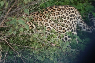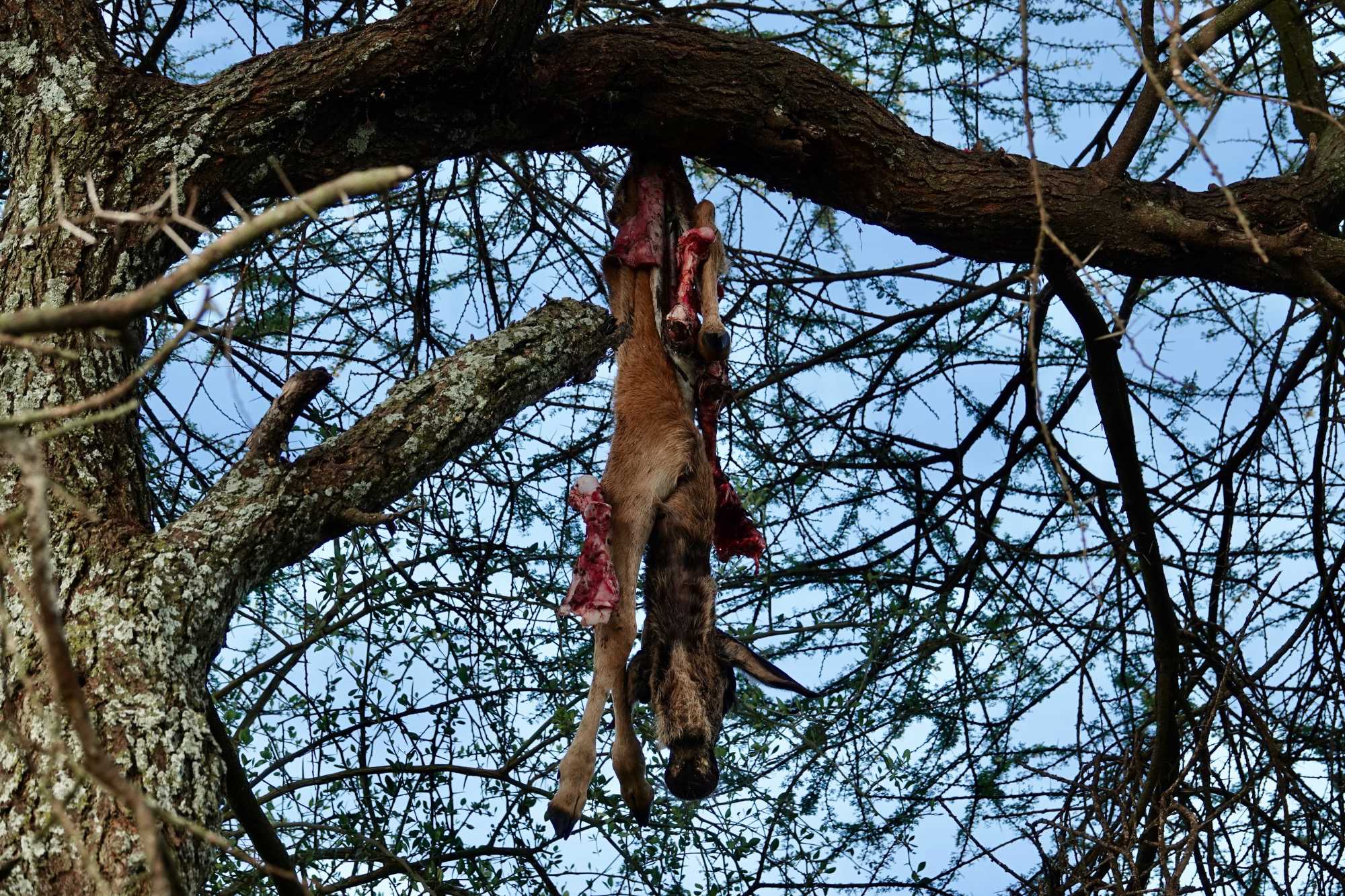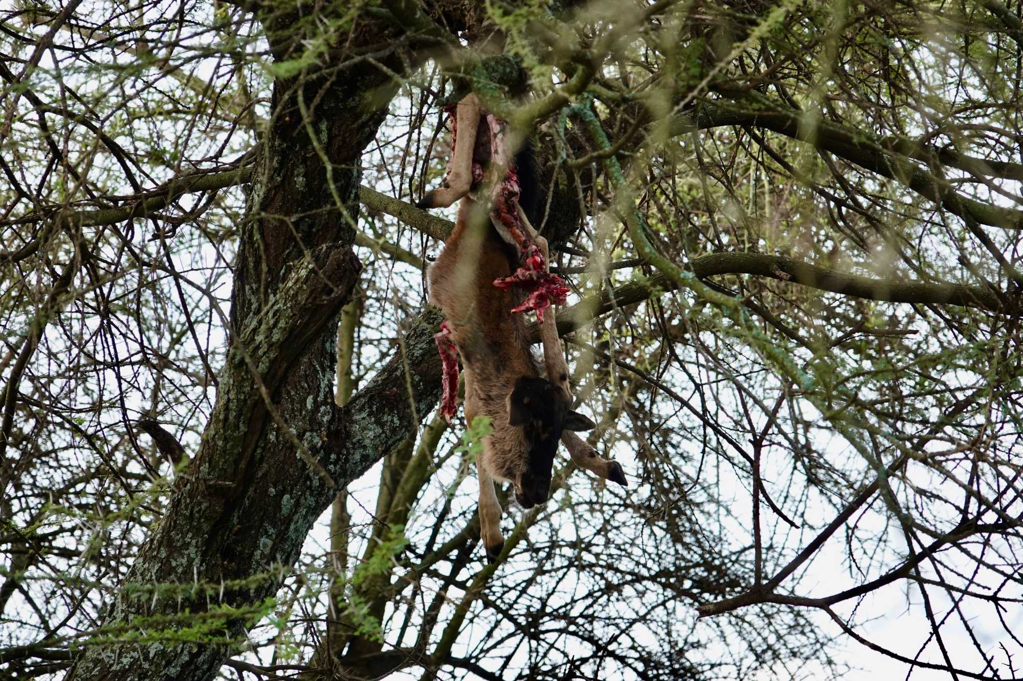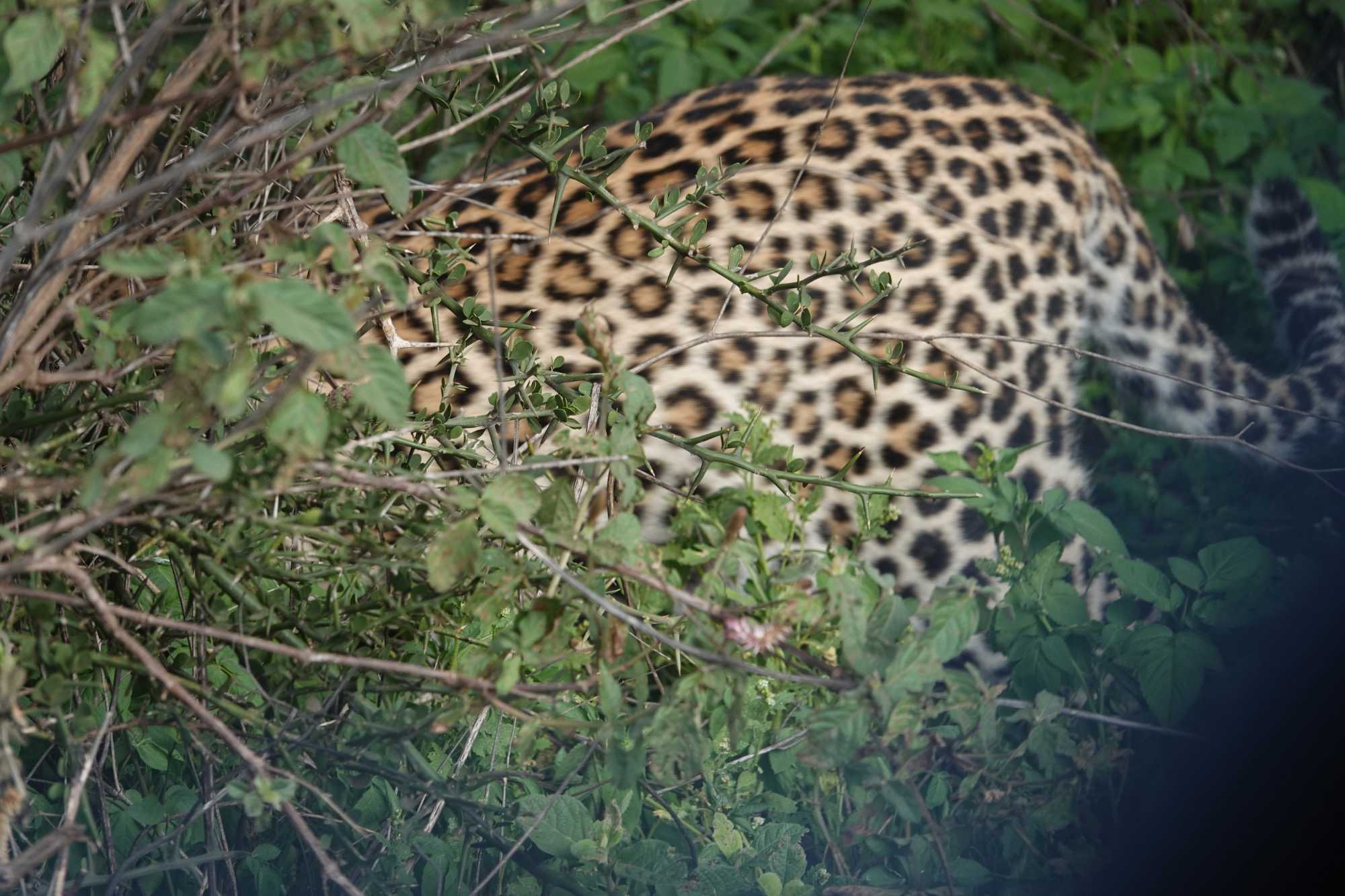 À peine engagés dans notre exploration, nous apercevons un léopard perché dans un arbre. Comme toujours, le félin est bien installé en hauteur, partiellement dissimulé par le feuillage, avec une proie suspendue à ses côtés. Photographier un léopard dans ces conditions n’est jamais simple : les branches, la hauteur, l’angle… mais peu importe. L’essentiel est d’être témoin de cette scène. Admirer ce magnifique félin dans son habitat naturel est un privilège.