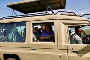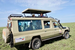 Nous assistons justement à une scène intéressante : une Jeep appartenant à un autre groupe s’est embourbée. Nos guides, toujours solidaires et professionnels, s’arrêtent immédiatement pour offrir leur aide. Nous observons le savoir-faire, la coordination, la patience nécessaire pour sortir un véhicule enlisé dans la boue. C’est aussi ça, la vie en safari : entraide et camaraderie entre chauffeurs.