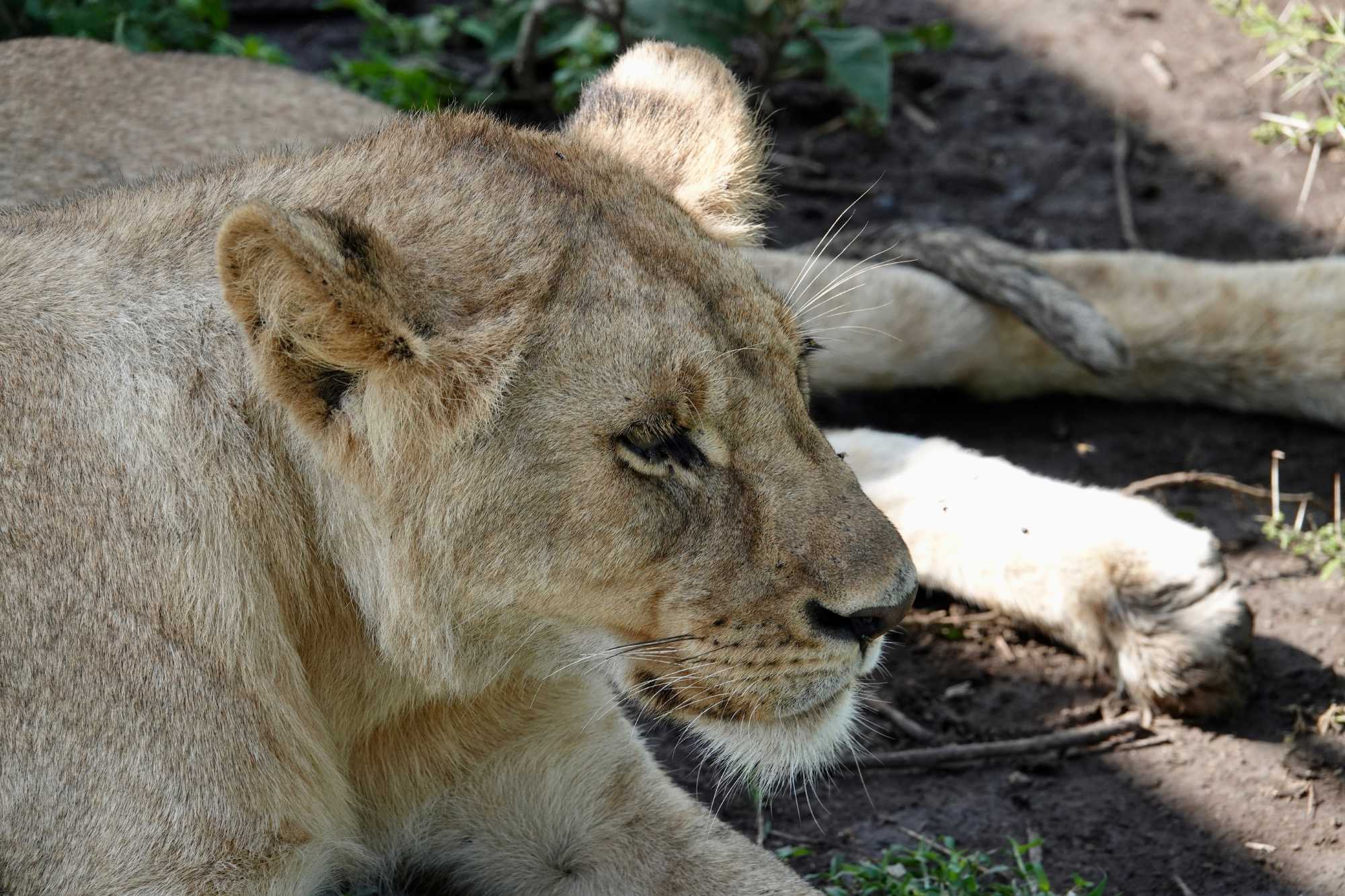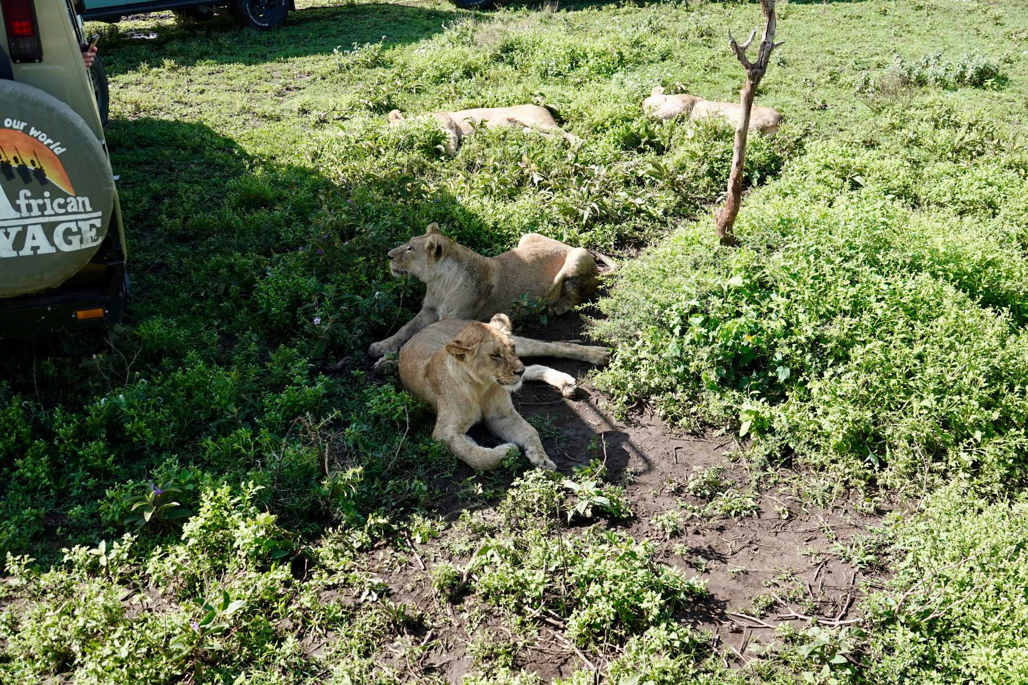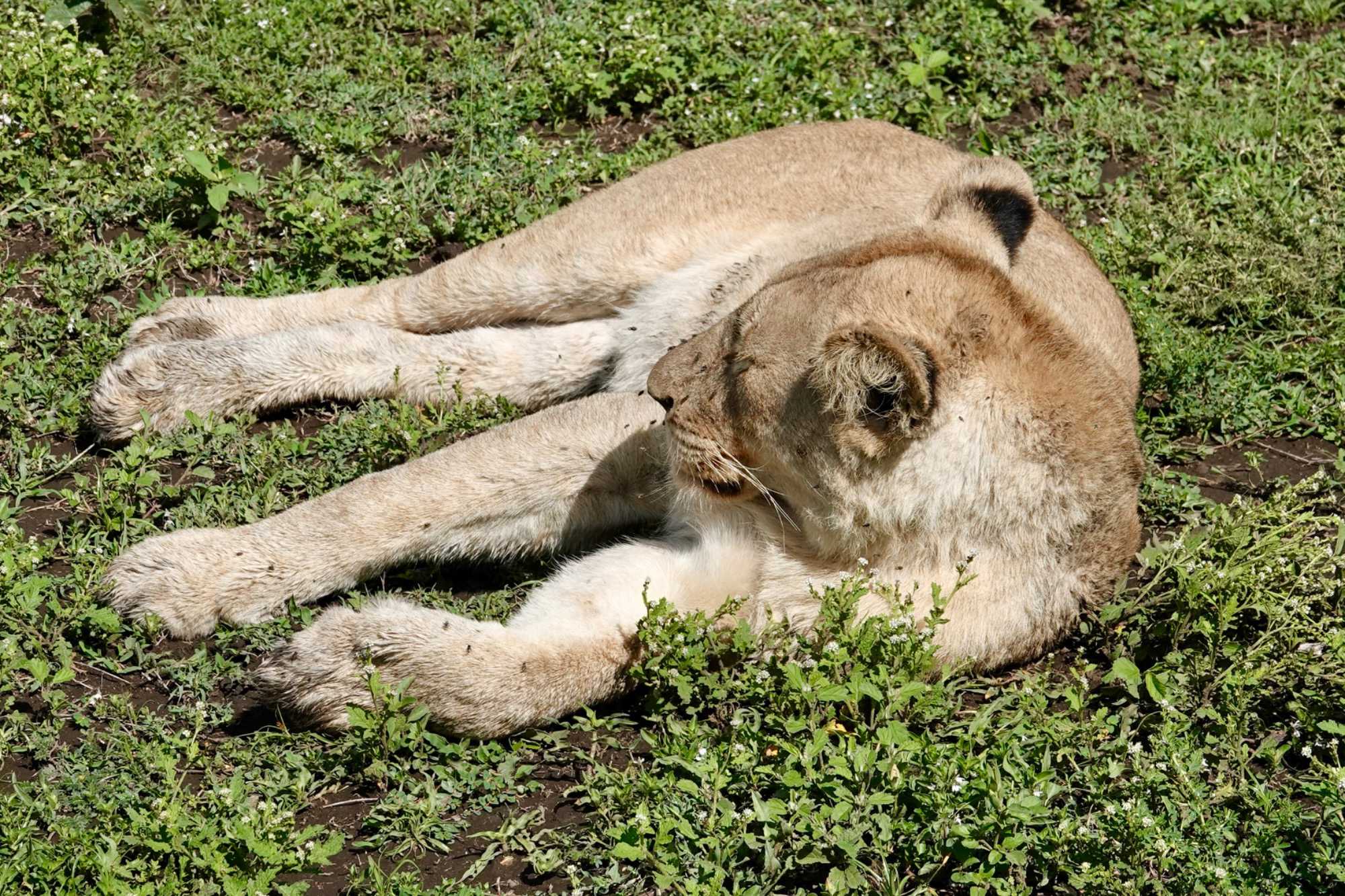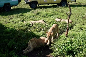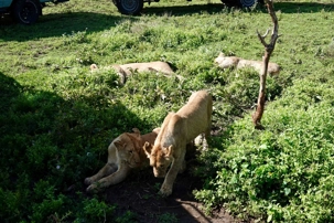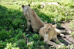 Nous avons poursuivi notre route et, une fois de plus, la chance était de notre côté. Nous sommes tombés sur un groupe de quatre lionnes, paisiblement étendues dans la savane. À notre arrivée, trois d’entre elles se trouvaient déjà réunies, s’étirant langoureusement, se prélassant au soleil et profitant d’un moment de repos bien mérité, tandis qu’une quatrième se tenait légèrement à l’écart. Après quelques instants, celle-ci a décidé de rejoindre les autres pour se coucher près d’elles et s’étirer à son tour. Nous avons eu tout le loisir de les admirer : elles étaient magnifiques, offrant des images saisissantes de grâce et de puissance. En les observant, je ne peux m’empêcher de penser à nos chats à la maison — je pense souvent aux miens — car malgré leur taille impressionnante, ces grands félins ont les mêmes petits gestes familiers : la façon de se rouler, de jouer, de s’étirer ou d’échanger un regard complice. C’est toujours fascinant de reconnaître, chez ces majestueuses lionnes, les attitudes si semblables à celles de nos félins domestiques.