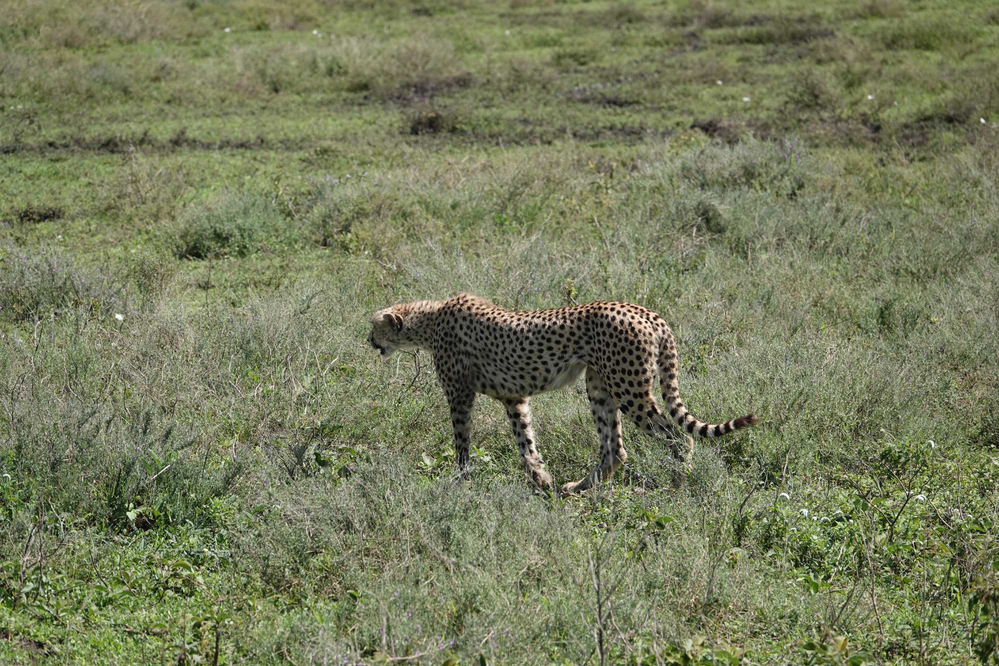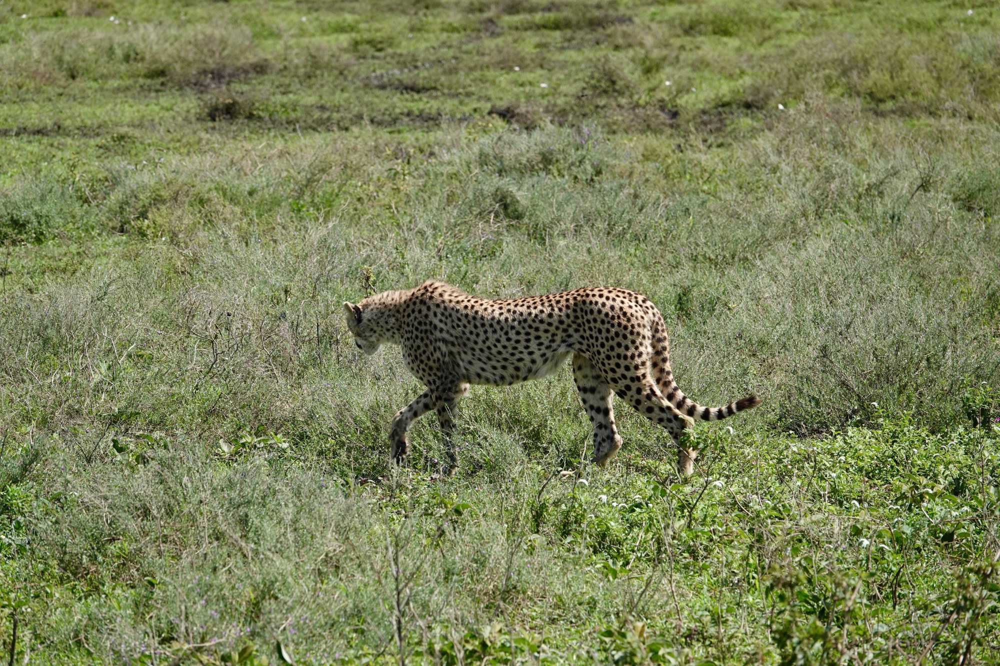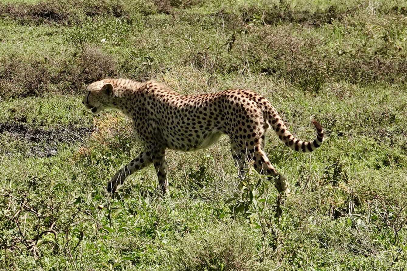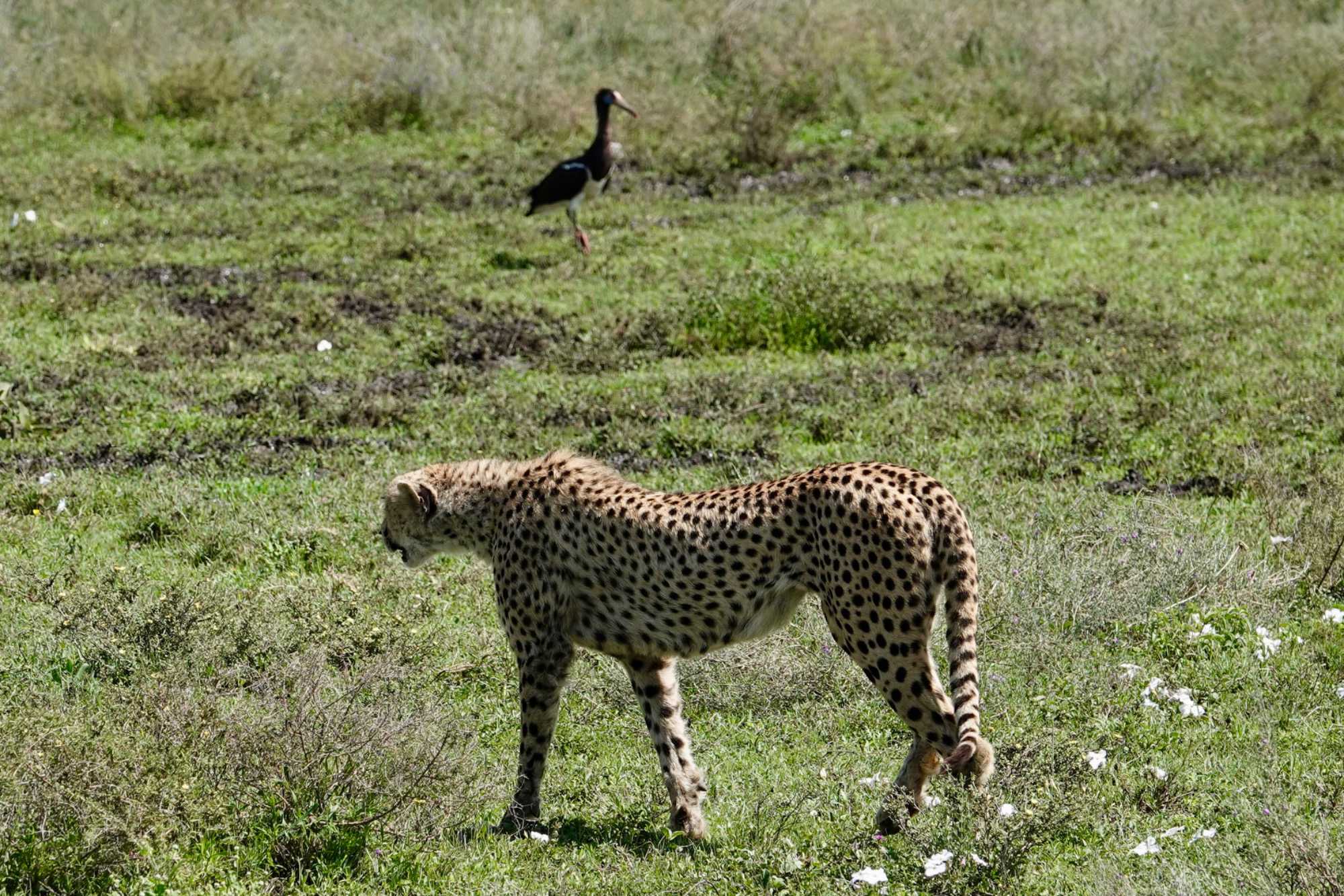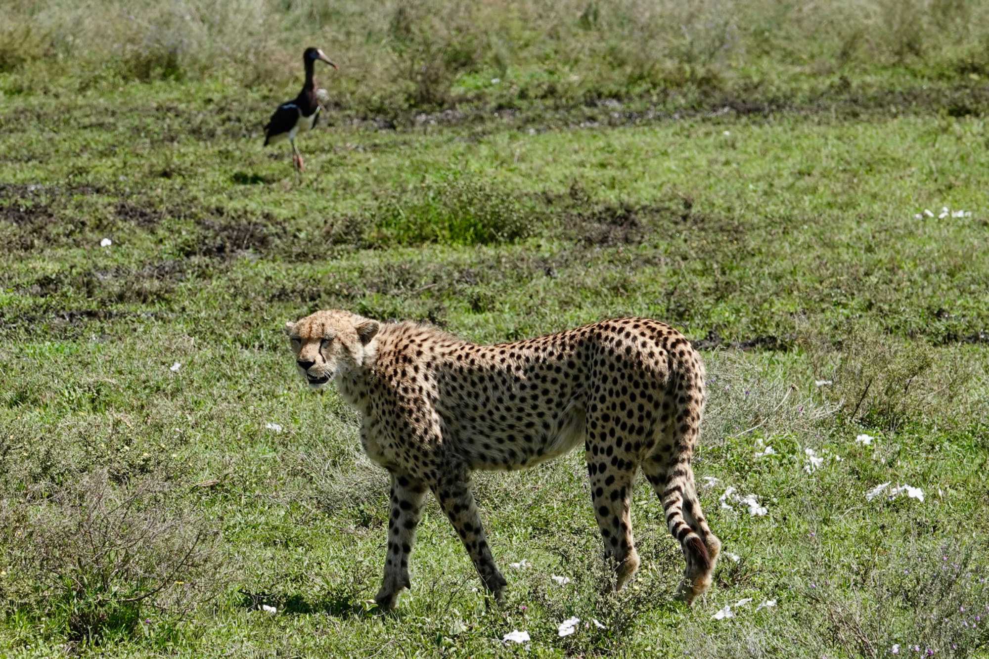 Nous poursuivons notre route et retrouvons zèbres, girafes et autres herbivores qui parsèment la savane. Puis un autre moment fort : un guépard. Élancé, gracieux, avec cette démarche si particulière qui le distingue des autres félins. Les appareils photo crépitent encore une fois.