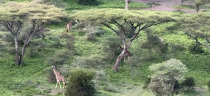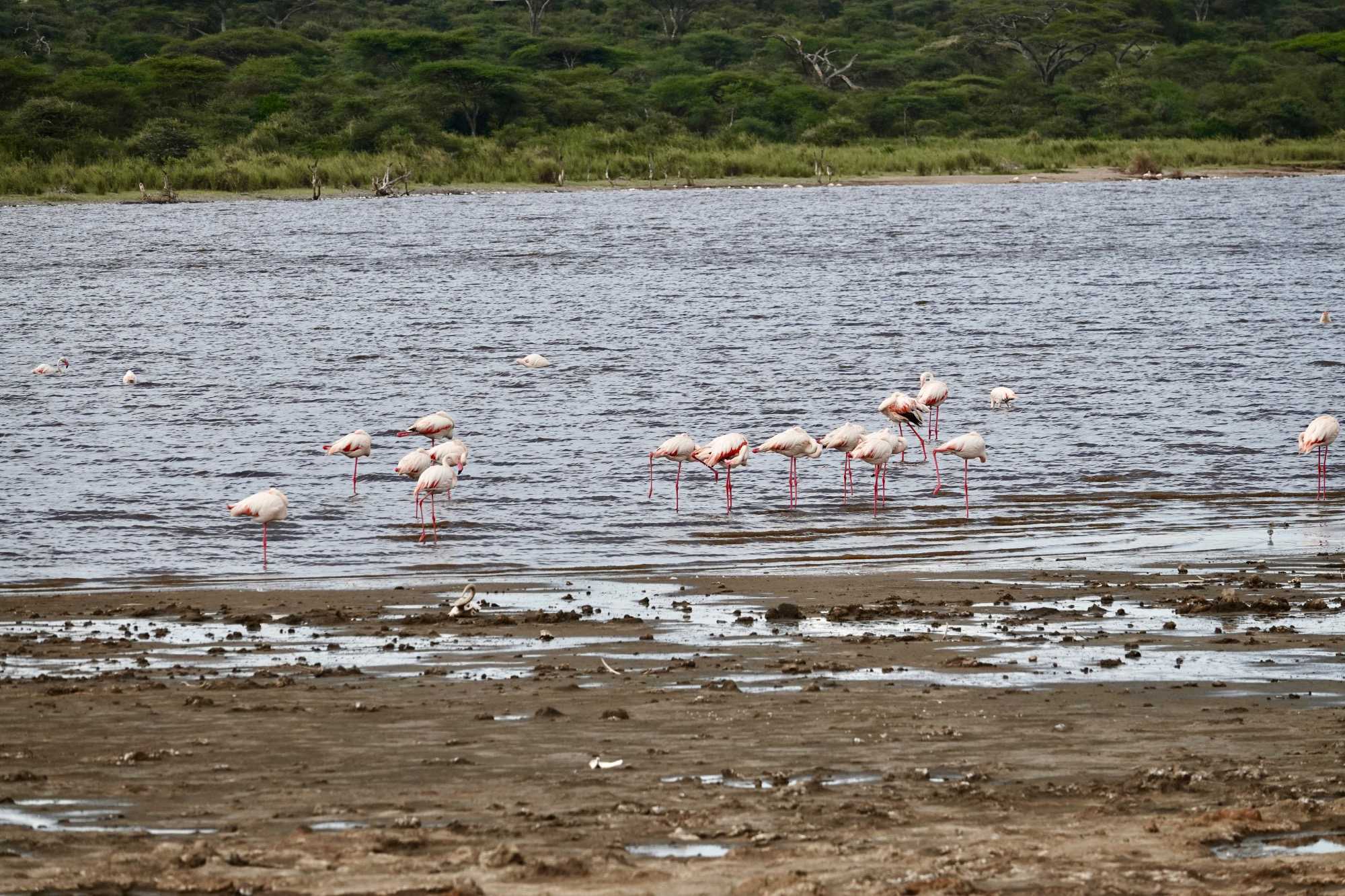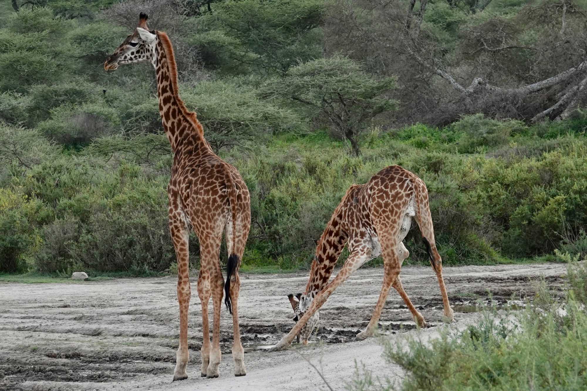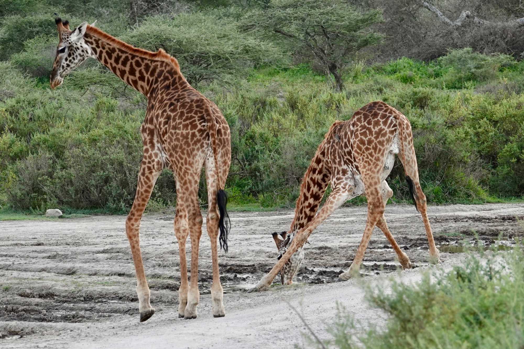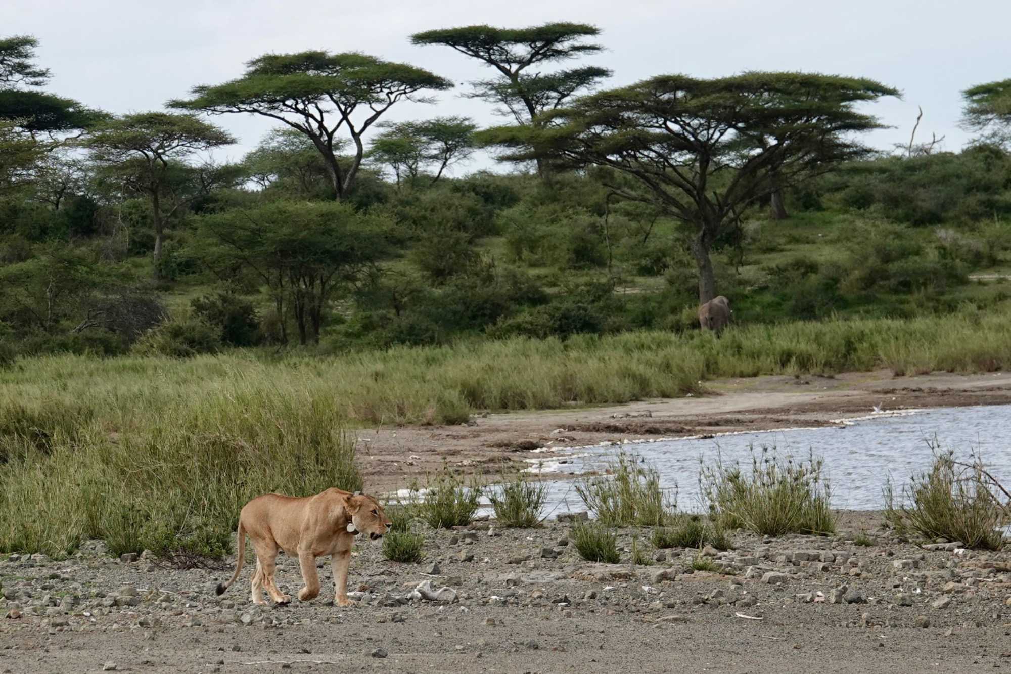 À peine avions-nous quitté notre lodge que nous retrouvions les charmantes gazelles de Thomson, présentes en grand nombre dans la savane. Puis, près d’un point d’eau, un spectacle enchanteur nous attendait : de magnifiques flamants roses, certains au repos, d’autres déployant leurs ailes dans une élégance parfaite. Un peu plus loin, un groupe d’hippopotames se prélassait dans l’eau, où ils passent une bonne partie de la journée pour se protéger du soleil avant de sortir, à la tombée de la nuit, pour brouter. Quelques-uns nous ont même dévoilé leur impressionnante mâchoire. Nous avons ensuite aperçu une lionne solitaire longeant le plan d’eau, nous offrant de superbes photos, avant de croiser plusieurs girafes s’alimentant paisiblement. L’une d’elles nous a permis d’observer la délicate manœuvre pour boire : un mouvement spectaculaire et vulnérable, pendant qu’une autre montait la garde. Un magnifique enchaînement de scènes sauvages, comme autant de clins d’œil de la nature. Nous rencontrons alors un troupeau d’éléphants que nous n’avions pas encore vus dans cette région. Ils marchent librement, paisiblement, dans cette lumière spectaculaire. Des girafes se dessinent en arrière-plan, majestueuses. Les scènes sont dignes d’une carte postale.