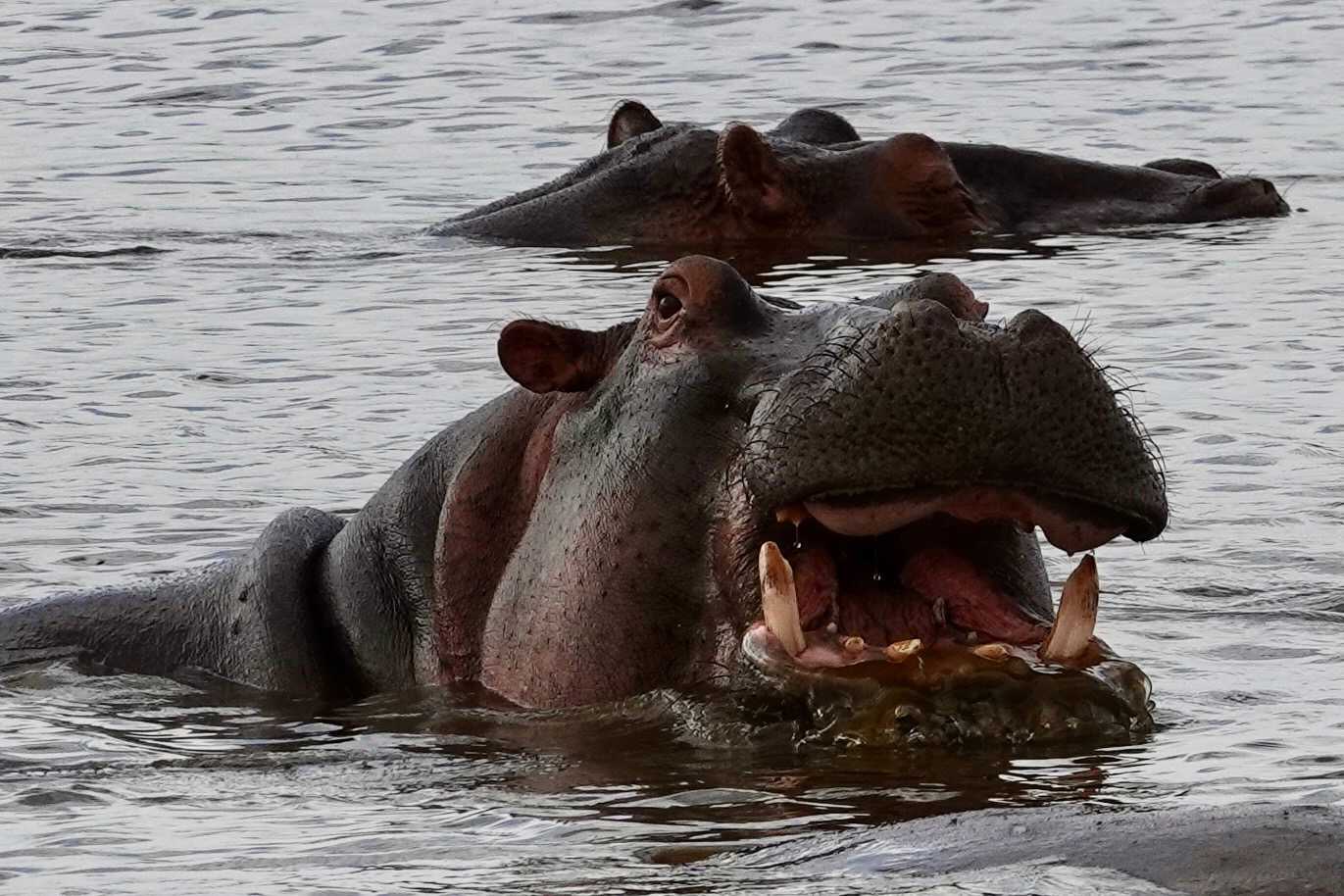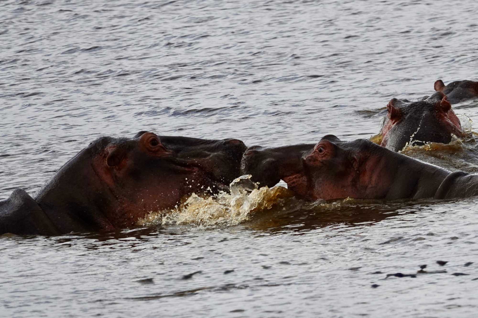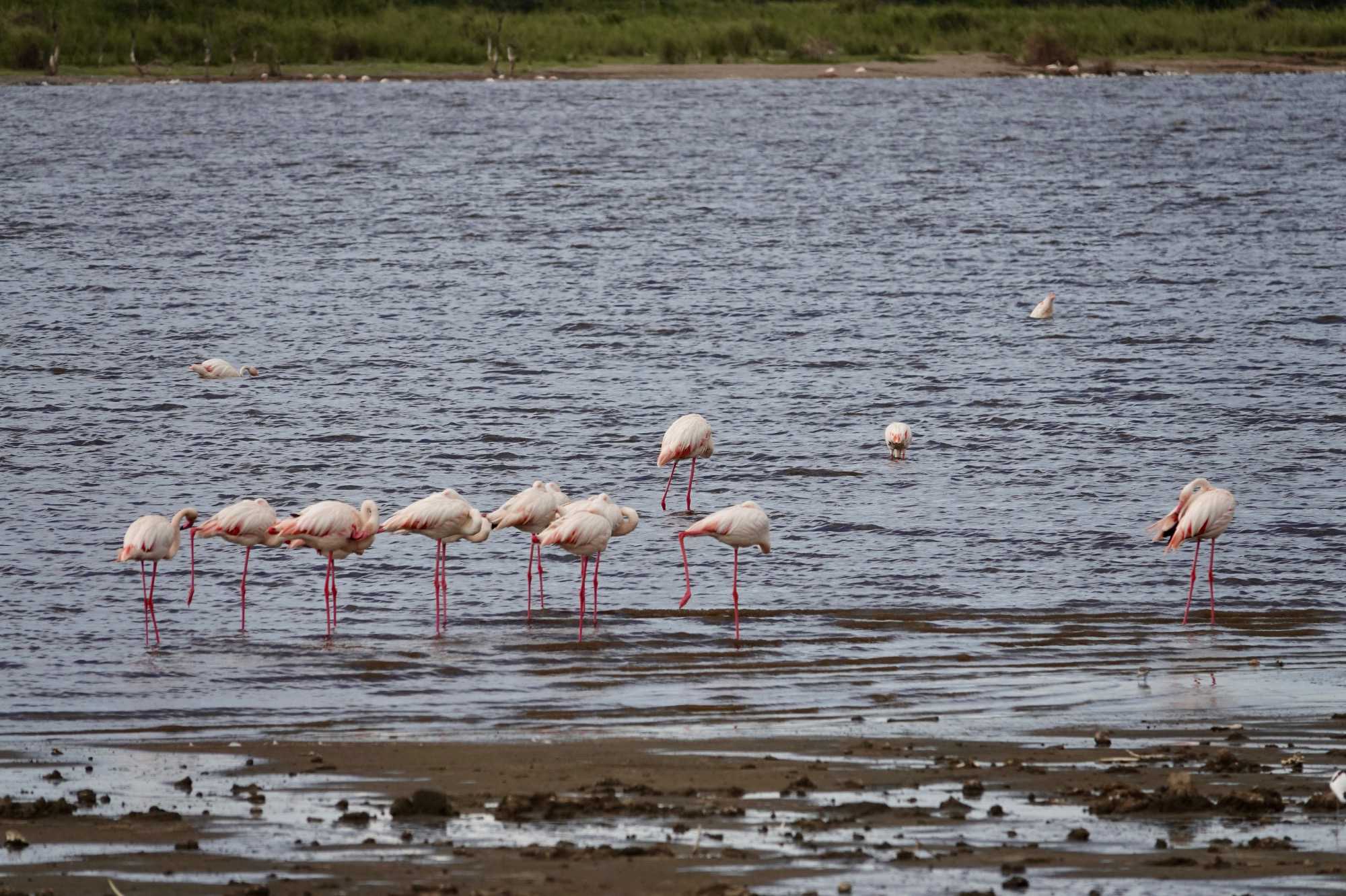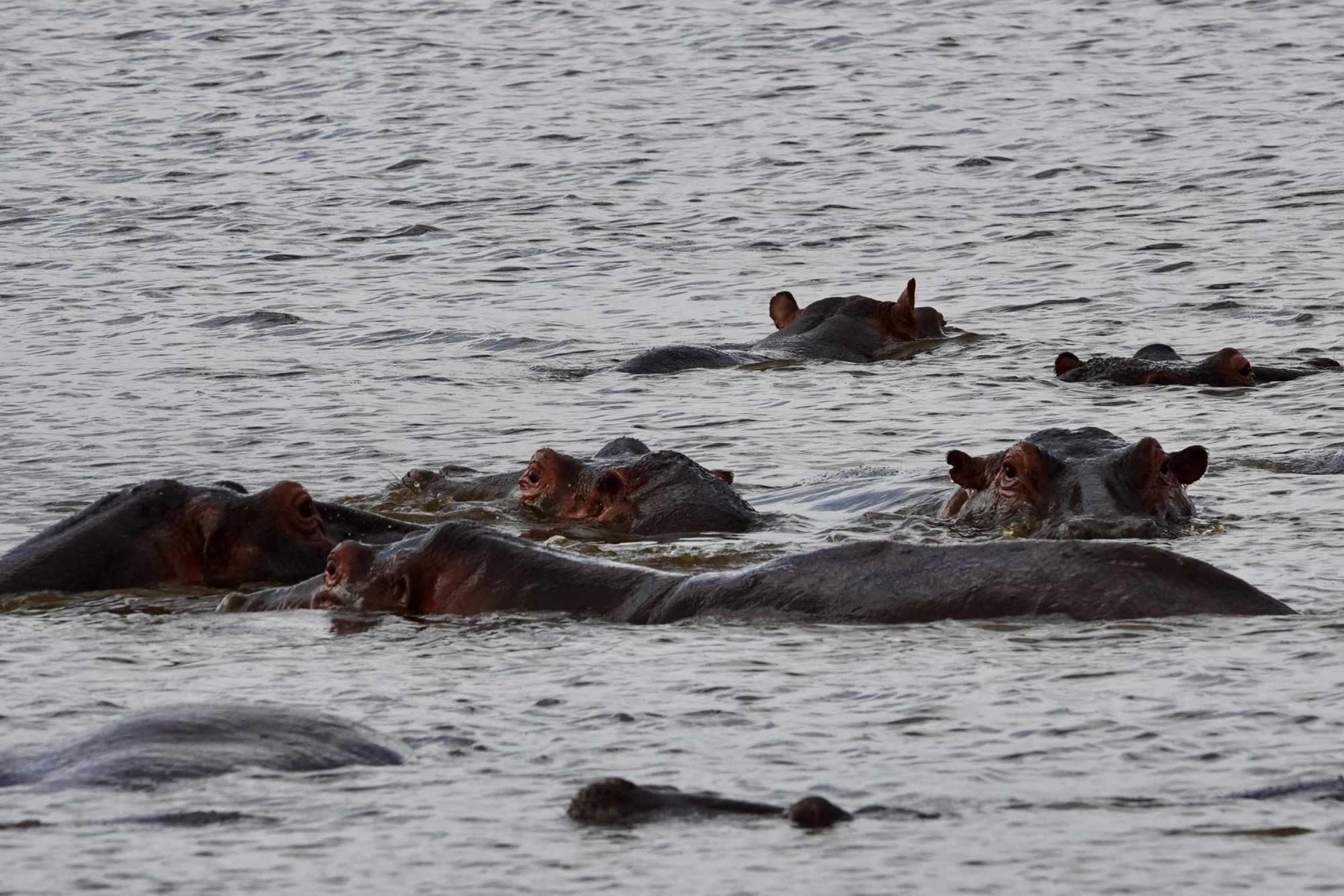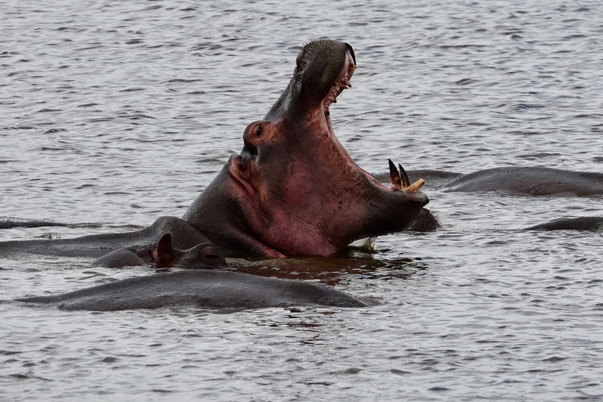 À peine avions-nous quitté notre lodge que nous retrouvions les charmantes gazelles de Thomson, présentes en grand nombre dans la savane. Puis, près d’un point d’eau, un spectacle enchanteur nous attendait : de magnifiques flamants roses, certains au repos, d’autres déployant leurs ailes dans une élégance parfaite. Un peu plus loin, un groupe d’hippopotames se prélassait dans l’eau, où ils passent une bonne partie de la journée pour se protéger du soleil avant de sortir, à la tombée de la nuit, pour brouter. Quelques-uns nous ont même dévoilé leur impressionnante mâchoire. Nous avons ensuite aperçu une lionne solitaire longeant le plan d’eau, nous offrant de superbes photos, avant de croiser plusieurs girafes s’alimentant paisiblement. L’une d’elles nous a permis d’observer la délicate manœuvre pour boire : un mouvement spectaculaire et vulnérable, pendant qu’une autre montait la garde. Un magnifique enchaînement de scènes sauvages, comme autant de clins d’œil de la nature. Nous rencontrons alors un troupeau d’éléphants que nous n’avions pas encore vus dans cette région. Ils marchent librement, paisiblement, dans cette lumière spectaculaire. Des girafes se dessinent en arrière-plan, majestueuses. Les scènes sont dignes d’une carte postale.