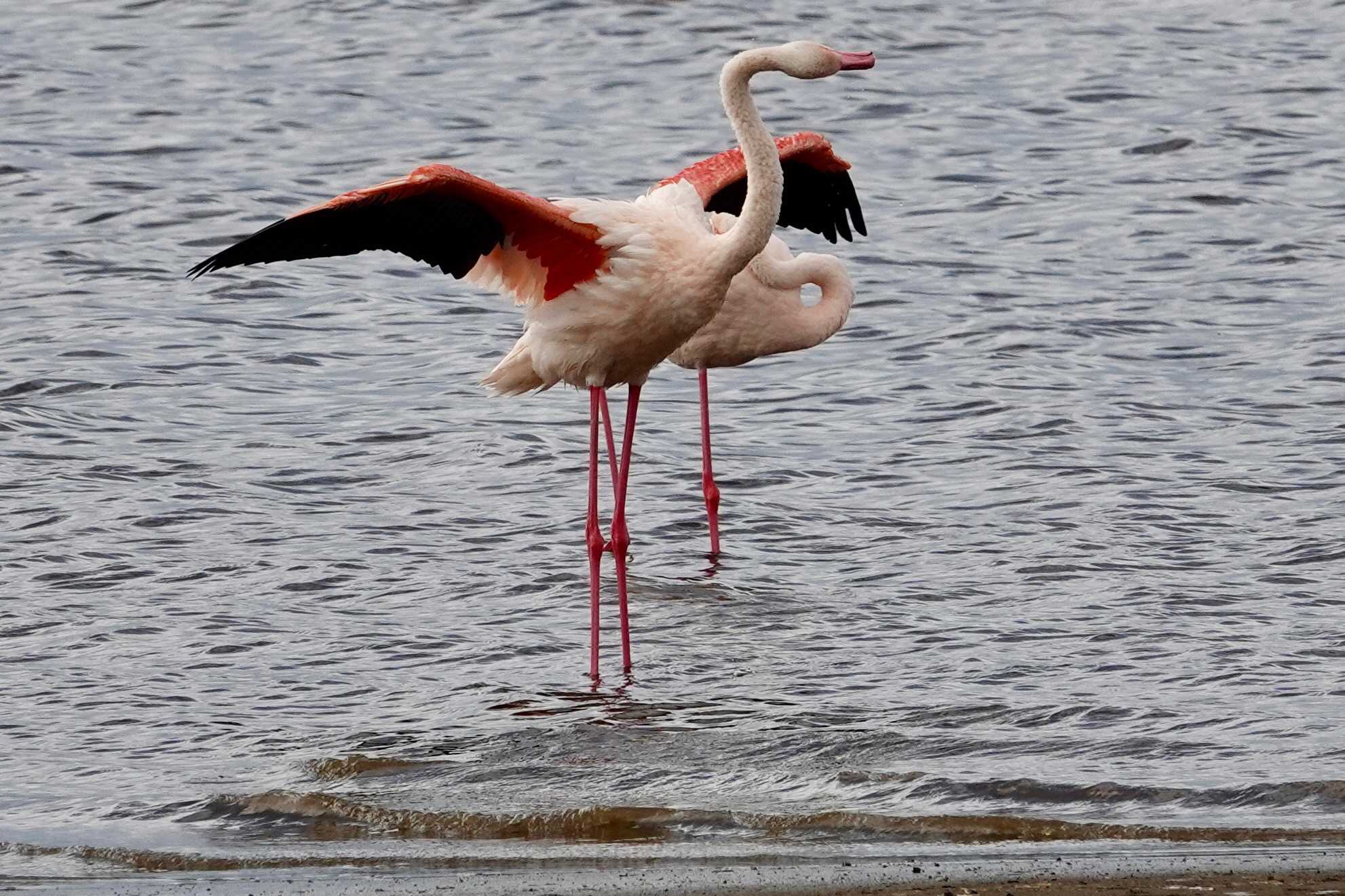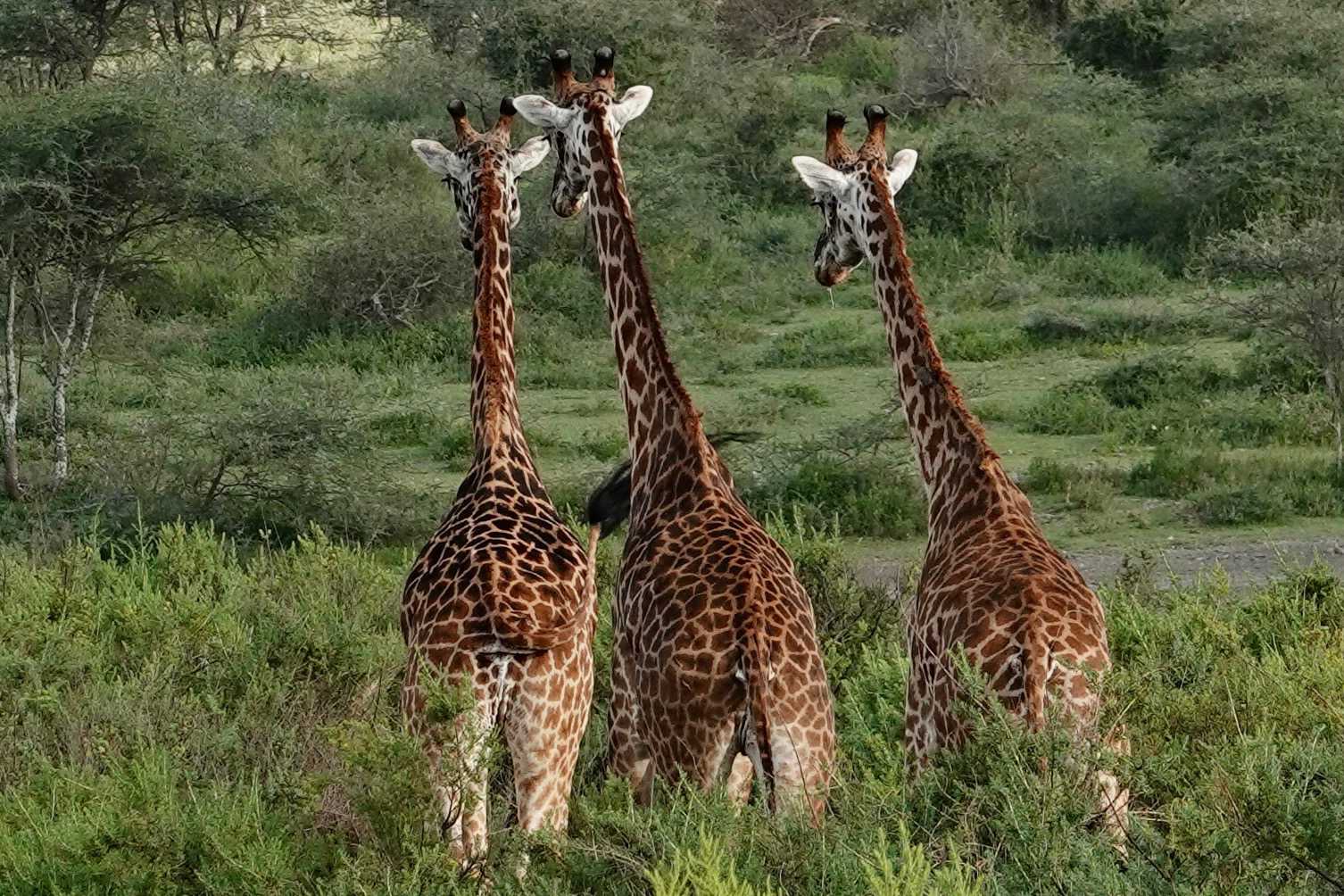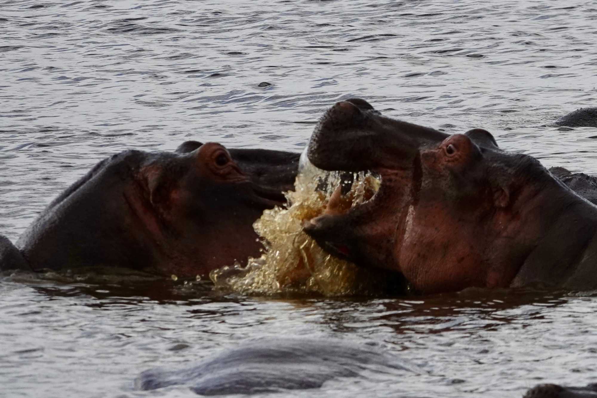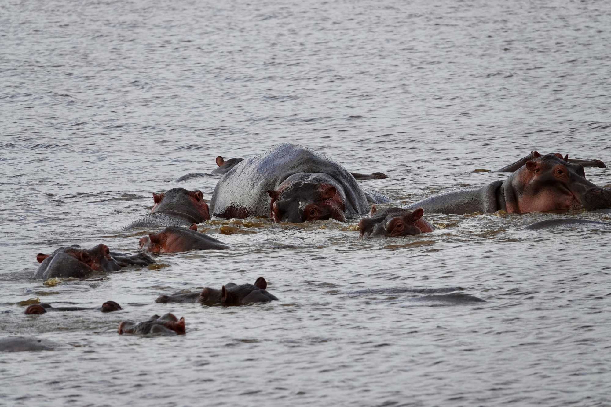 À peine avions-nous quitté notre lodge que nous retrouvions les charmantes gazelles de Thomson, présentes en grand nombre dans la savane. Puis, près d’un point d’eau, un spectacle enchanteur nous attendait : de magnifiques flamants roses, certains au repos, d’autres déployant leurs ailes dans une élégance parfaite. Un peu plus loin, un groupe d’hippopotames se prélassait dans l’eau, où ils passent une bonne partie de la journée pour se protéger du soleil avant de sortir, à la tombée de la nuit, pour brouter. Quelques-uns nous ont même dévoilé leur impressionnante mâchoire. Nous avons ensuite aperçu une lionne solitaire longeant le plan d’eau, nous offrant de superbes photos, avant de croiser plusieurs girafes s’alimentant paisiblement. L’une d’elles nous a permis d’observer la délicate manœuvre pour boire : un mouvement spectaculaire et vulnérable, pendant qu’une autre montait la garde. Un magnifique enchaînement de scènes sauvages, comme autant de clins d’œil de la nature. Nous rencontrons alors un troupeau d’éléphants que nous n’avions pas encore vus dans cette région. Ils marchent librement, paisiblement, dans cette lumière spectaculaire. Des girafes se dessinent en arrière-plan, majestueuses. Les scènes sont dignes d’une carte postale.