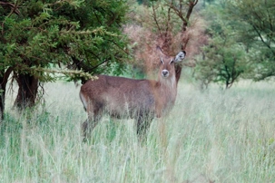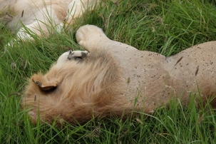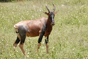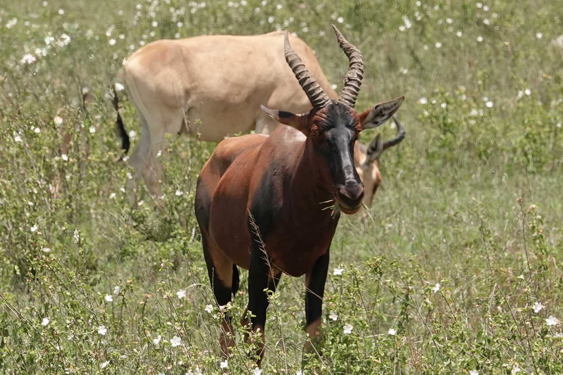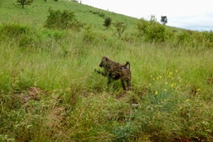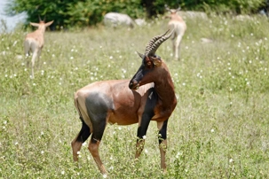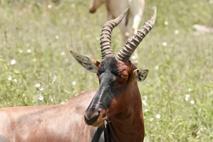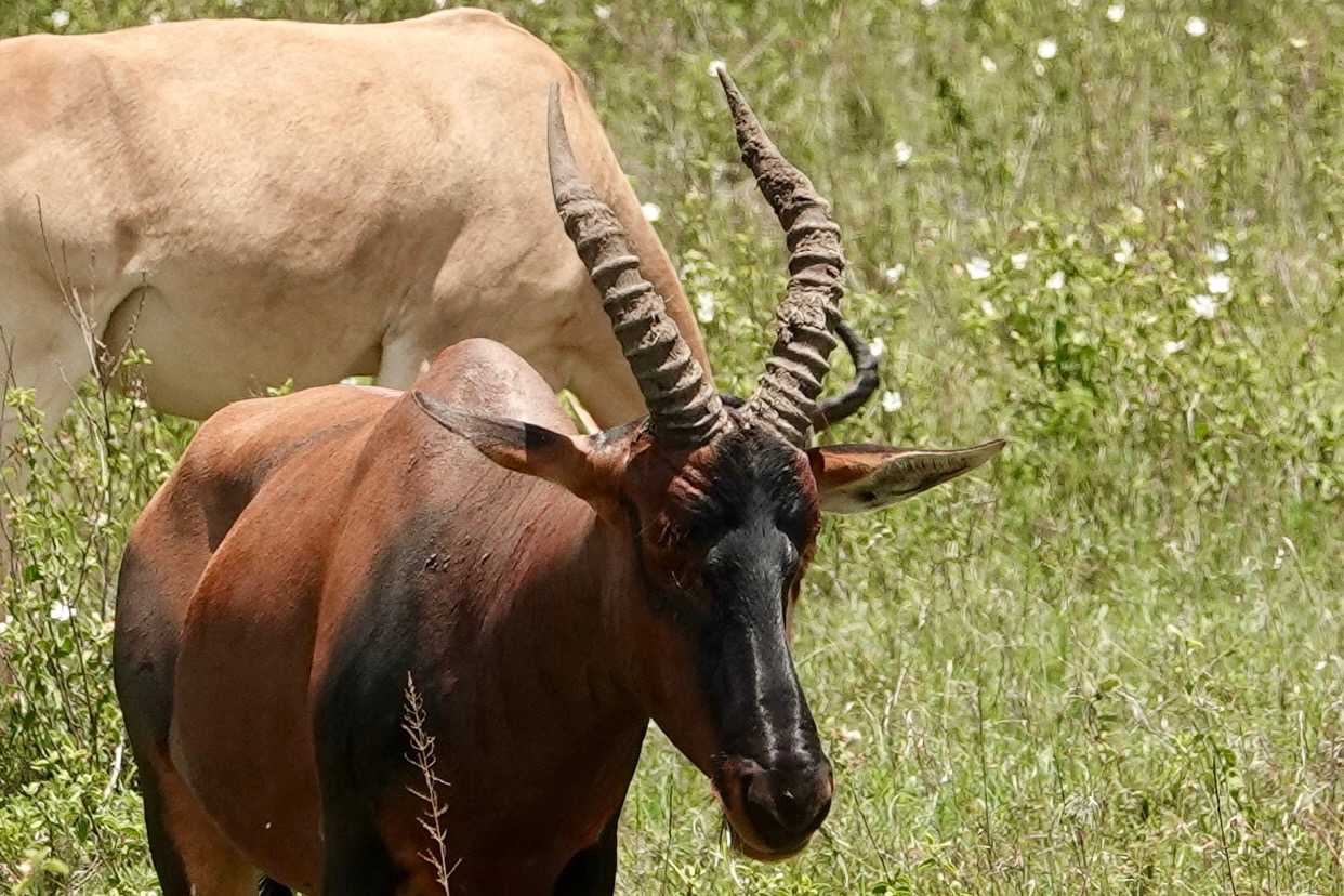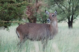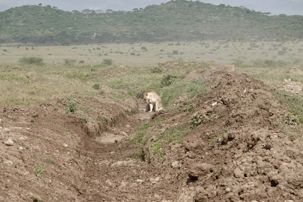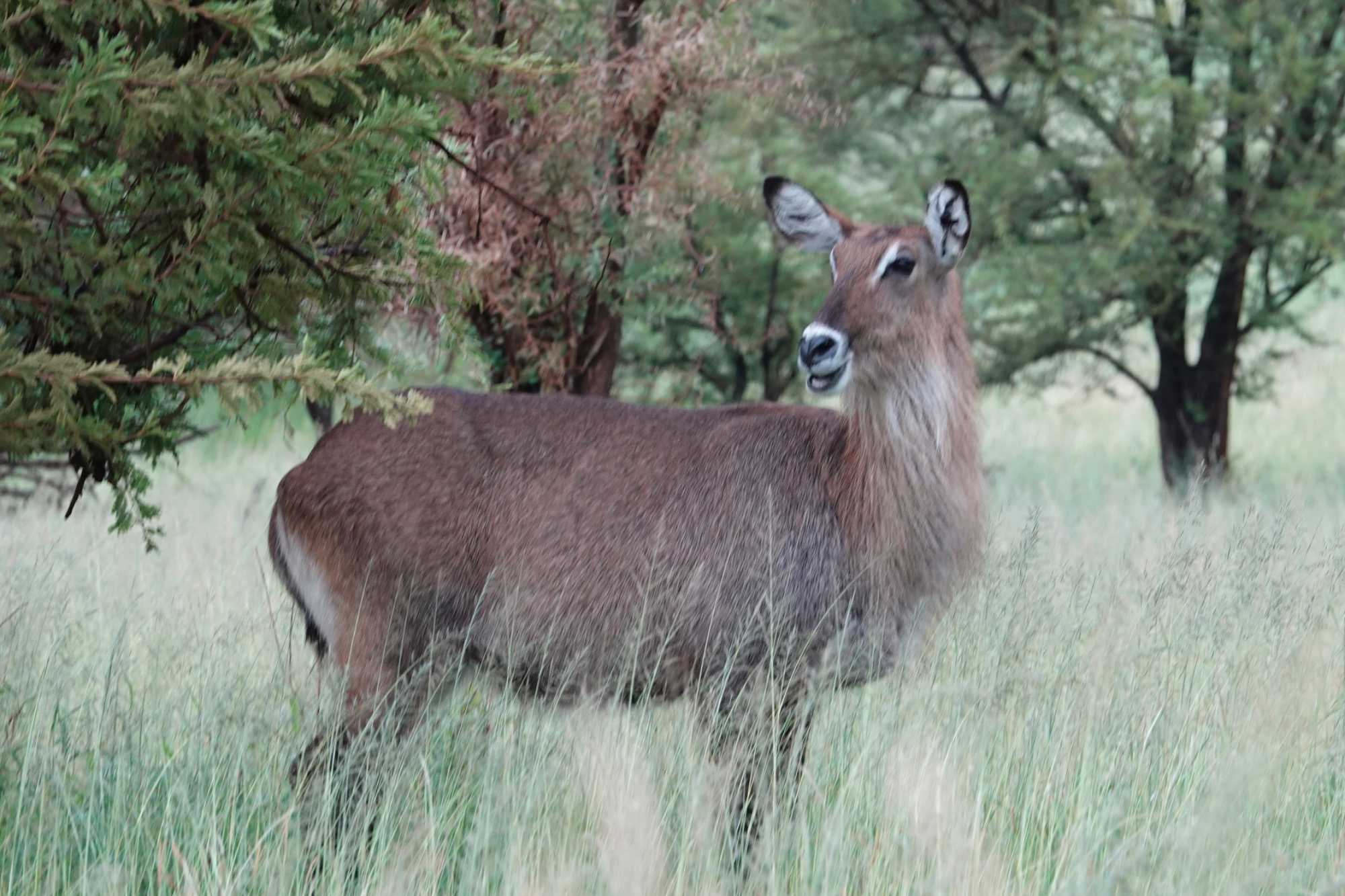 Un peu plus loin, une lionne solitaire se prélasse dans l’herbe. Elle est couchée, calme, presque indifférente à notre présence. Peut-être fatiguée d’une chasse nocturne. Sa posture est détendue, mais son regard reste attentif. Encore un beau moment à capturer. Nous croisons également de magnifiques topis en fin d'avant-midi. Leur robe brun roux aux reflets plus foncés capte merveilleusement la lumière. On les voit souvent perchés sur de petites buttes de terre, comme de véritables sentinelles surveillant leur territoire.