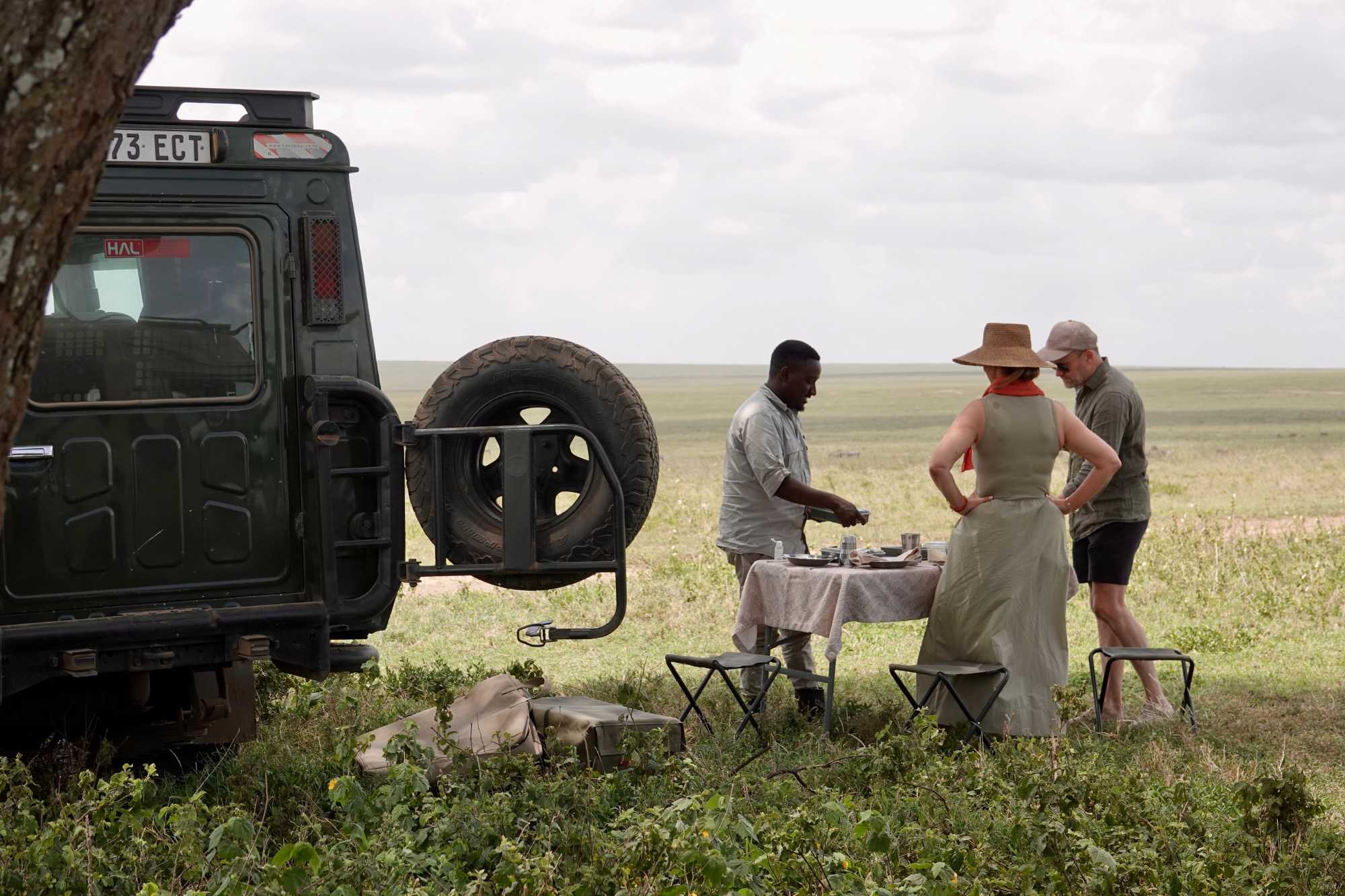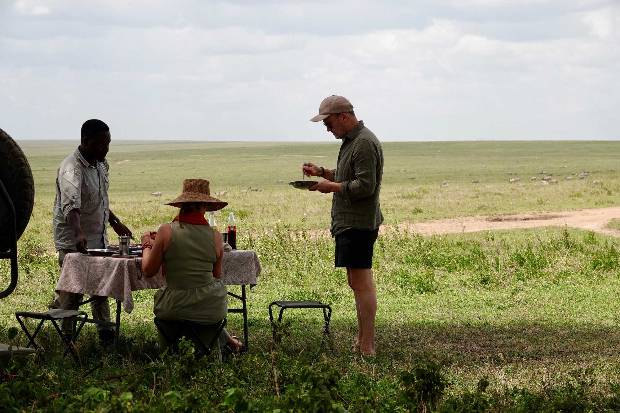 À l’heure du dîner, nos guides choisissent un emplacement magnifique sous un arbre isolé. Nous partageons notre pique-nique en pleine savane, entourés de zèbres. Littéralement. Ils broutent à quelques mètres de nous. Des oiseaux virevoltent. La convivialité du groupe rend le moment encore plus spécial.