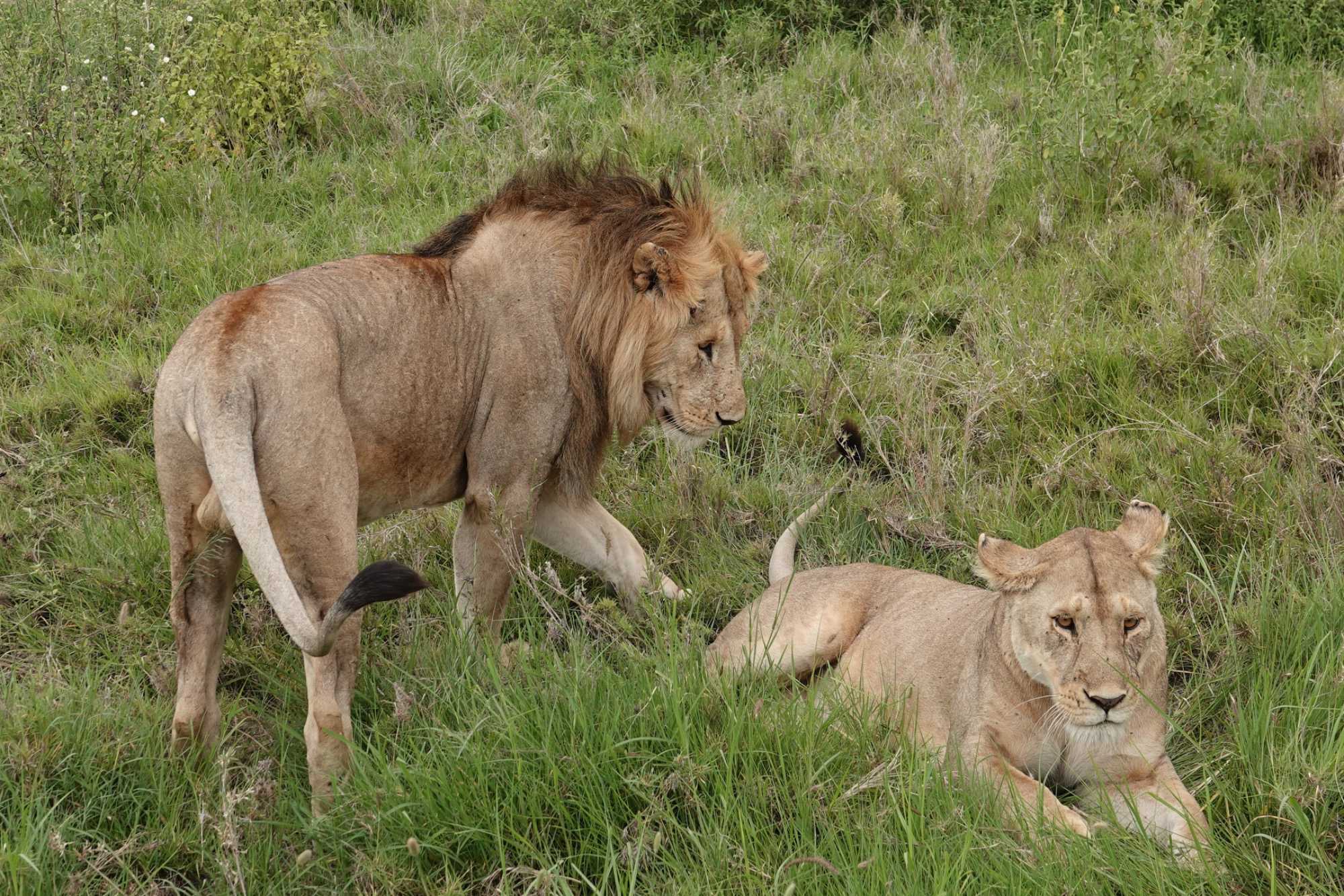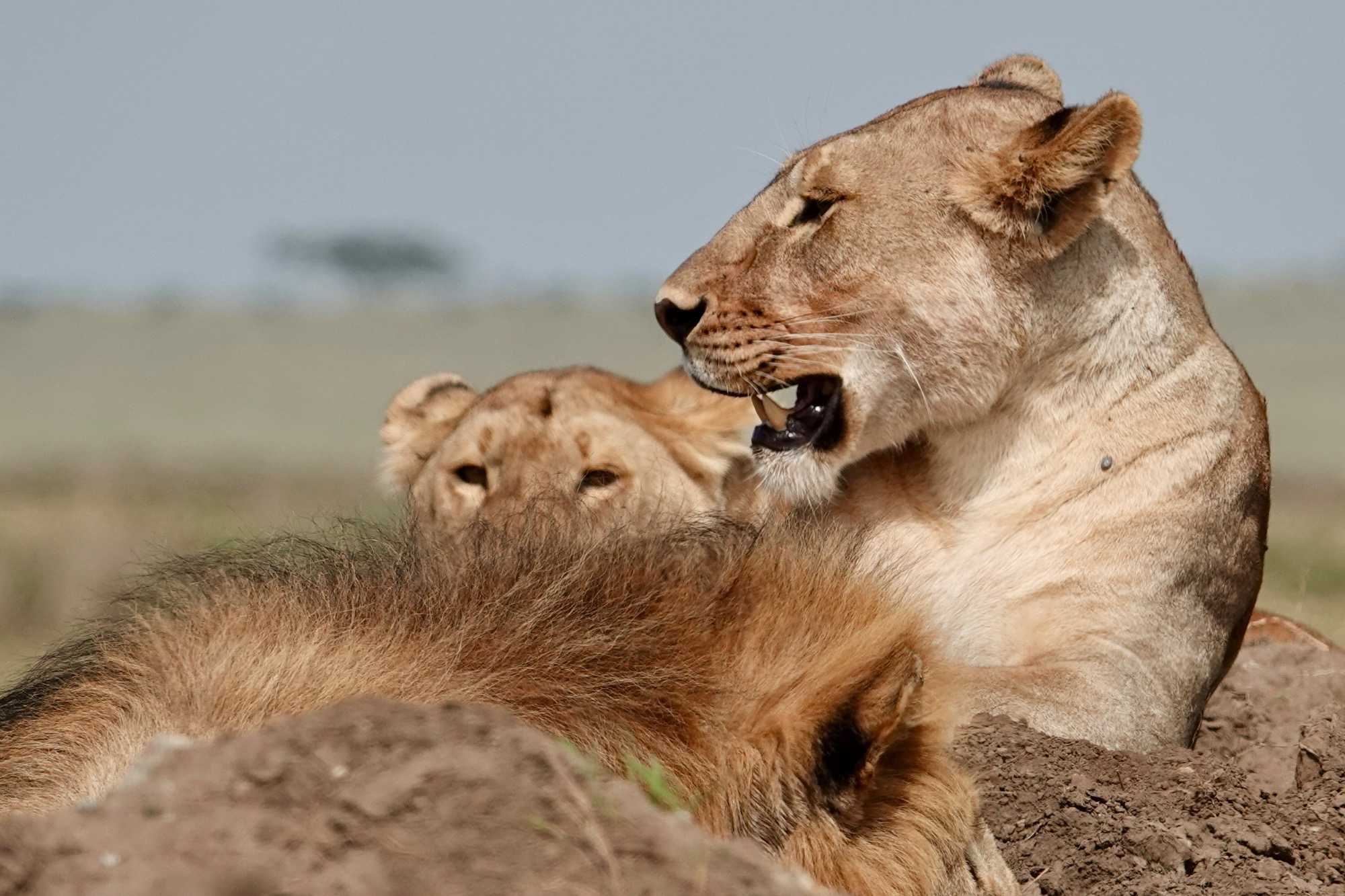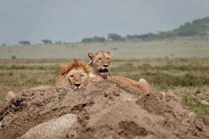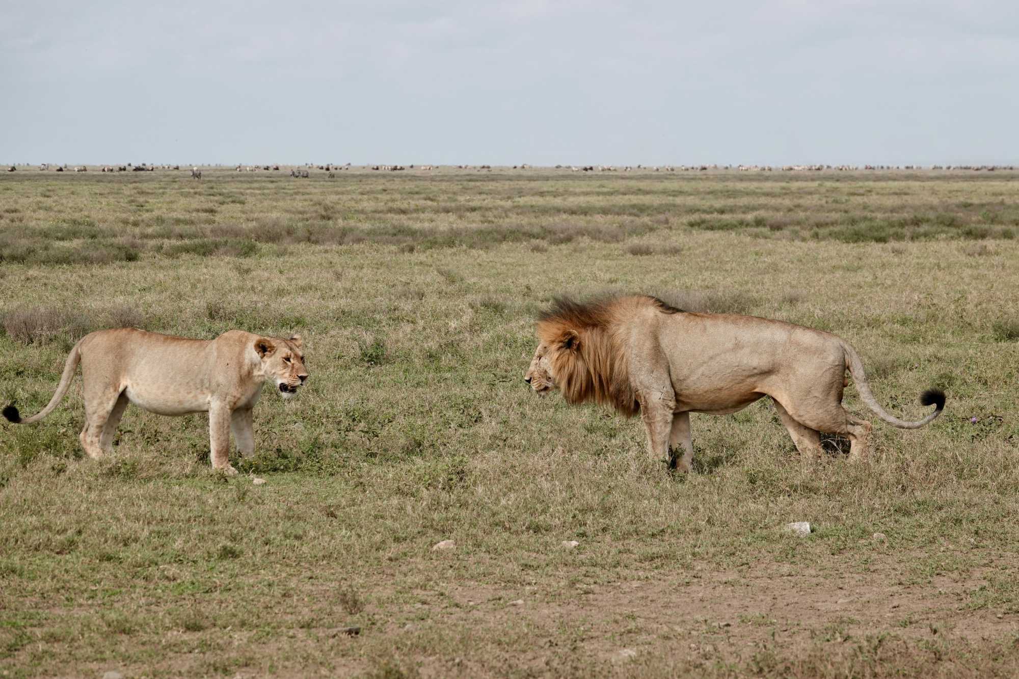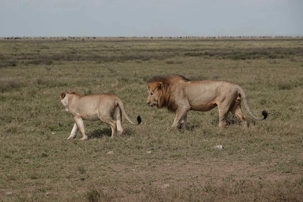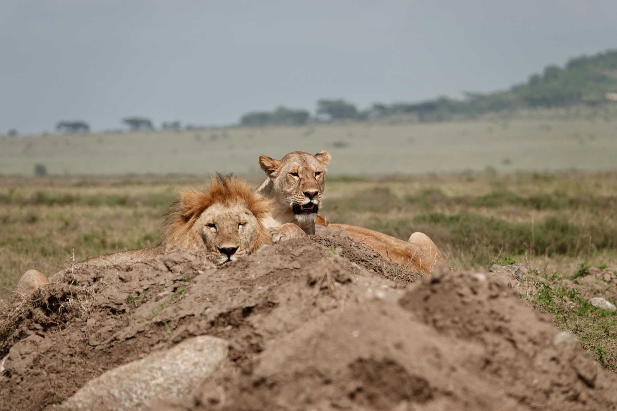Puis, alors que nous poursuivons notre exploration du Serengeti, nous tombons sur un autre couple de lions. Décidément, ce parc est un véritable royaume pour ces félins.