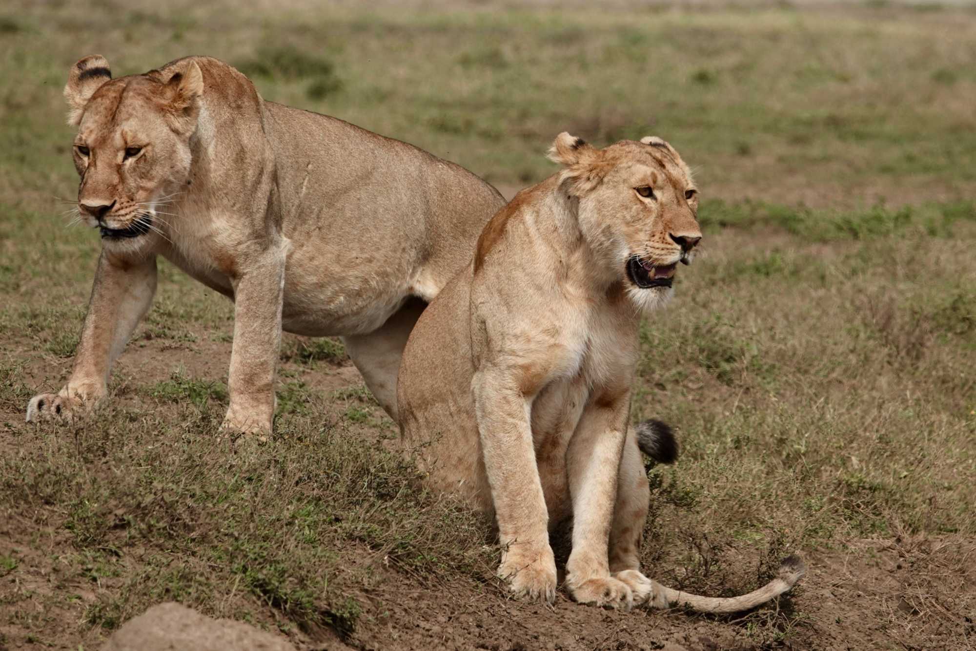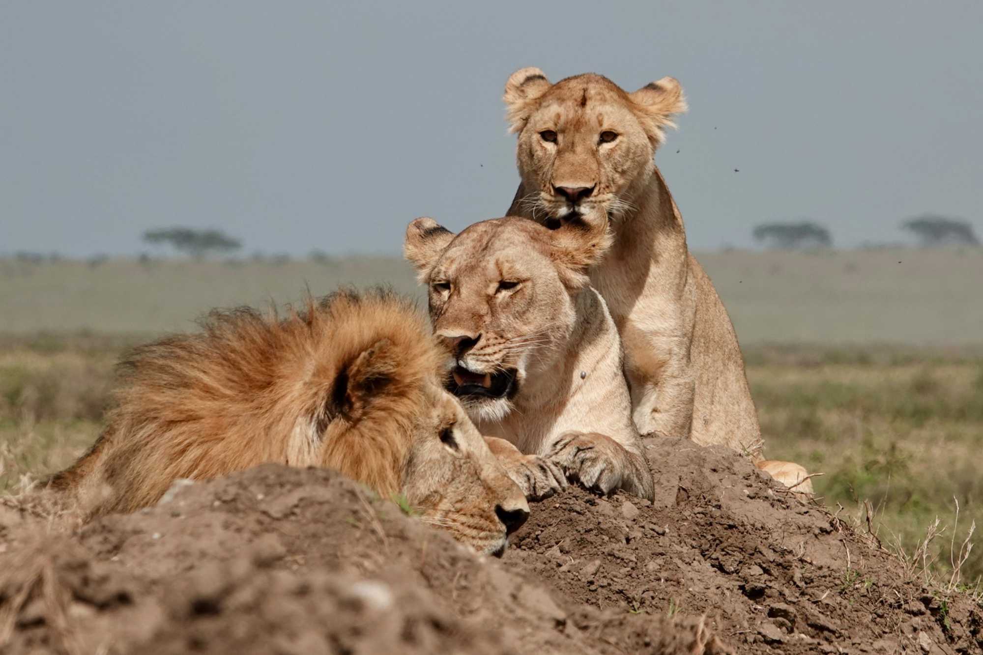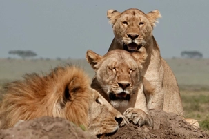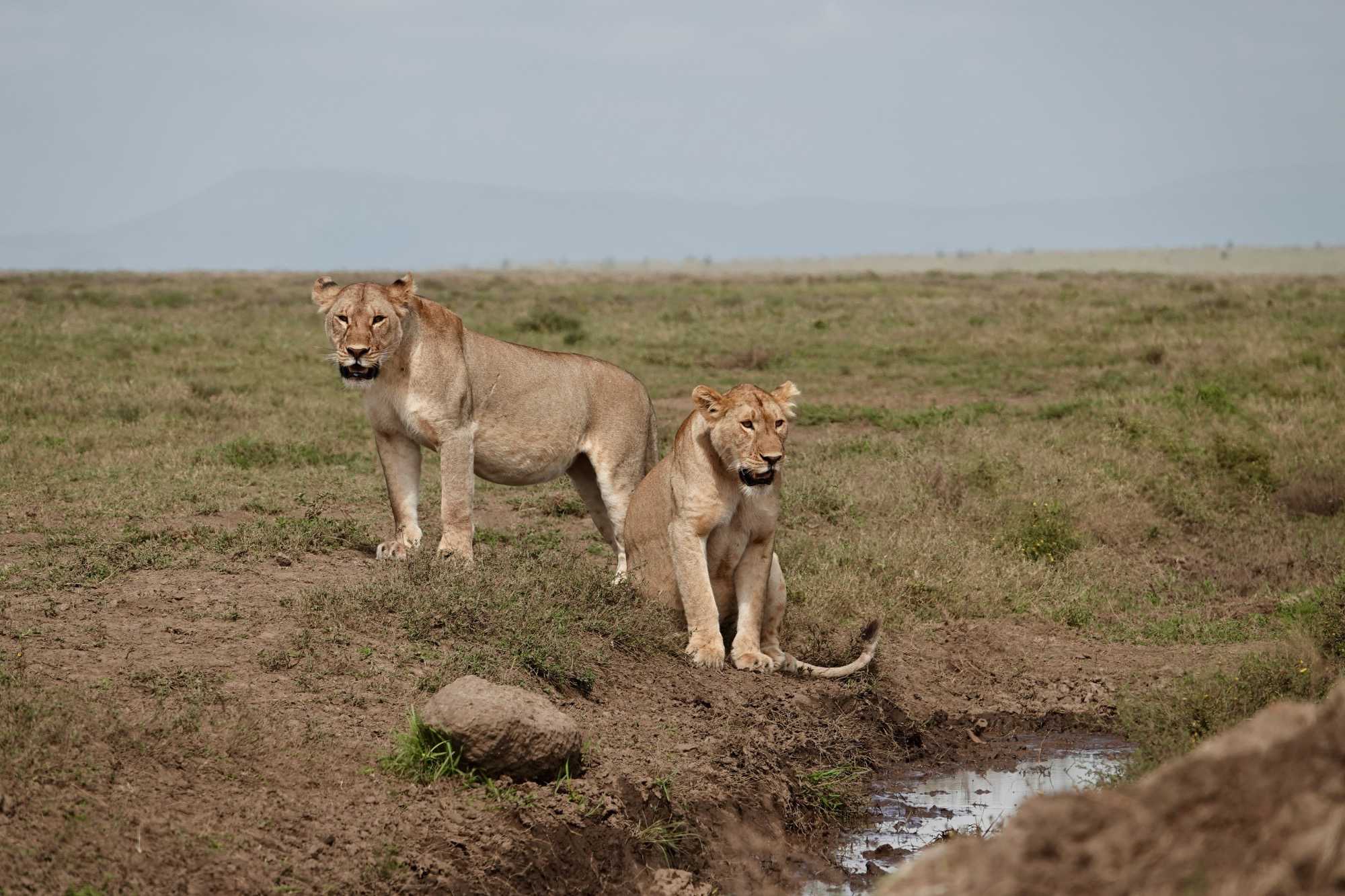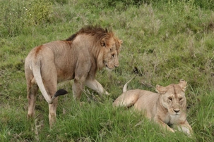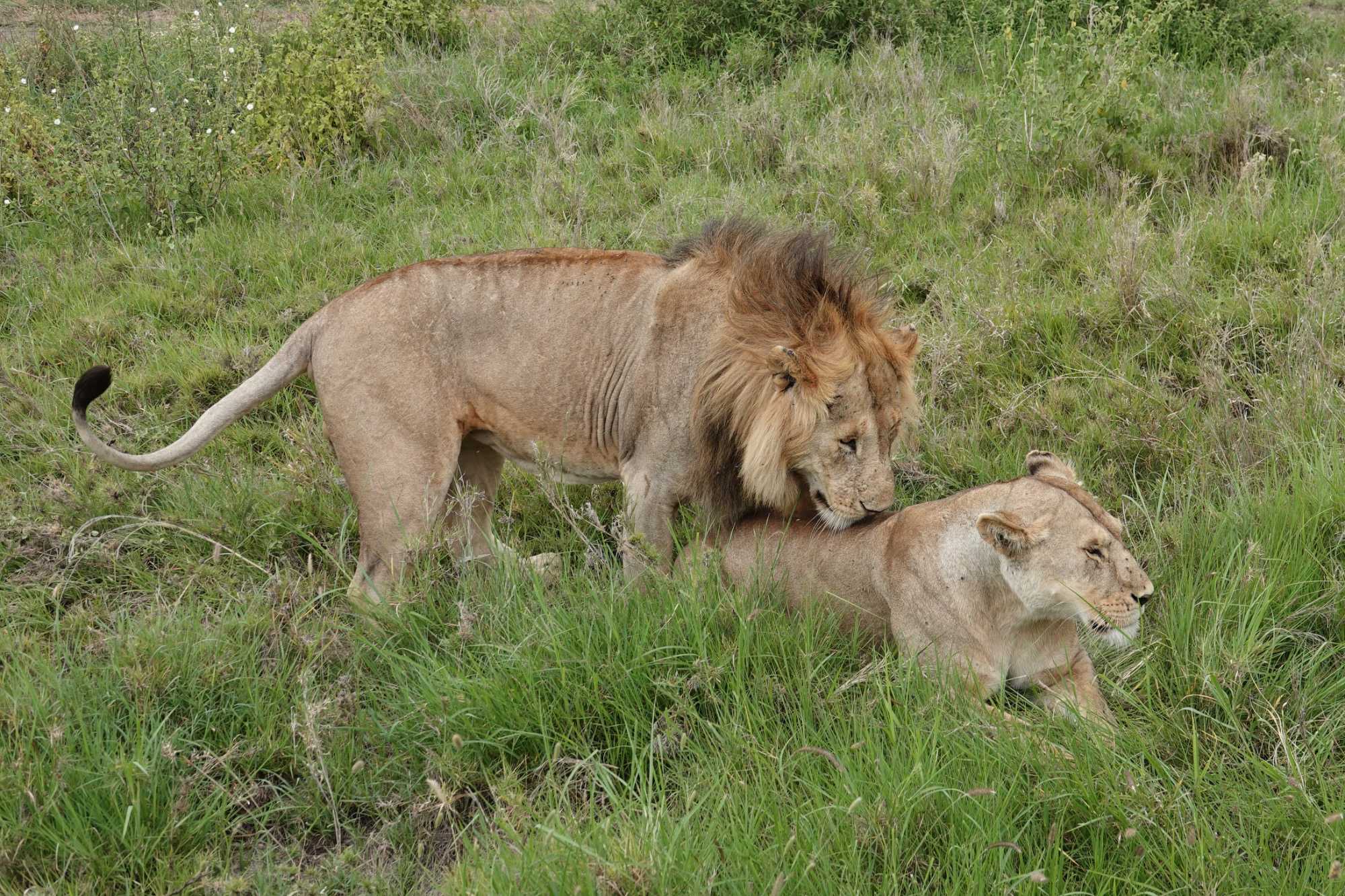 Puis, alors que nous poursuivons notre exploration du Serengeti, nous tombons sur un autre couple de lions. Décidément, ce parc est un véritable royaume pour ces félins.