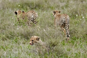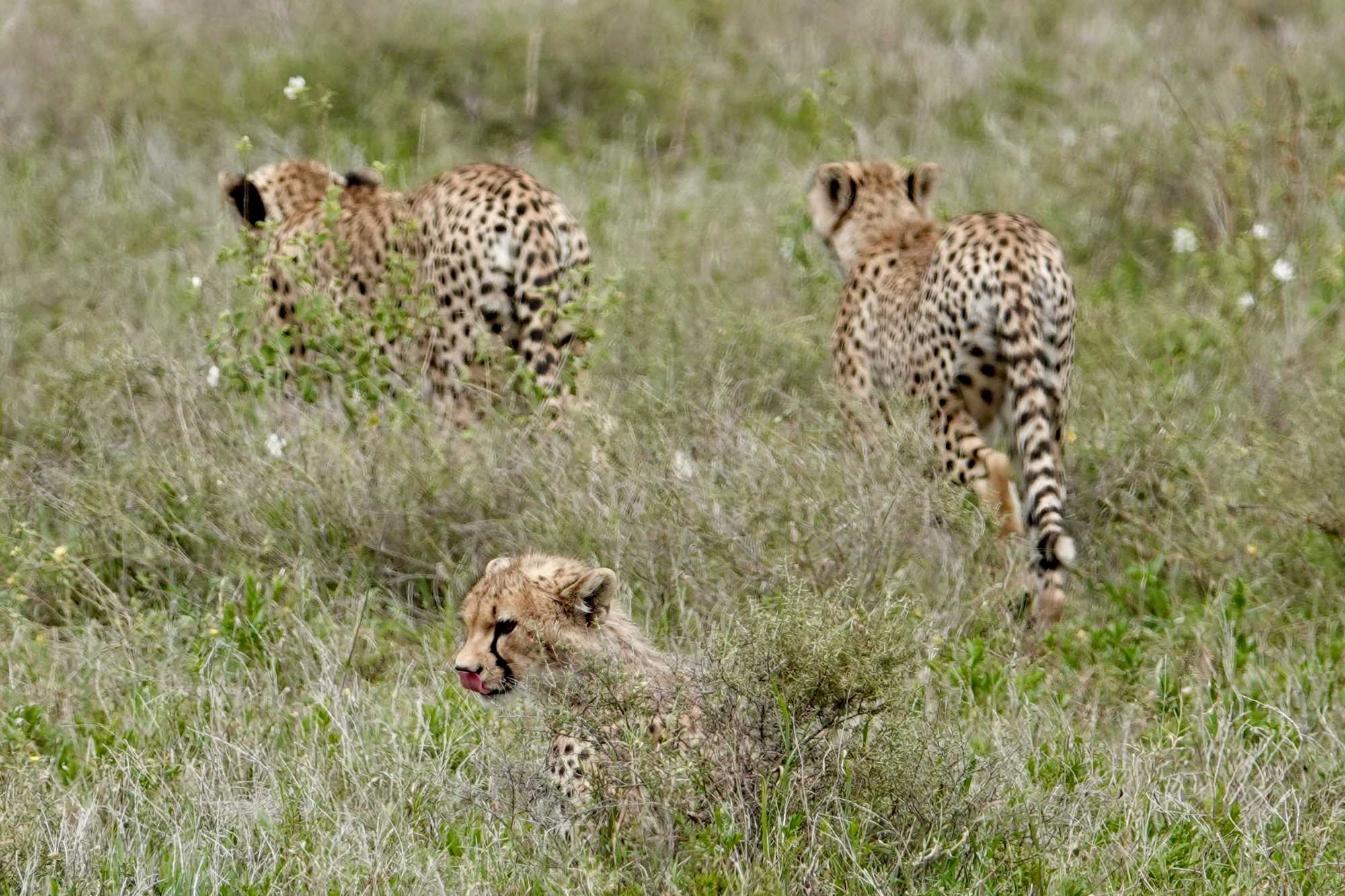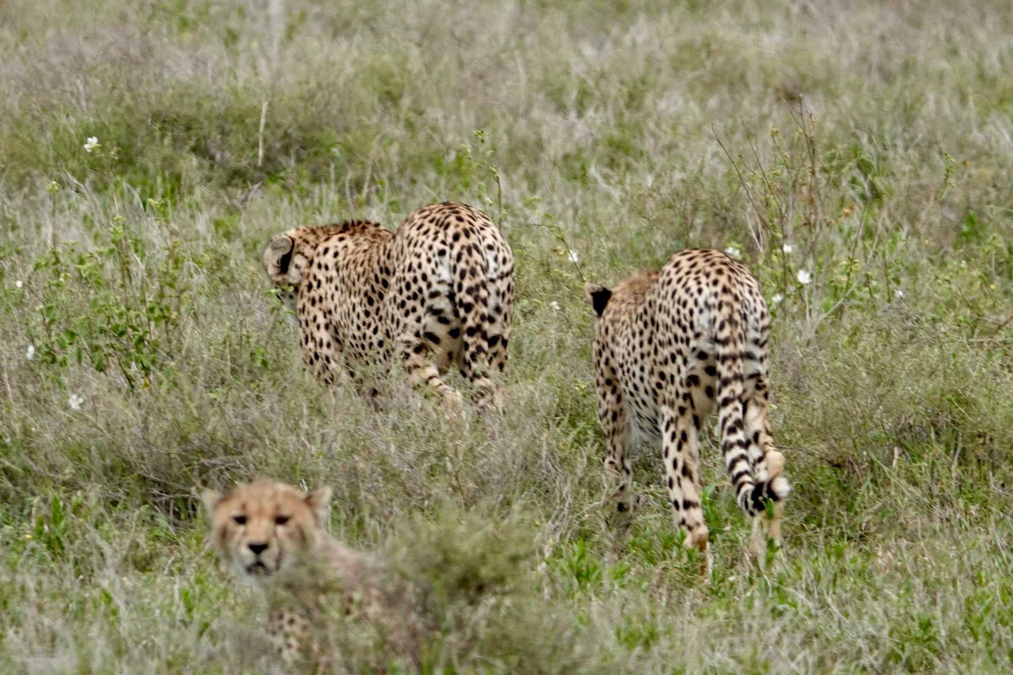 Nous apercevons trois magnifiques guépards, possiblement deux adultes et un jeune. Élégants, gracieux, attentifs. Leurs silhouettes fines se détachent dans l’herbe dorée.