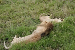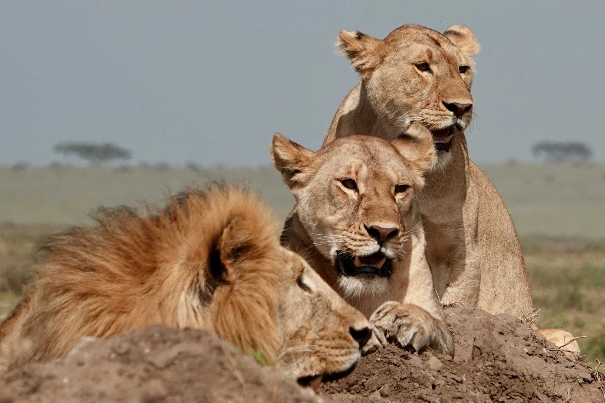 Deux lionnes et un lion sont installés sur le bord de la piste. Position parfaite. Distance idéale. Nous pouvons les admirer longuement et prendre des photos exceptionnelles 🦁.