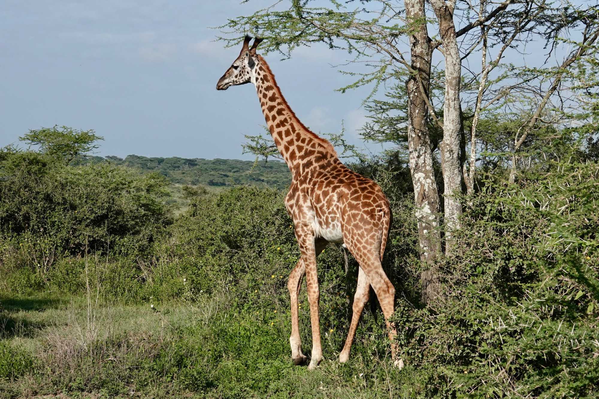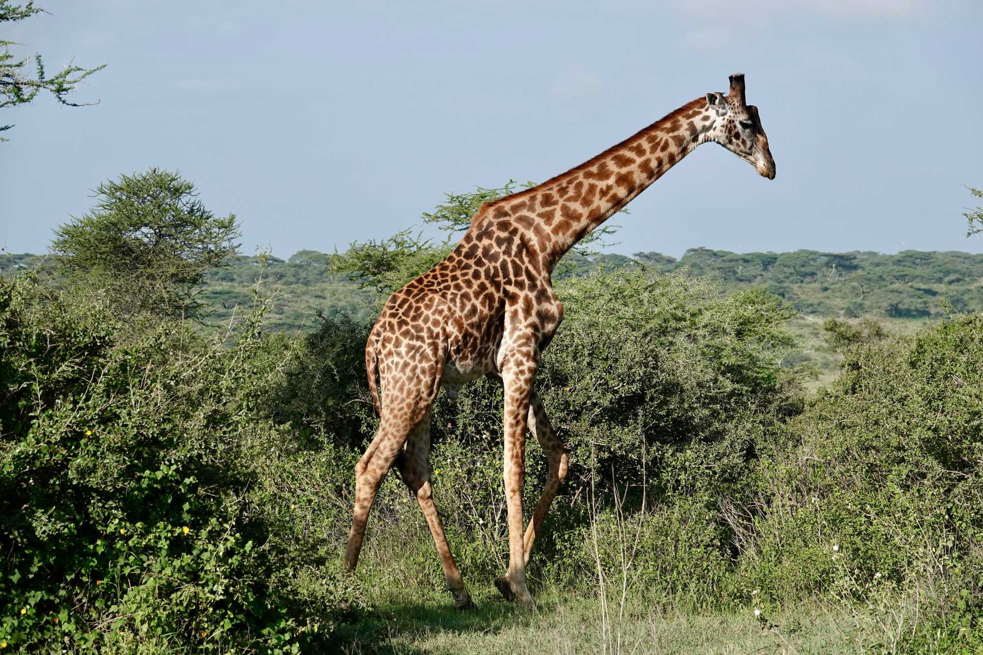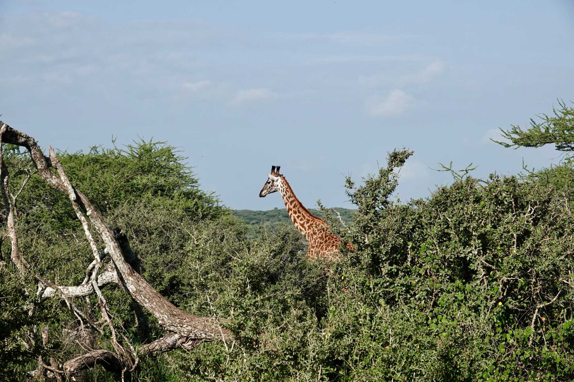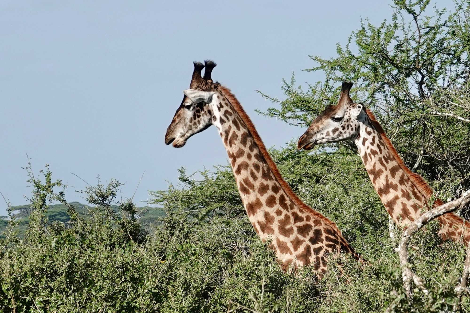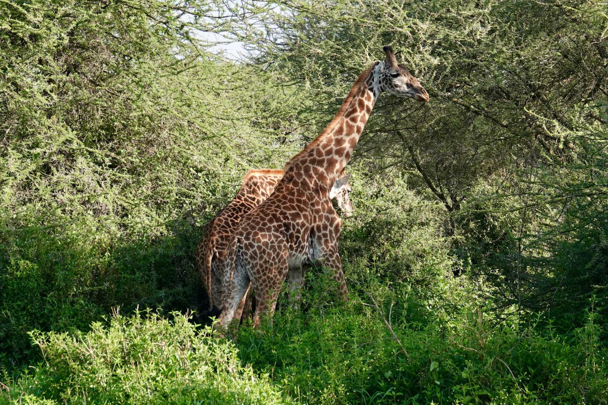 Mais avant de quitter complètement la région de Ndutu, nous profitons d’un dernier mini-safari matinal. Et la matinée est placée sous le signe des girafes. Elles sont partout. Certaines marchent avec cette grâce lente et élégante qui les caractérise, d’autres semblent presque jouer entre elles. La lumière du matin met magnifiquement en valeur leurs silhouettes élancées.