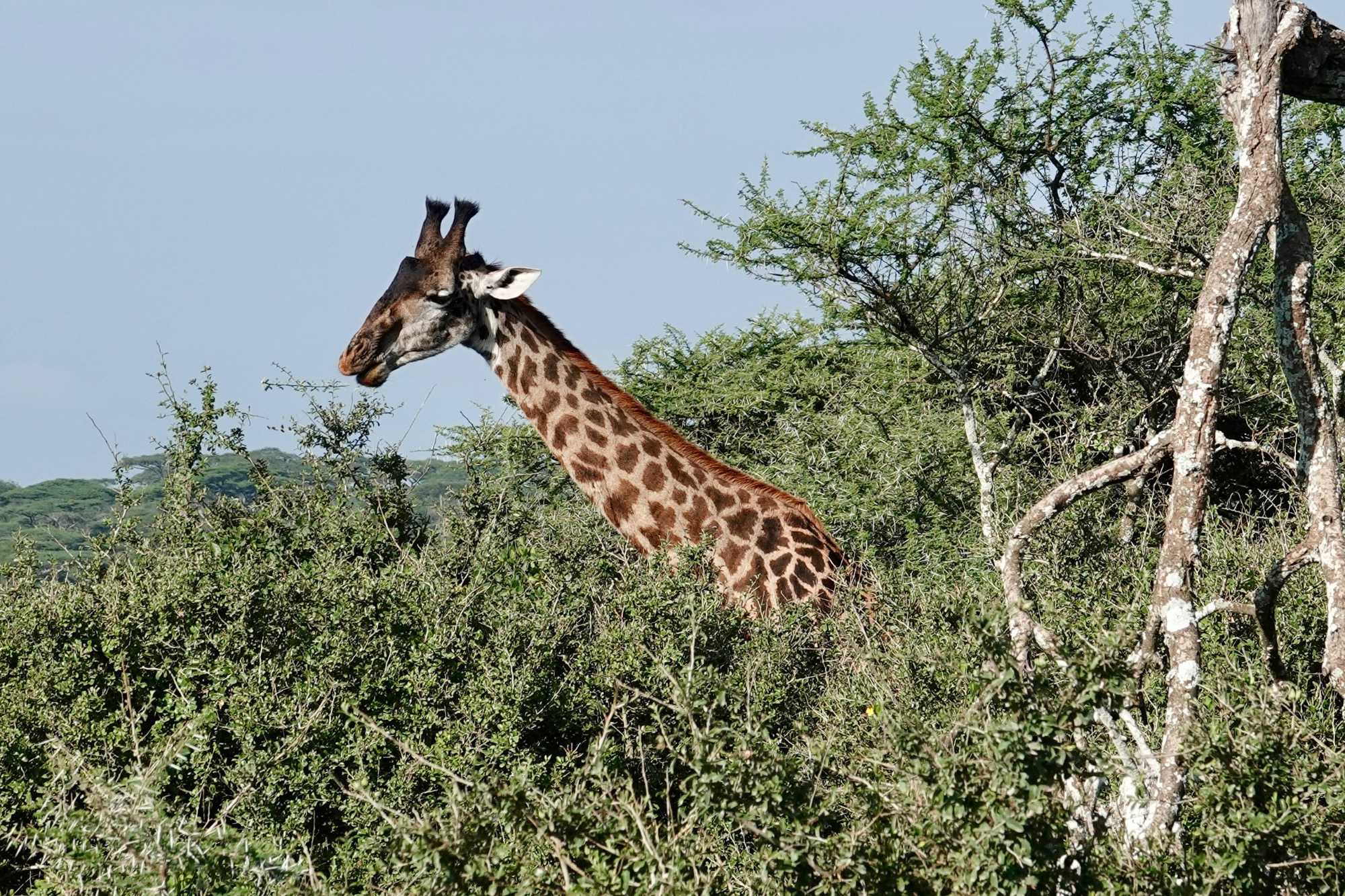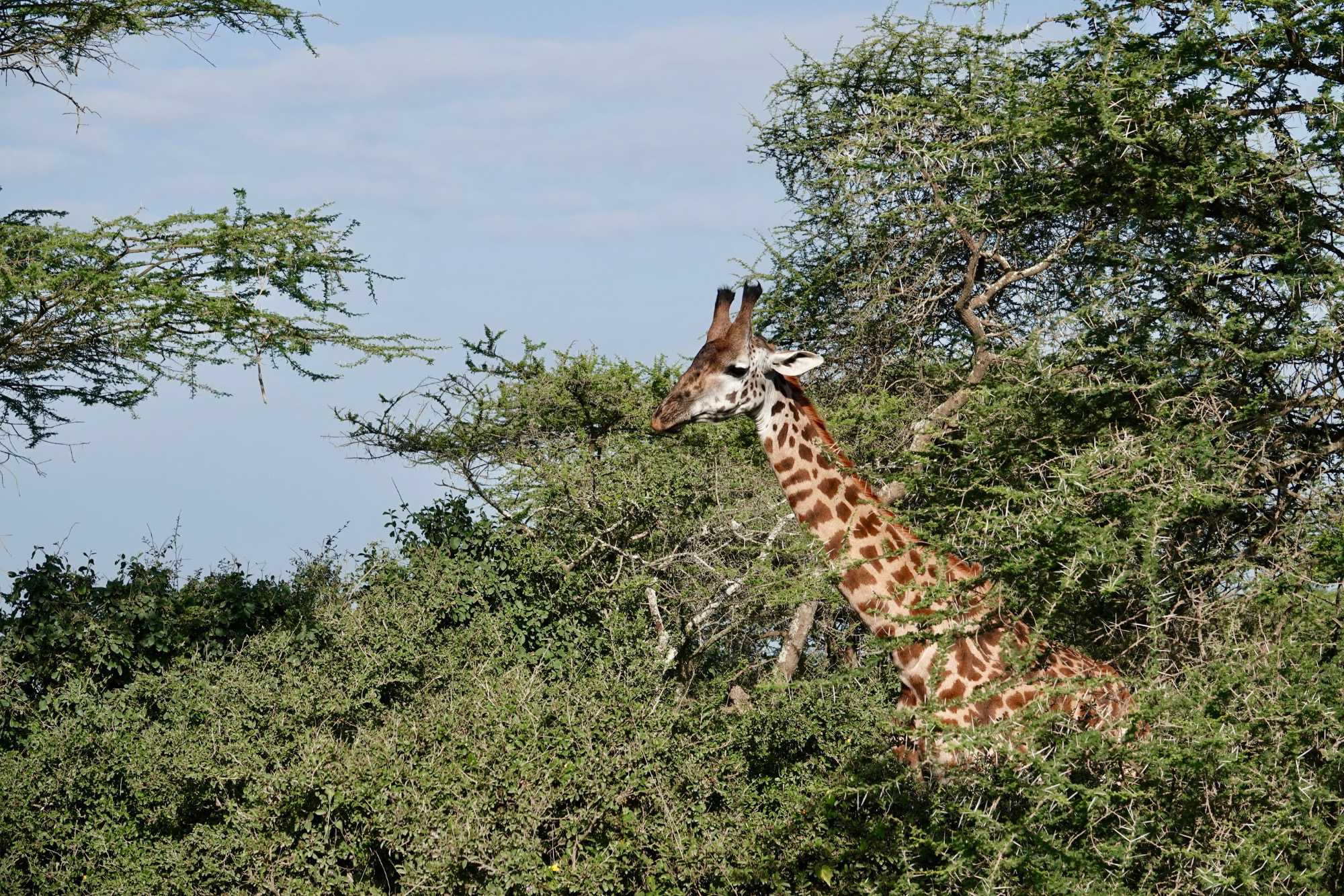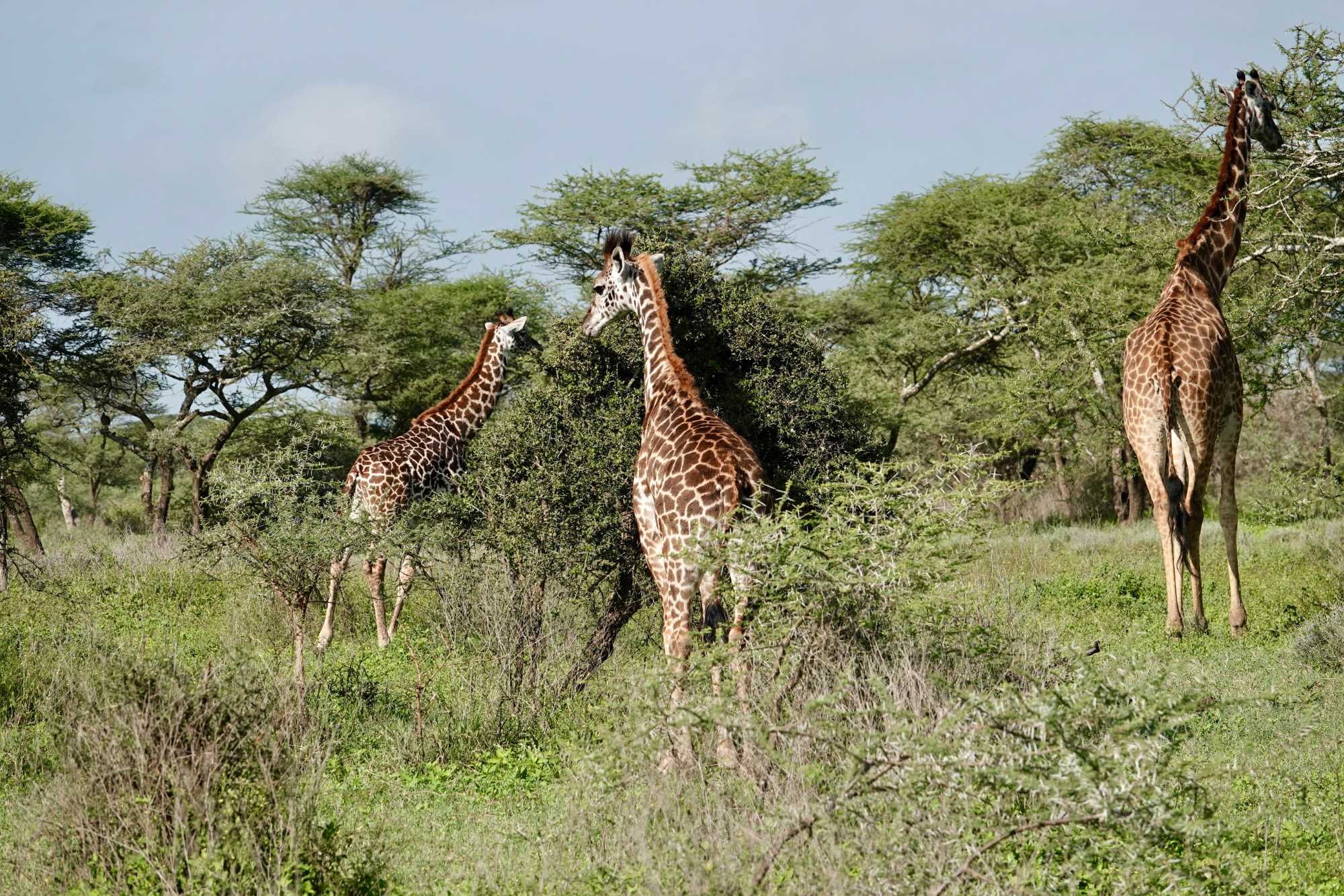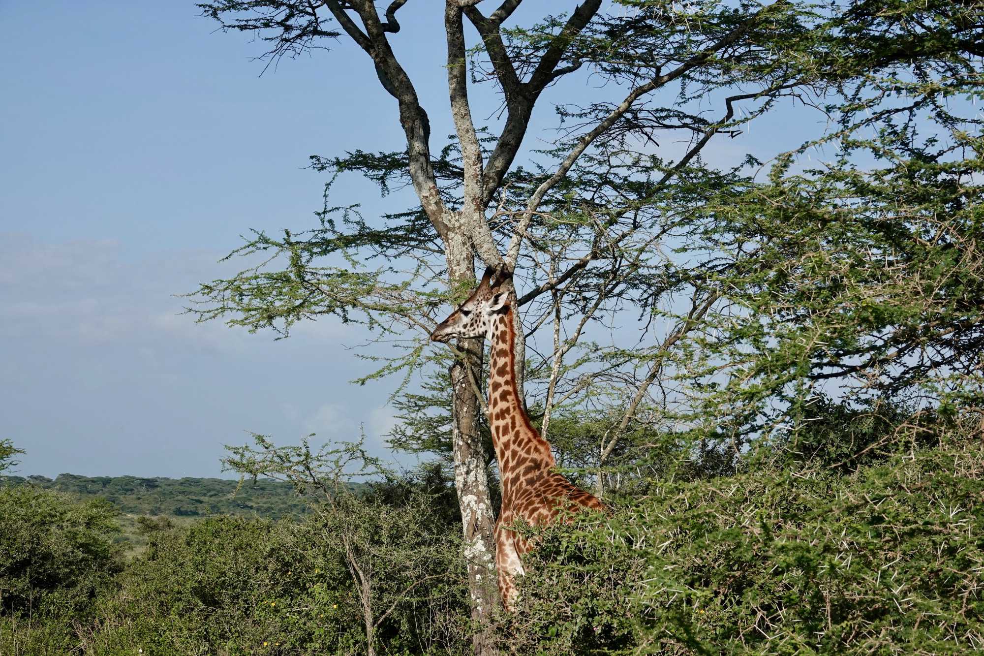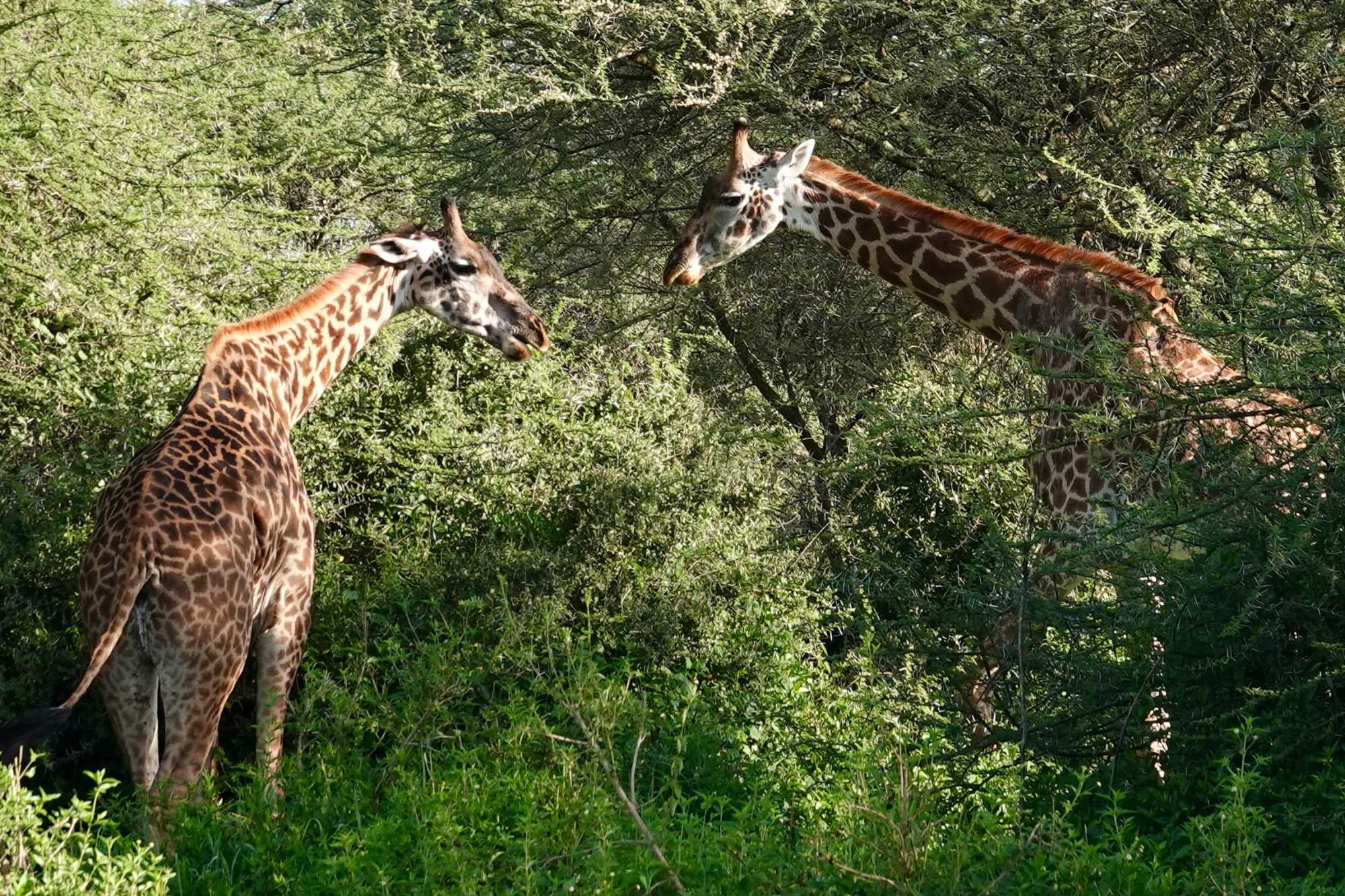 Mais avant de quitter complètement la région de Ndutu, nous profitons d’un dernier mini-safari matinal. Et la matinée est placée sous le signe des girafes. Elles sont partout. Certaines marchent avec cette grâce lente et élégante qui les caractérise, d’autres semblent presque jouer entre elles. La lumière du matin met magnifiquement en valeur leurs silhouettes élancées.