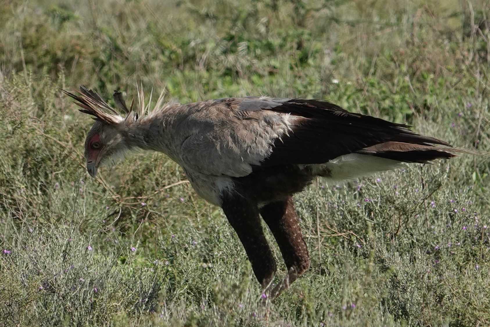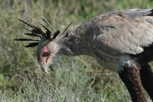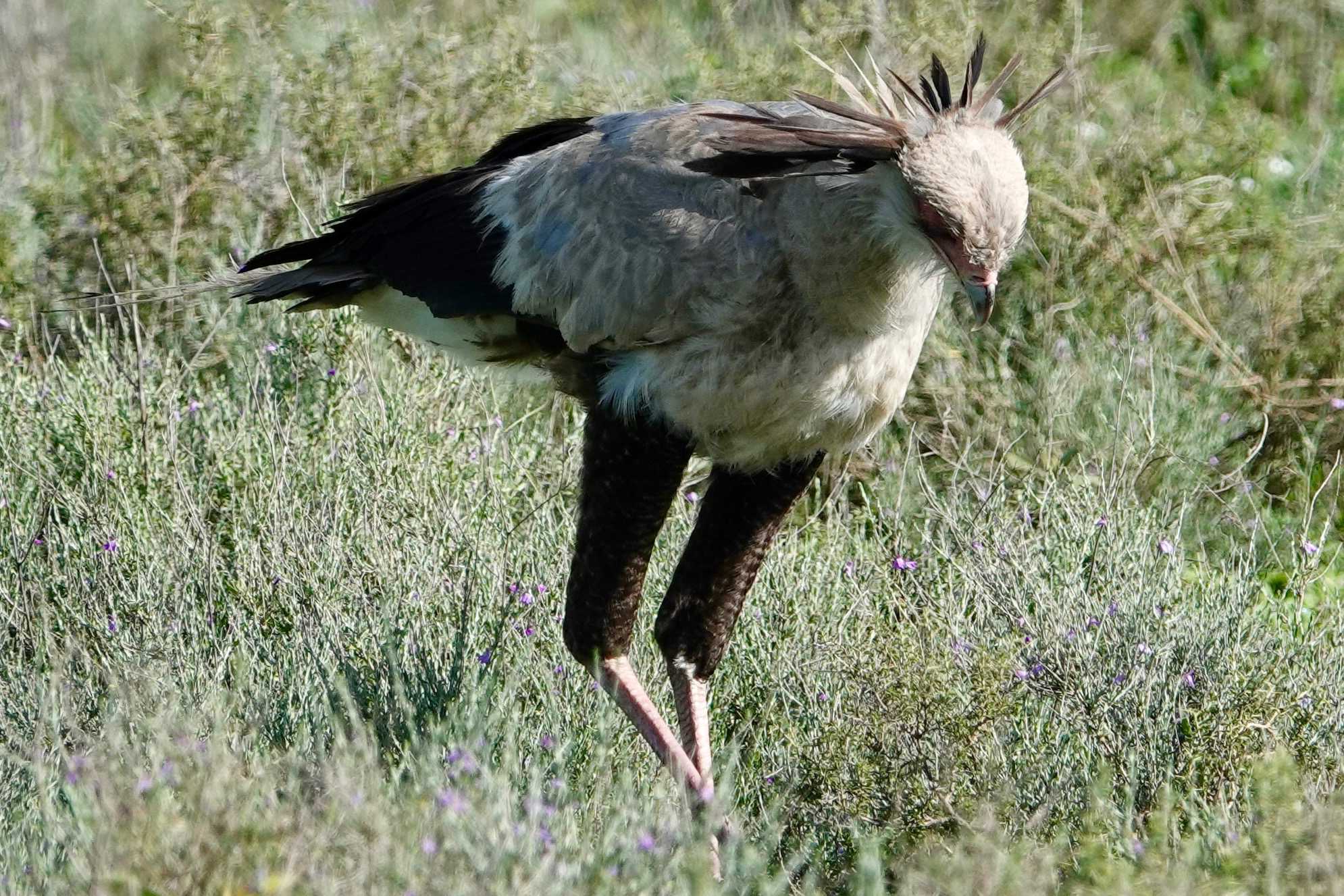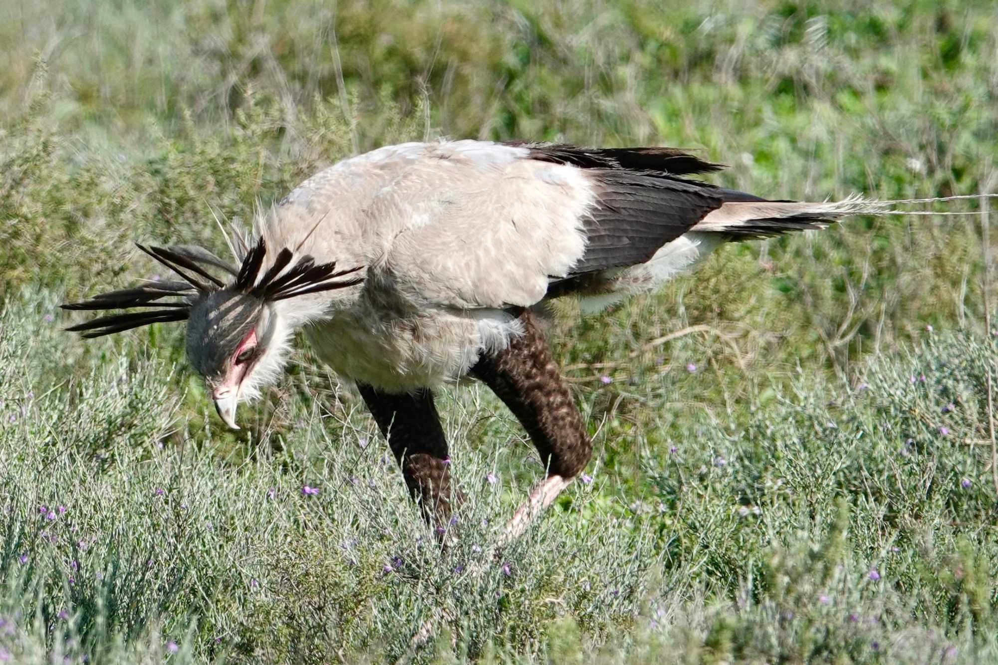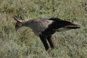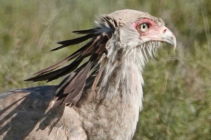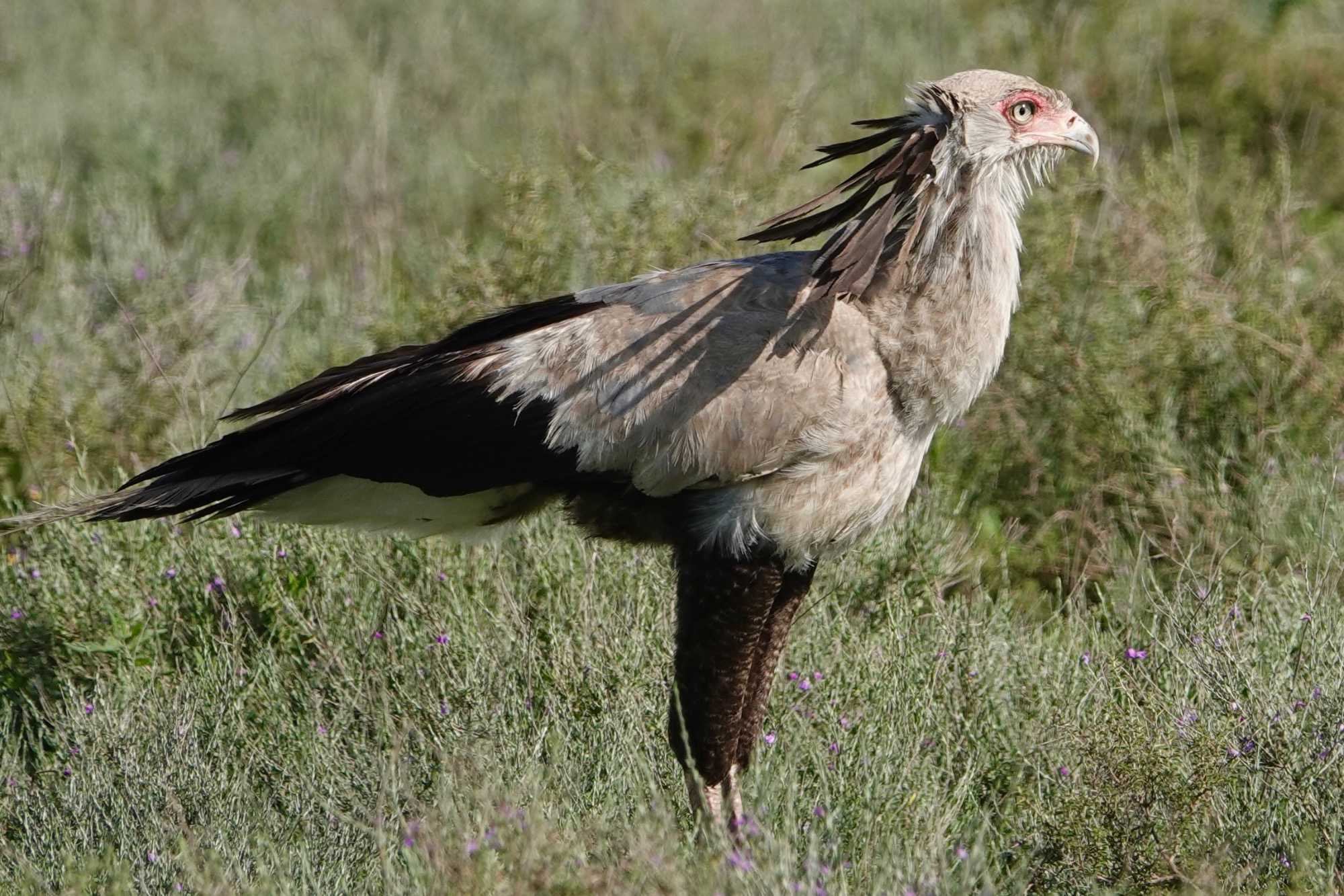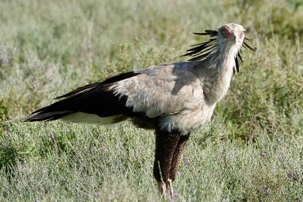 Nous apercevons aussi un oiseau fascinant : l’oiseau secrétaire. Grand rapace terrestre aux longues pattes fines, reconnaissable à la touffe de plumes noires à l’arrière de sa tête, il doit son nom aux secrétaires d’autrefois qui glissaient un stylo derrière leur oreille. Il chasse principalement les serpents et se déplace avec une démarche presque théâtrale dans les plaines ouvertes.