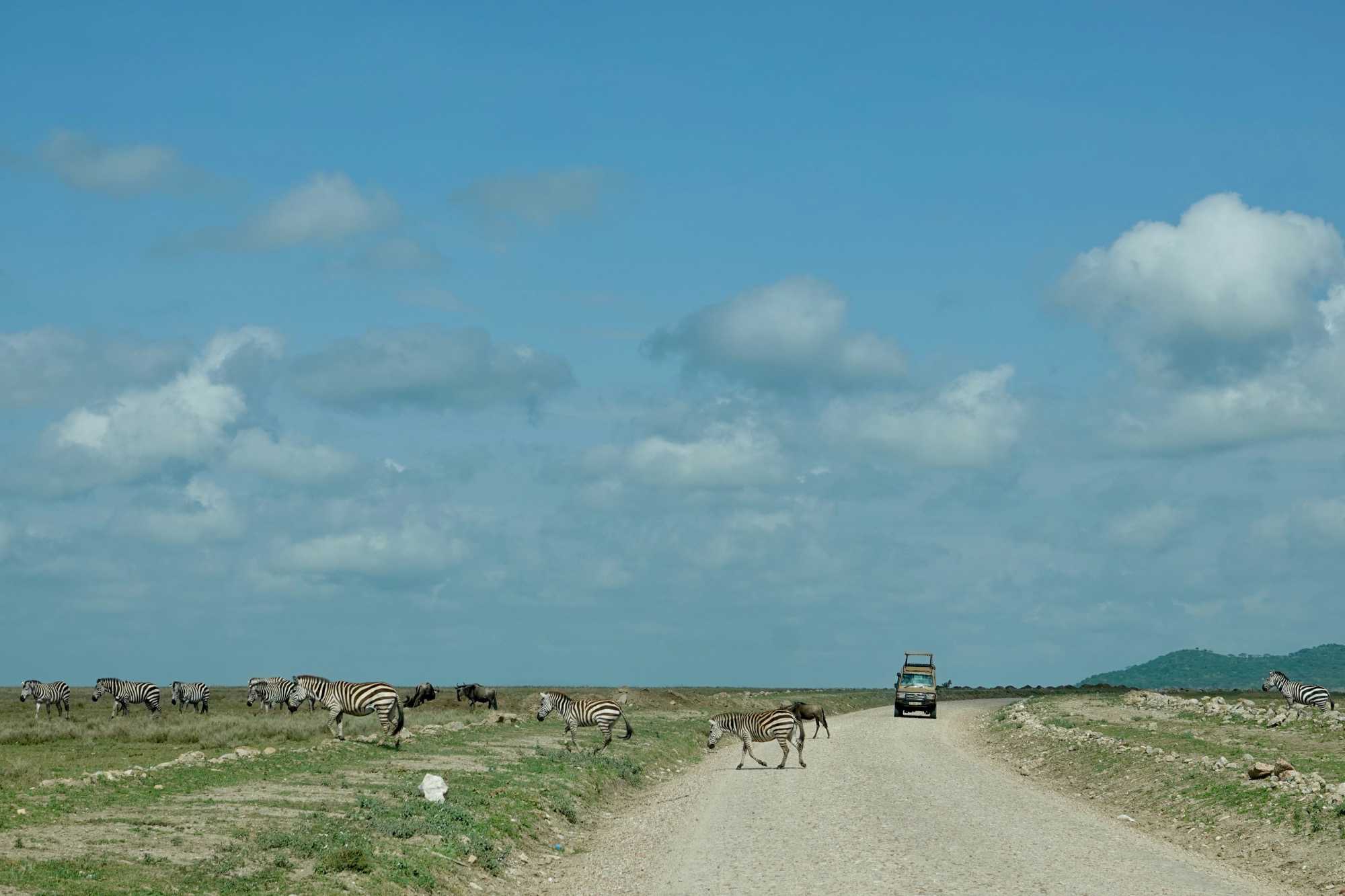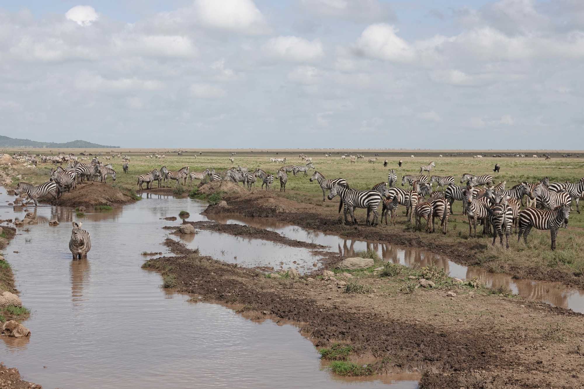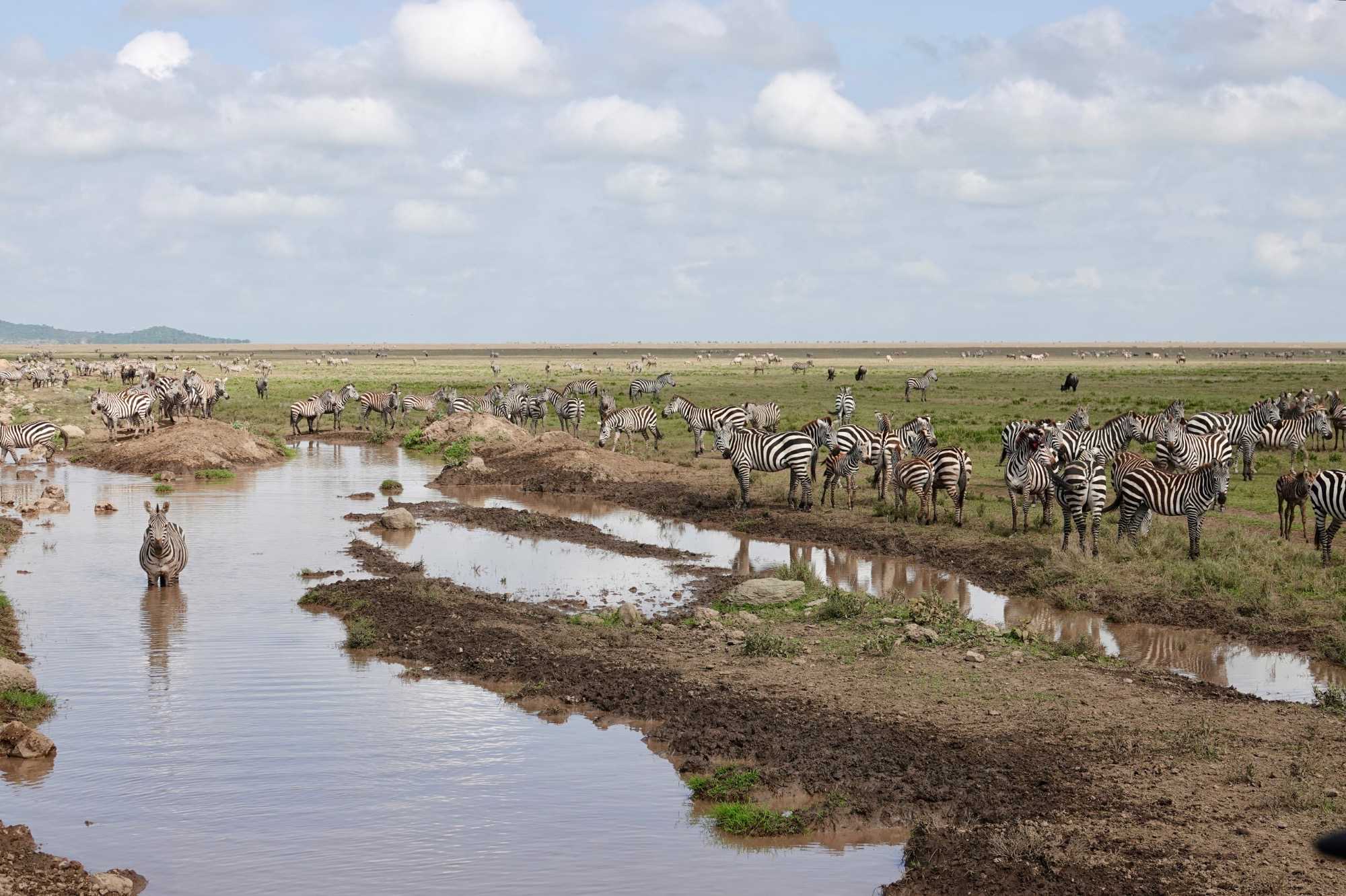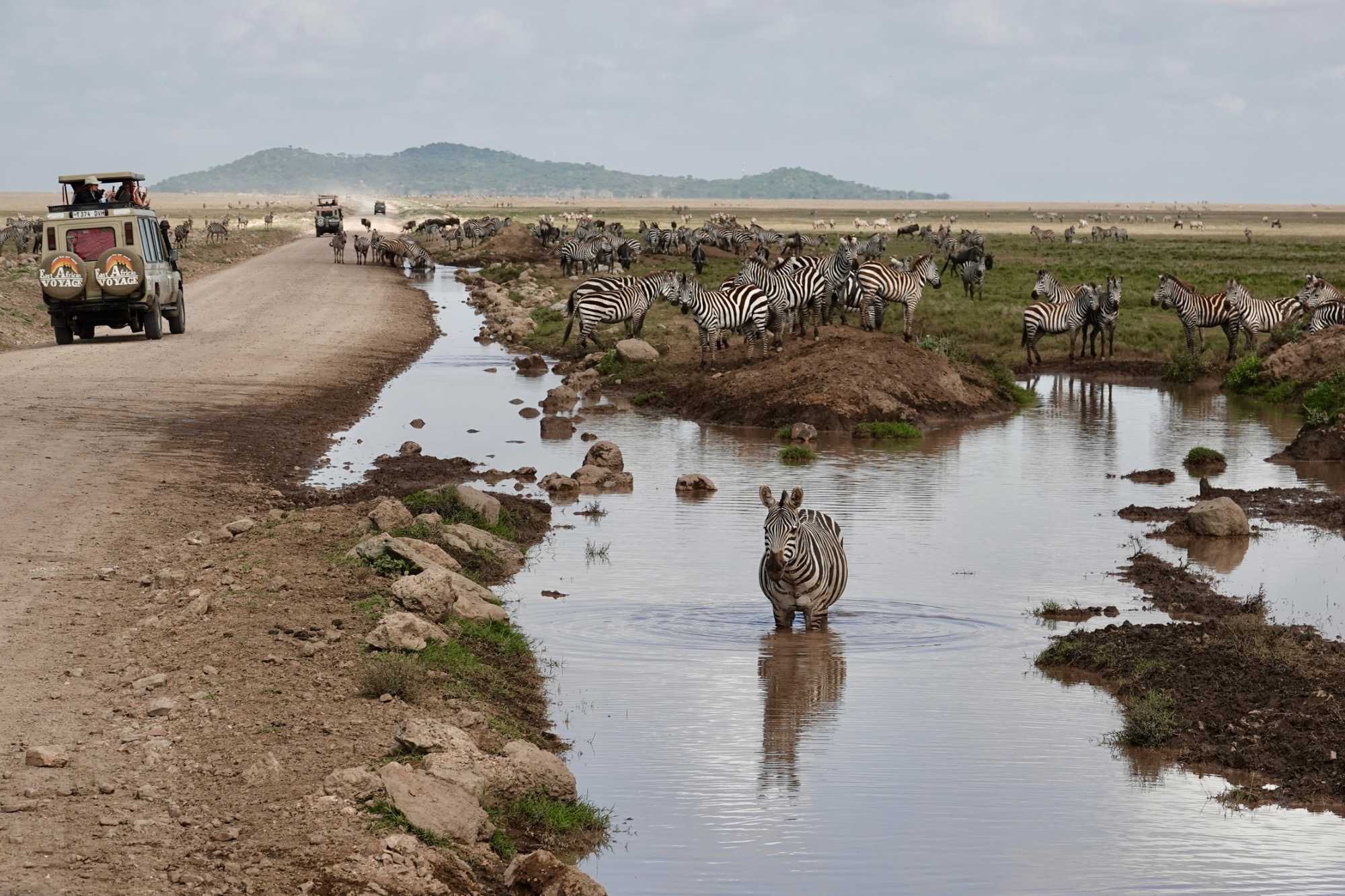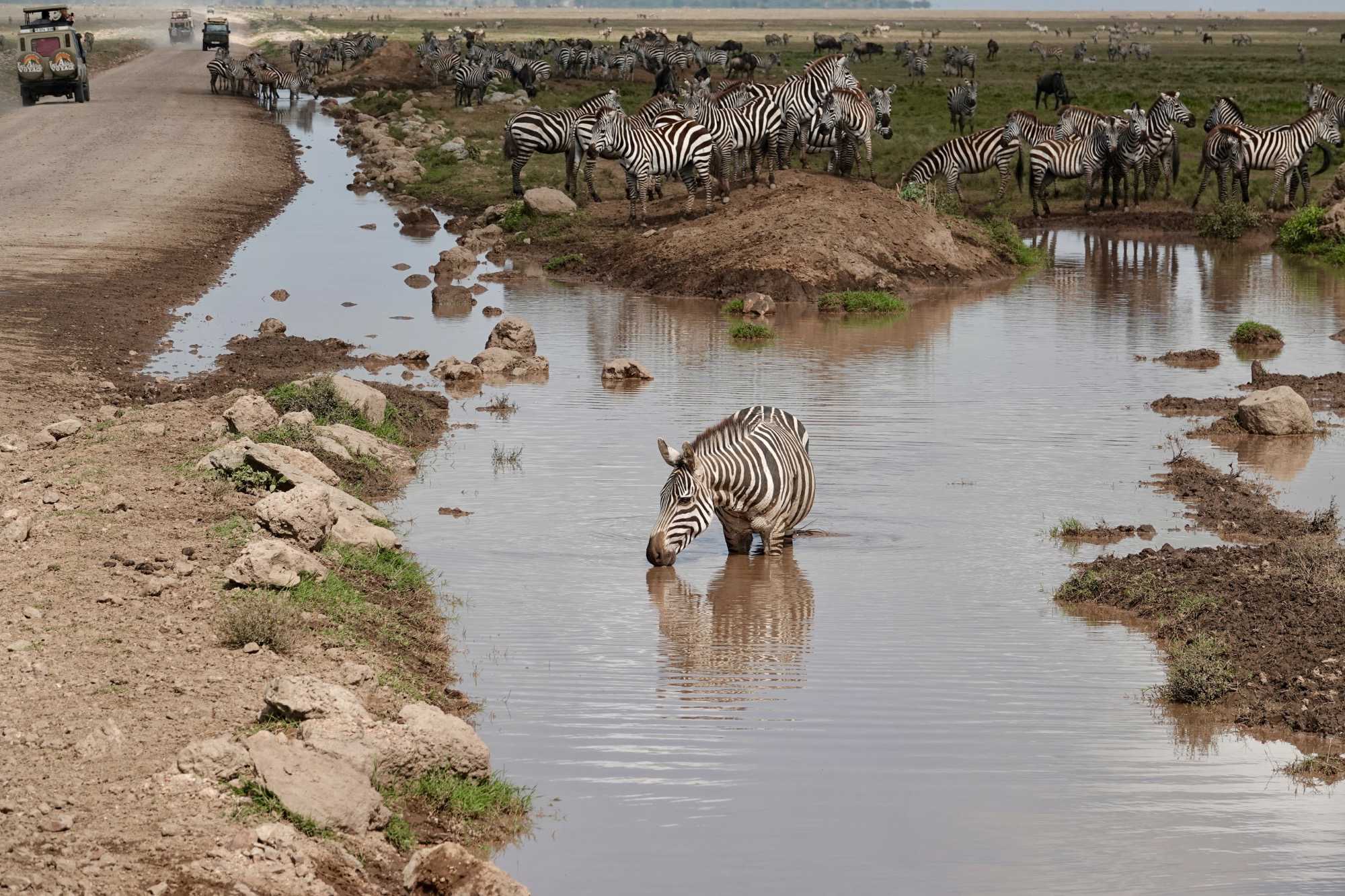 Avant même d’atteindre l’entrée officielle du Serengeti, nous traversons d’immenses groupes de zèbres. À cette période de l’année, la concentration animalière est exceptionnelle. Les pluies récentes ont laissé des bassins d’eau dans lesquels se reflètent leurs silhouettes rayées. Les photos sont splendides. Des zèbres à perte de vue.