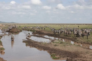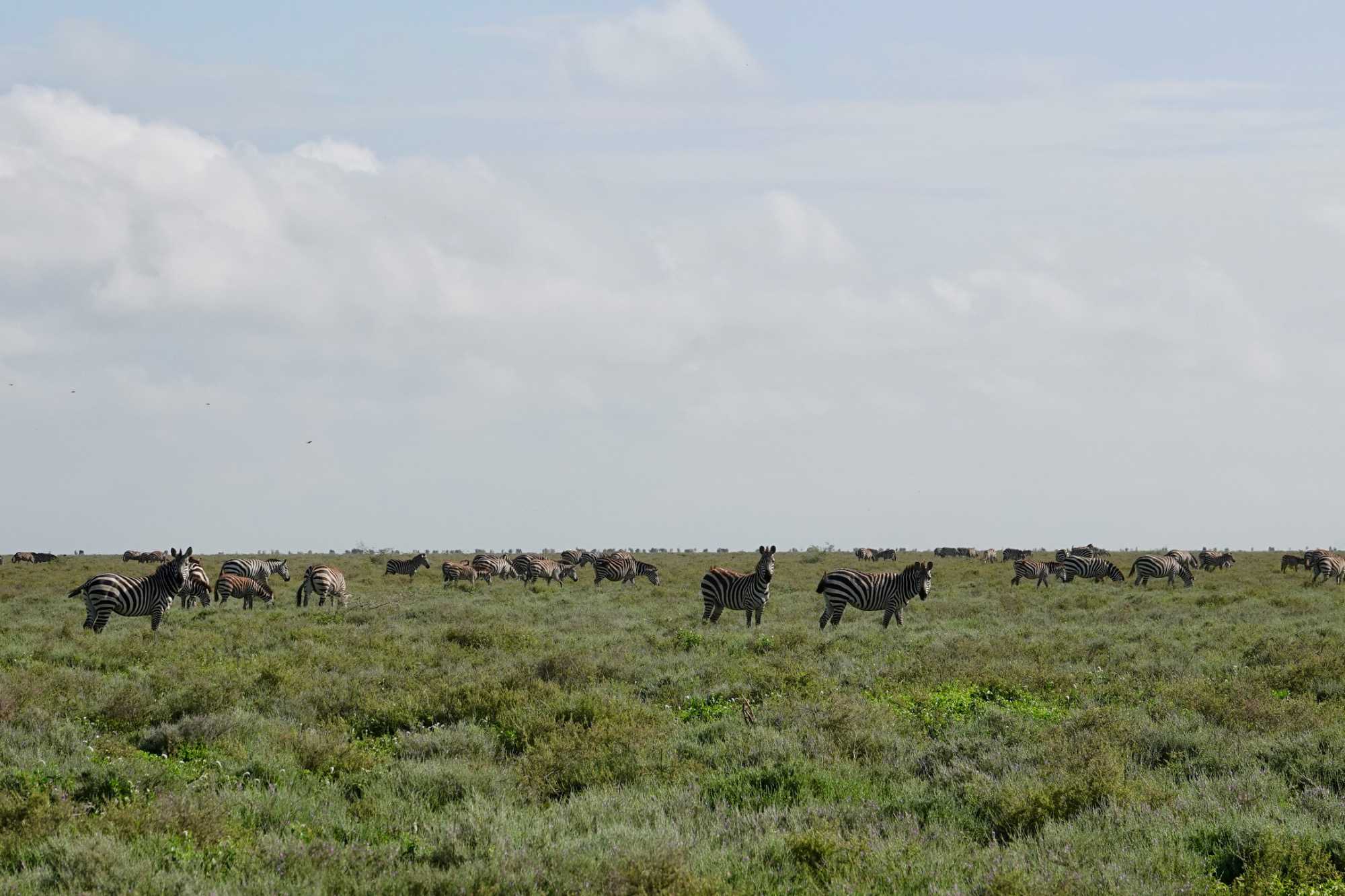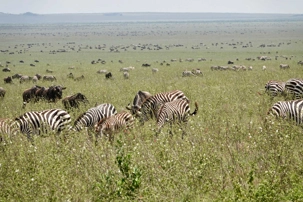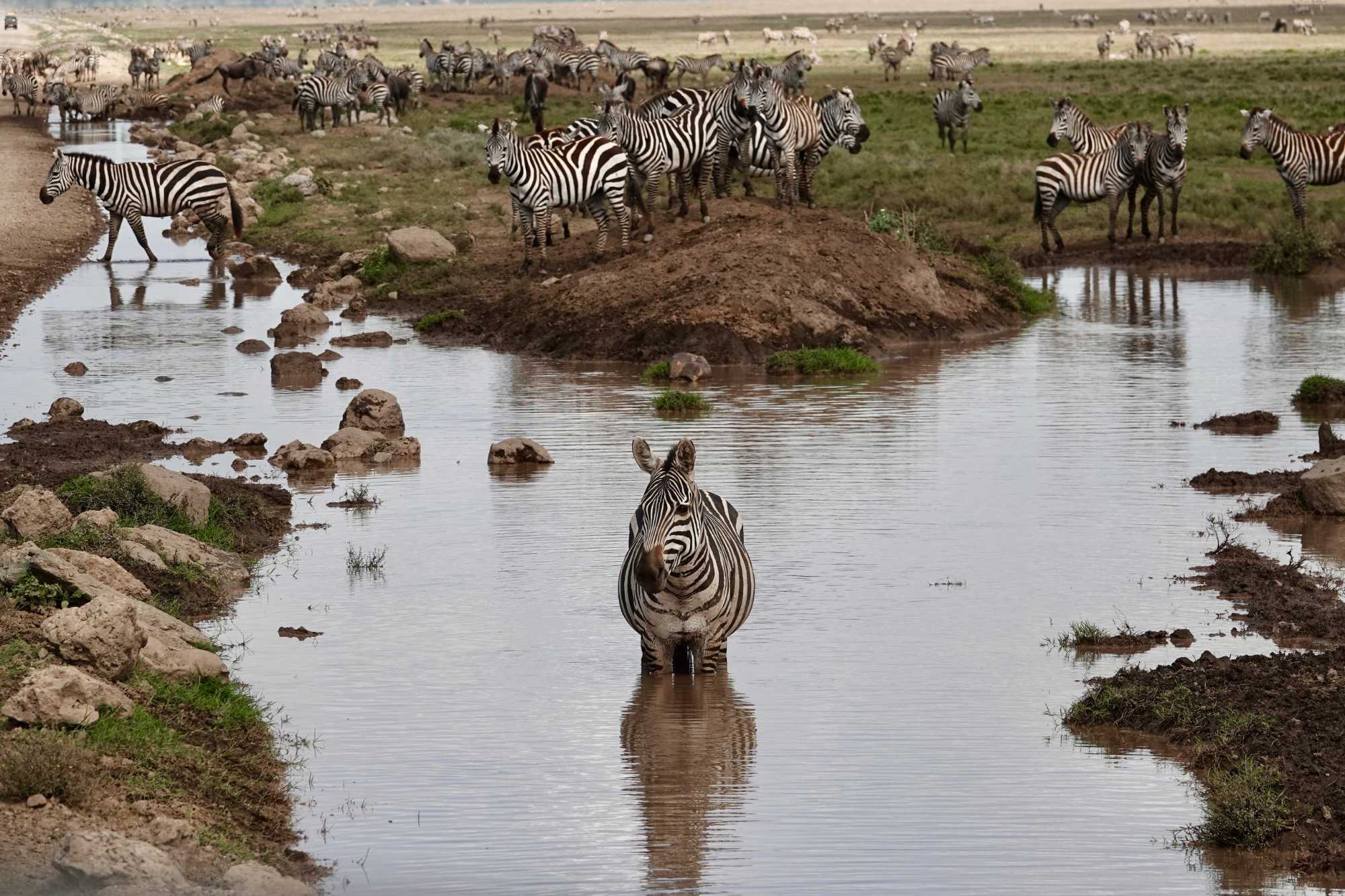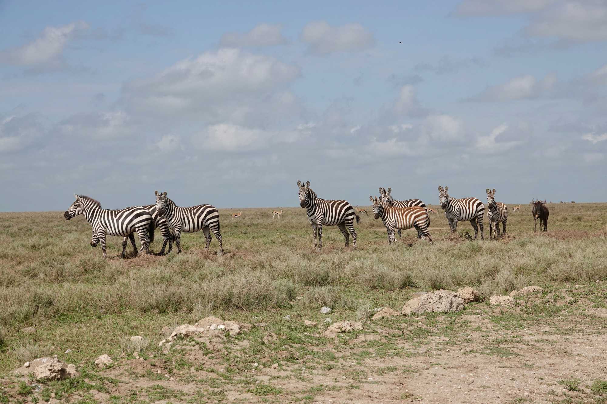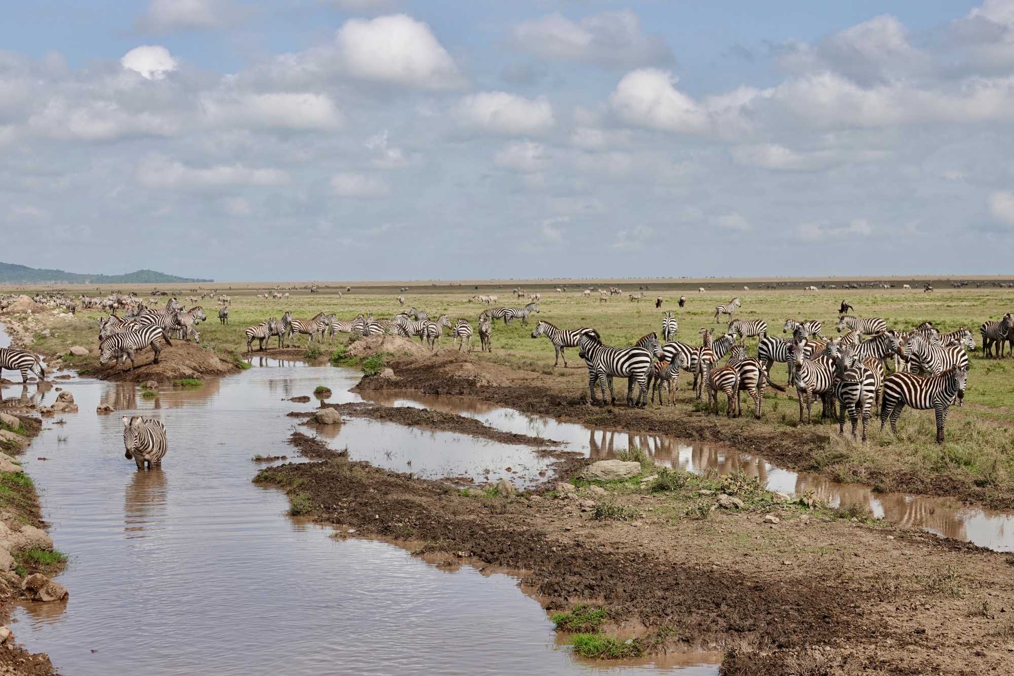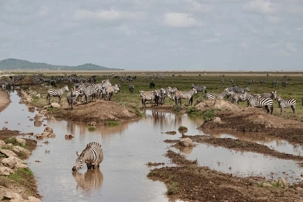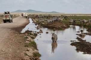 Avant même d’atteindre l’entrée officielle du Serengeti, nous traversons d’immenses groupes de zèbres. À cette période de l’année, la concentration animalière est exceptionnelle. Les pluies récentes ont laissé des bassins d’eau dans lesquels se reflètent leurs silhouettes rayées. Les photos sont splendides. Des zèbres à perte de vue.