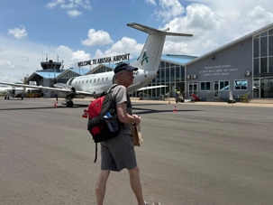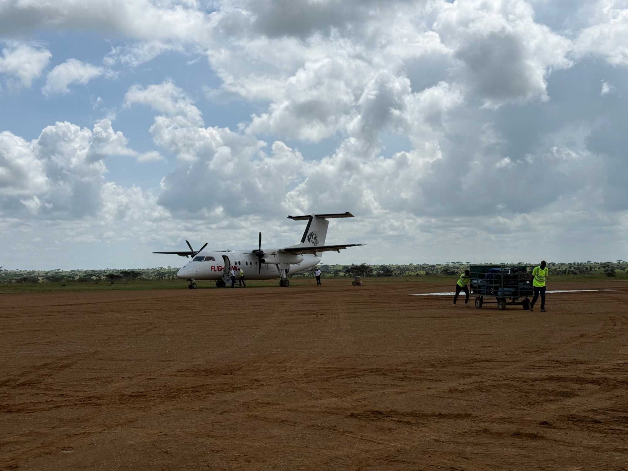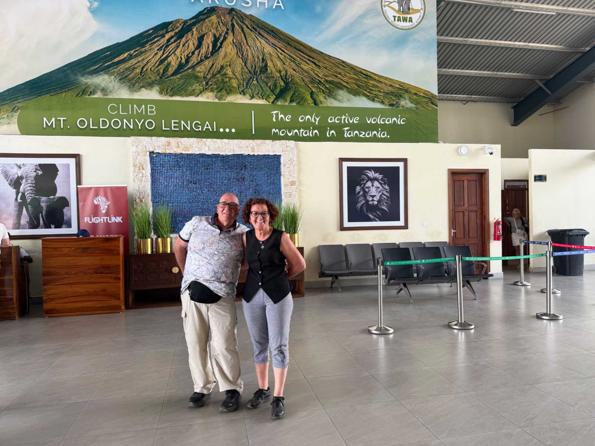 Nous arrivons au petit aérodrome du Serengeti pour notre vol prévu à 11 h 15. L’endroit est simple, efficace, parfaitement adapté aux voyageurs venus vivre l’expérience du safari sans devoir parcourir de longues heures de route. Plusieurs petites compagnies aériennes africaines y opèrent des vols quotidiens. Nous voyageons avec Flightlink à bord d’un Dash 8 de 37 passagers. Nous sommes 26 à prendre place à bord. L’enregistrement se déroule sans tracas. Ici, l’ambiance est détendue : les valises sont pesées — 20 kilos permis par bagage — et même si certains dépassent légèrement, tout se passe avec souplesse et bon sens. La sécurité est simple et rapide. Bouteilles d’eau et jus passent sans difficulté : on est bien loin des grands aéroports internationaux.