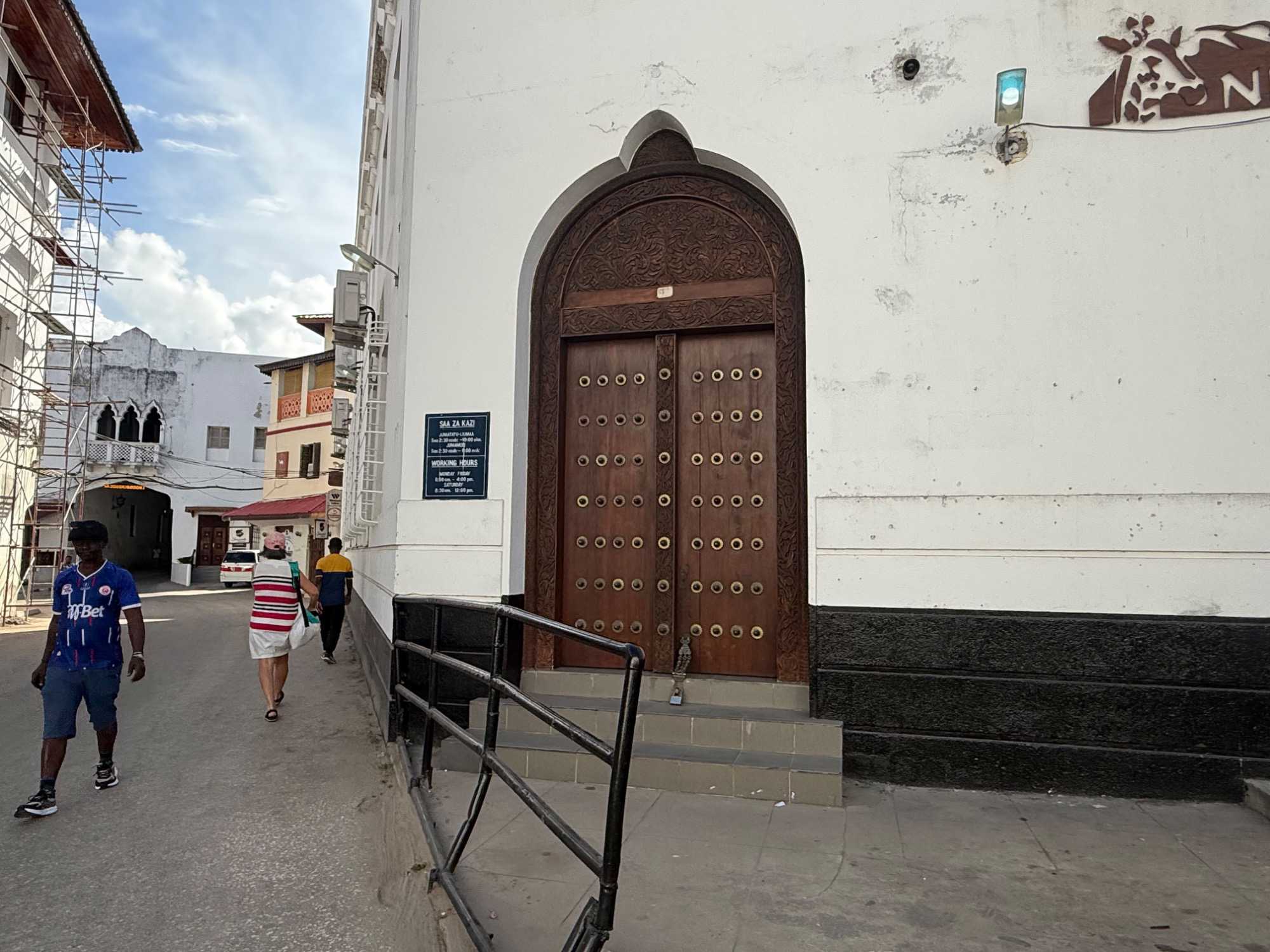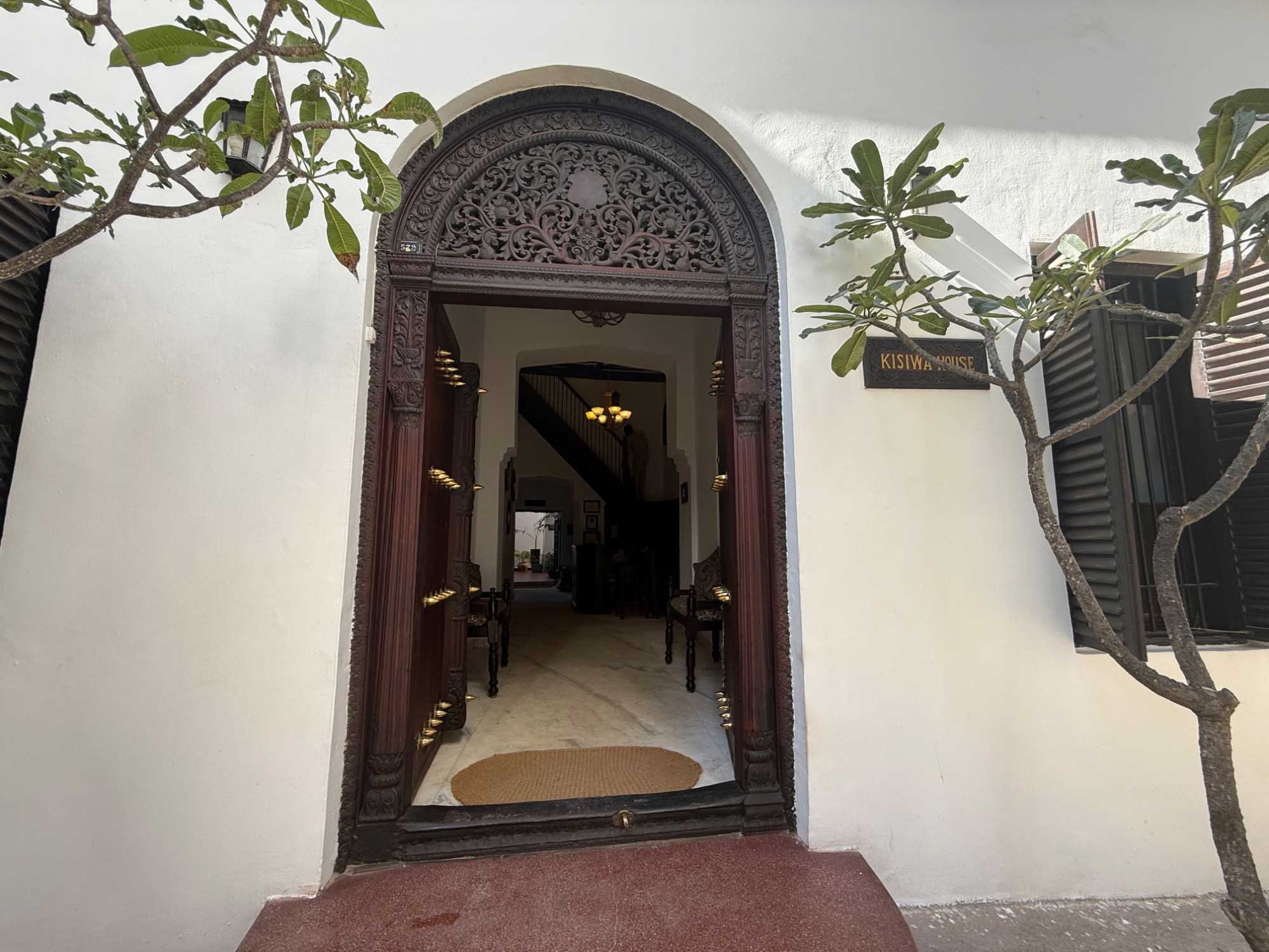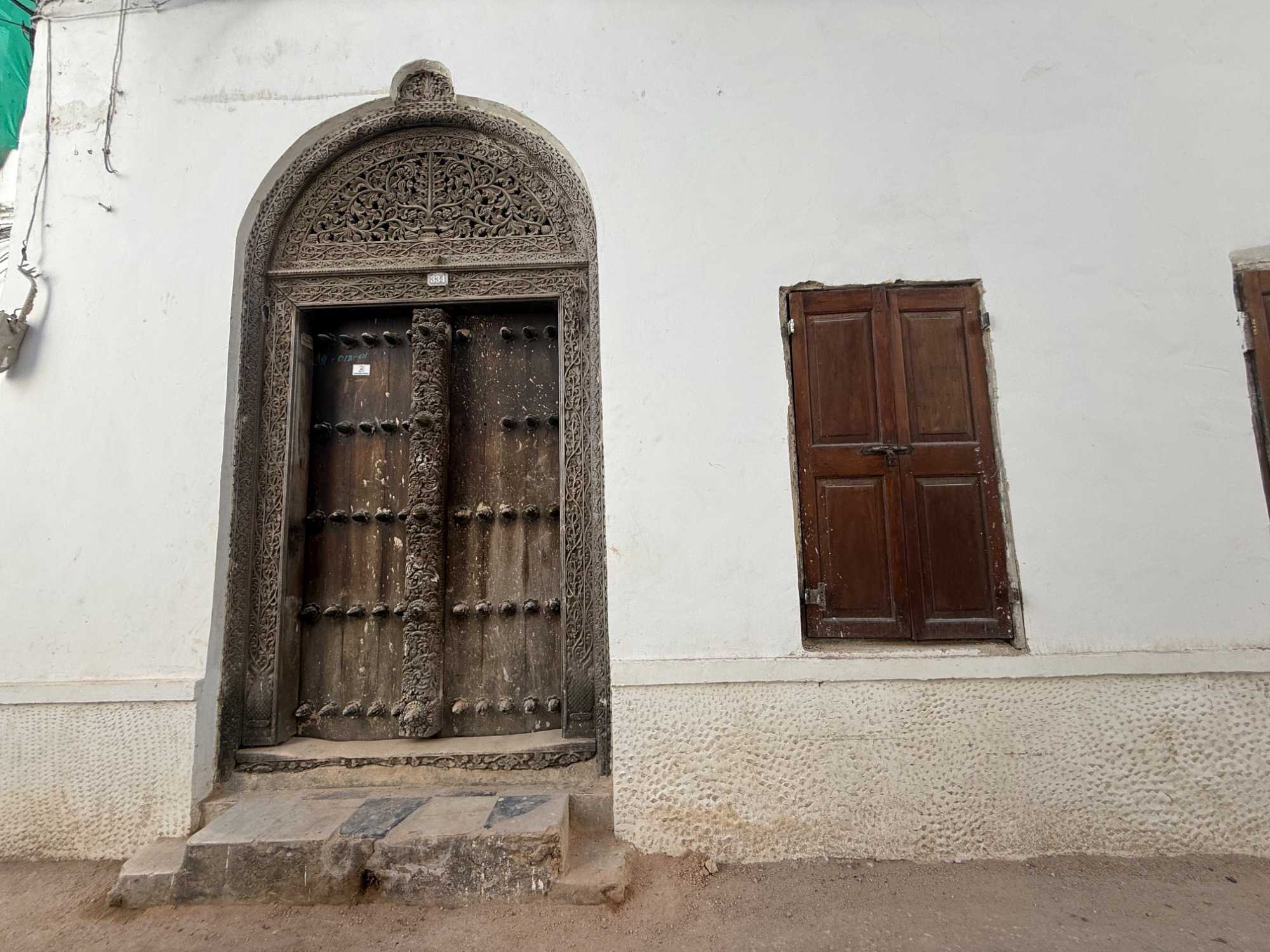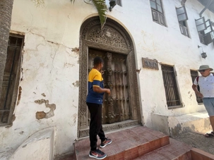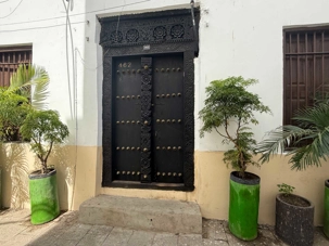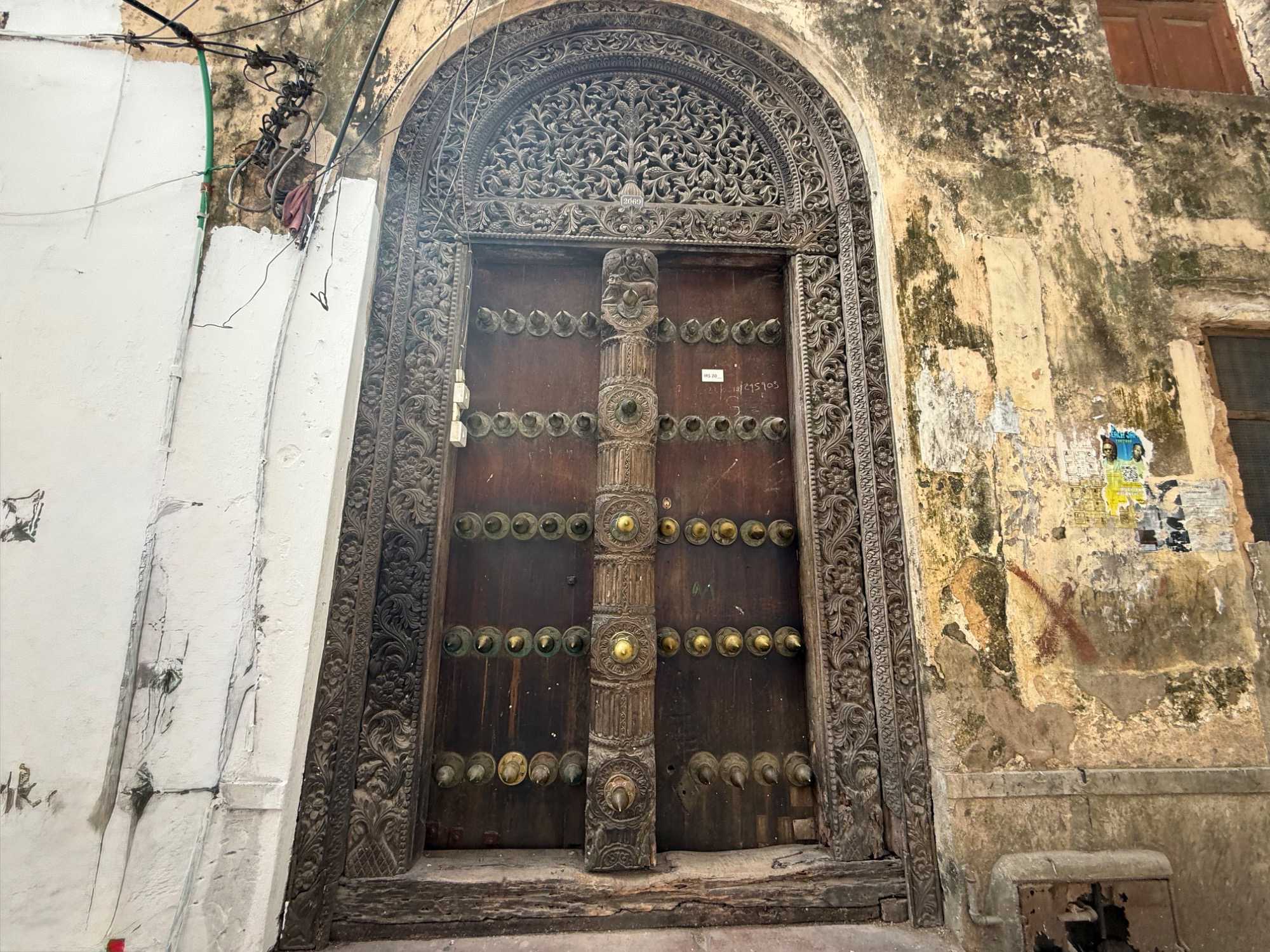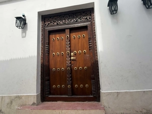 Stone Town, la vieille ville historique, tire son nom des maisons construites en pierre de corail au XIXᵉ siècle, remplaçant les habitations plus rudimentaires d’autrefois. Classée au patrimoine mondial de l’UNESCO, elle nous charme immédiatement par ses ruelles étroites, sinueuses et animées. Nous sommes fascinés par ses célèbres portes sculptées, véritables symboles de richesse et de statut social. Certaines, d’inspiration indienne, arborent des clous en laiton pointus. Contrairement à la légende souvent racontée, ces pics ne servaient pas à repousser des éléphants à Zanzibar — il n’y en a jamais eu sur l’île — mais cette tradition décorative vient d’Inde, où ils protégeaient les portes des charges d’éléphants. Les portes d’influence arabe, quant à elles, se distinguent par leurs motifs géométriques et leurs inscriptions coraniques.