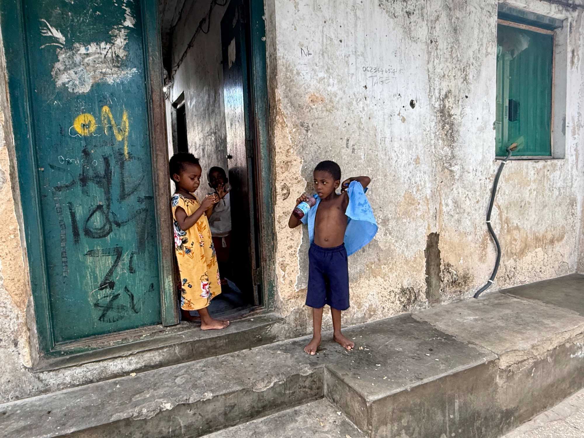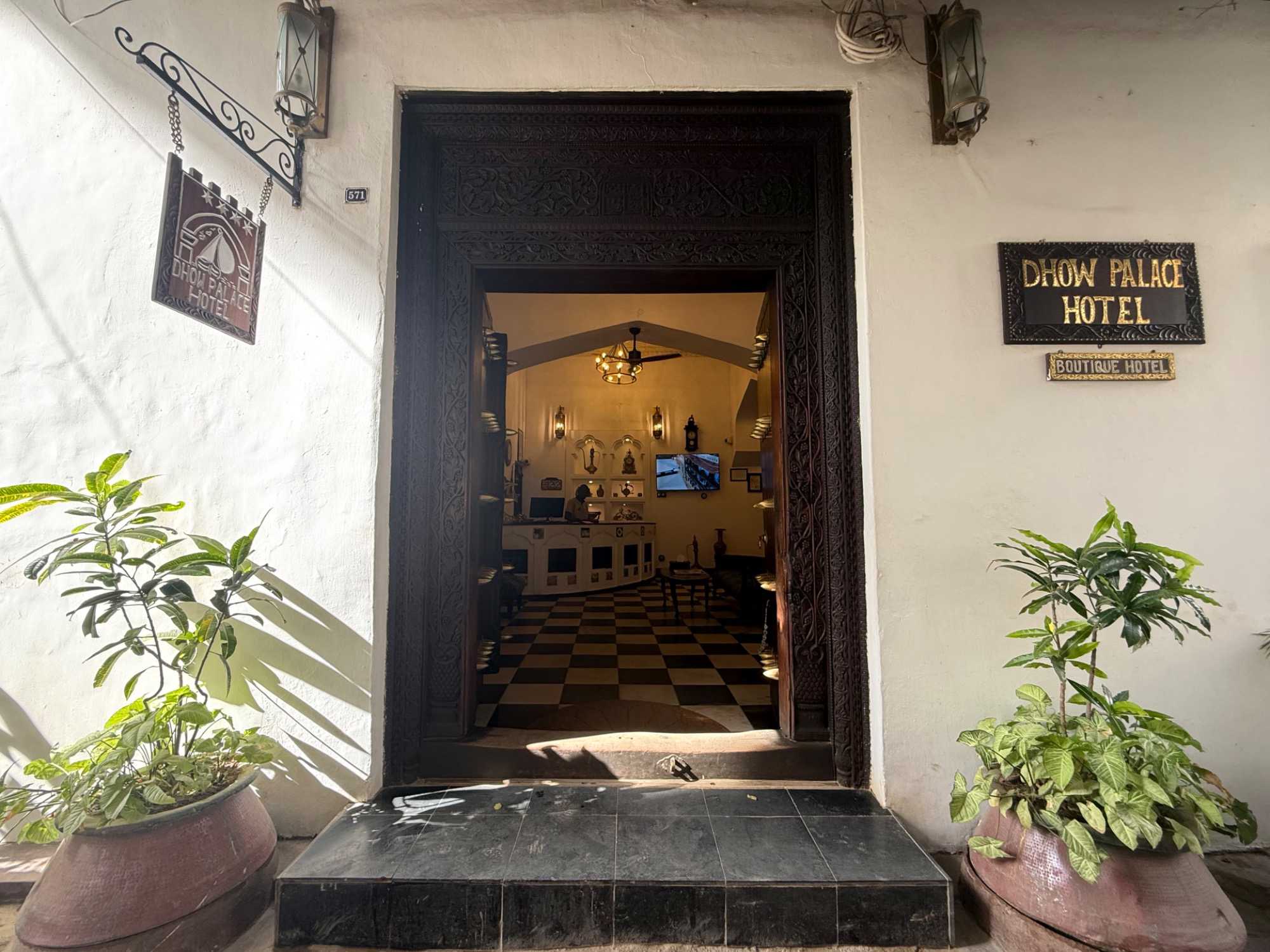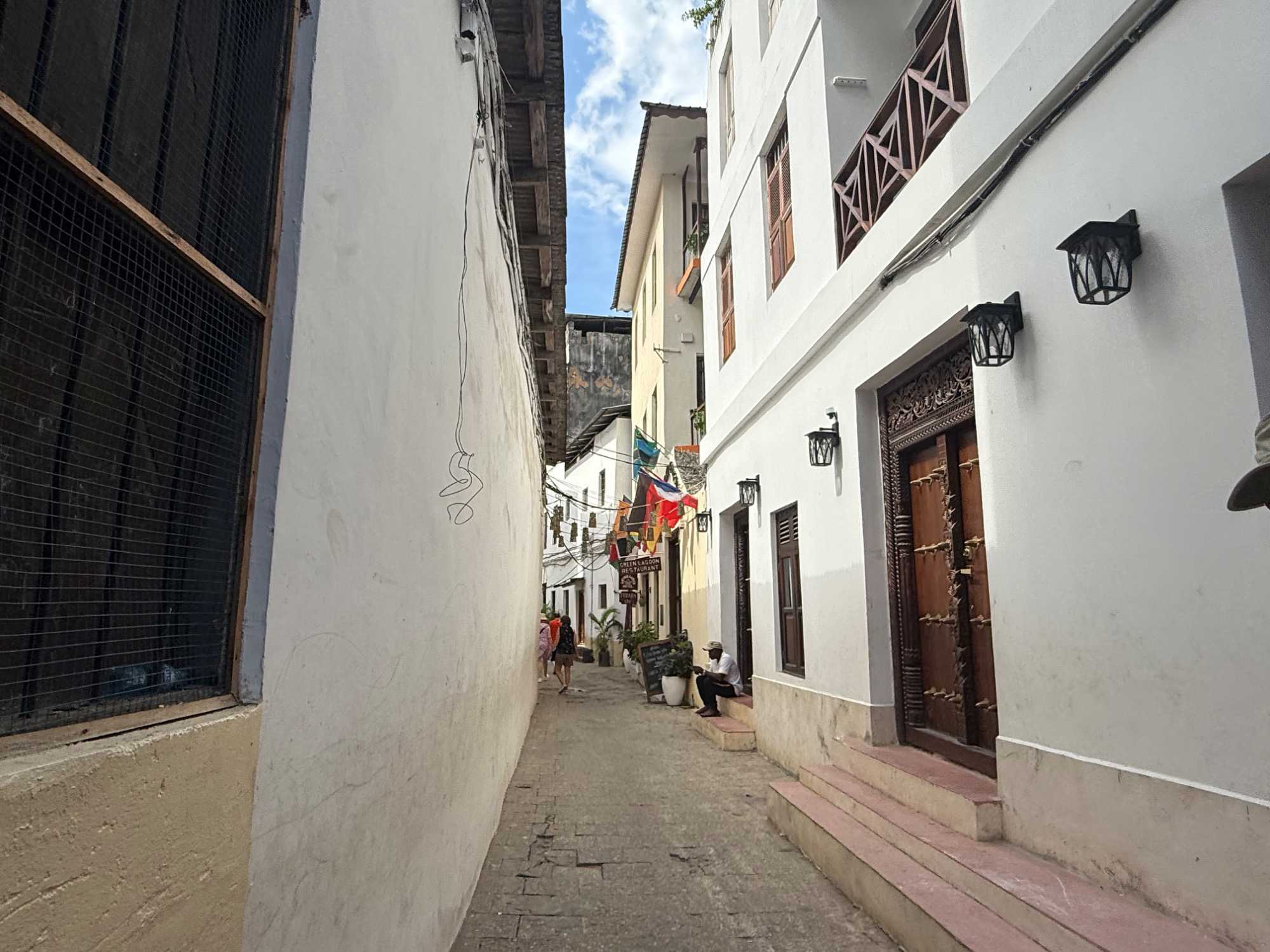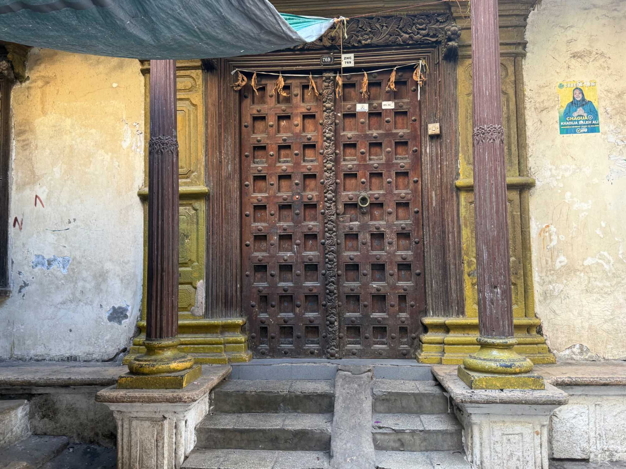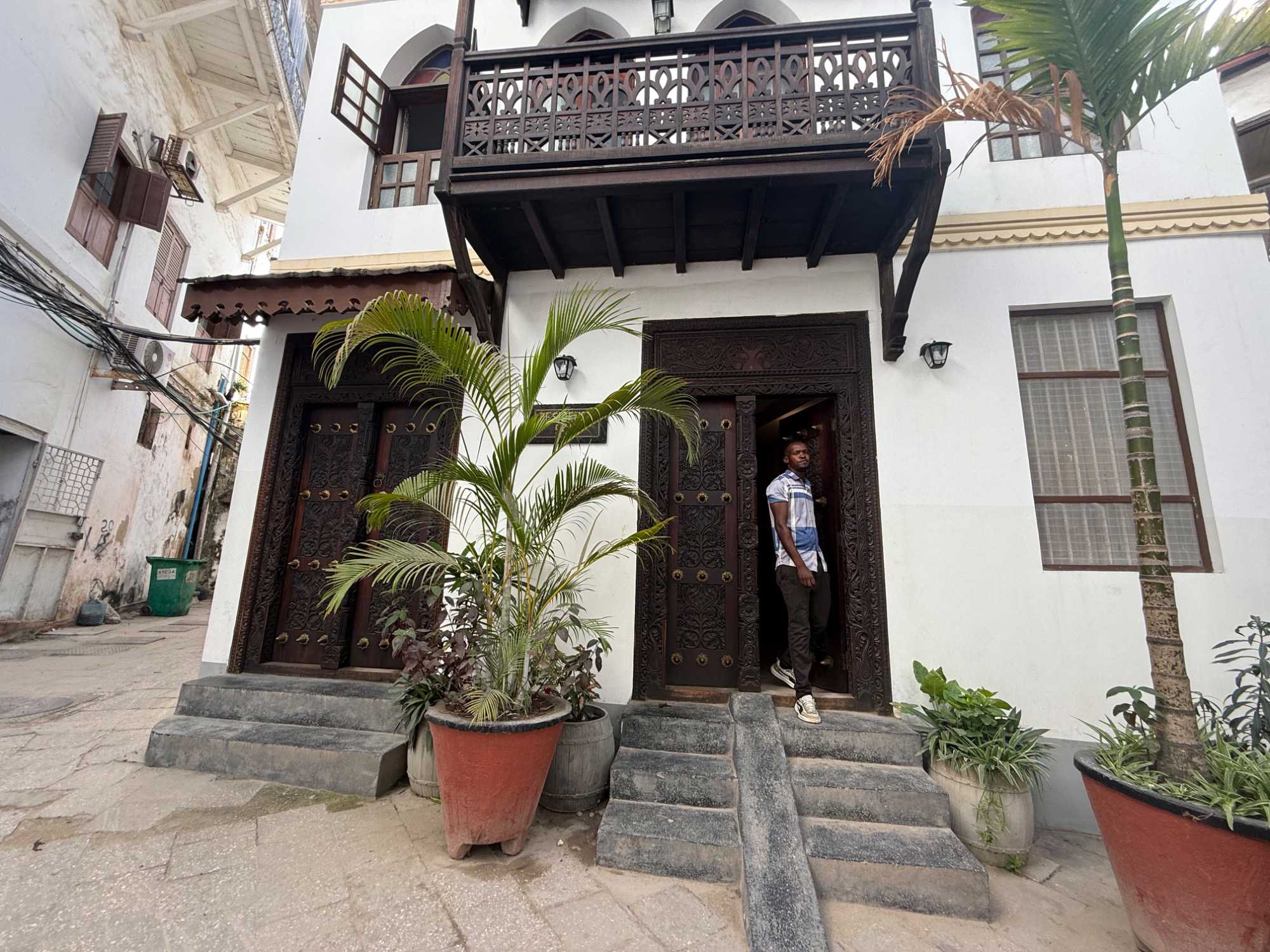 Stone Town, la vieille ville historique, tire son nom des maisons construites en pierre de corail au XIXᵉ siècle, remplaçant les habitations plus rudimentaires d’autrefois. Classée au patrimoine mondial de l’UNESCO, elle nous charme immédiatement par ses ruelles étroites, sinueuses et animées. Nous sommes fascinés par ses célèbres portes sculptées, véritables symboles de richesse et de statut social. Certaines, d’inspiration indienne, arborent des clous en laiton pointus. Contrairement à la légende souvent racontée, ces pics ne servaient pas à repousser des éléphants à Zanzibar — il n’y en a jamais eu sur l’île — mais cette tradition décorative vient d’Inde, où ils protégeaient les portes des charges d’éléphants. Les portes d’influence arabe, quant à elles, se distinguent par leurs motifs géométriques et leurs inscriptions coraniques.