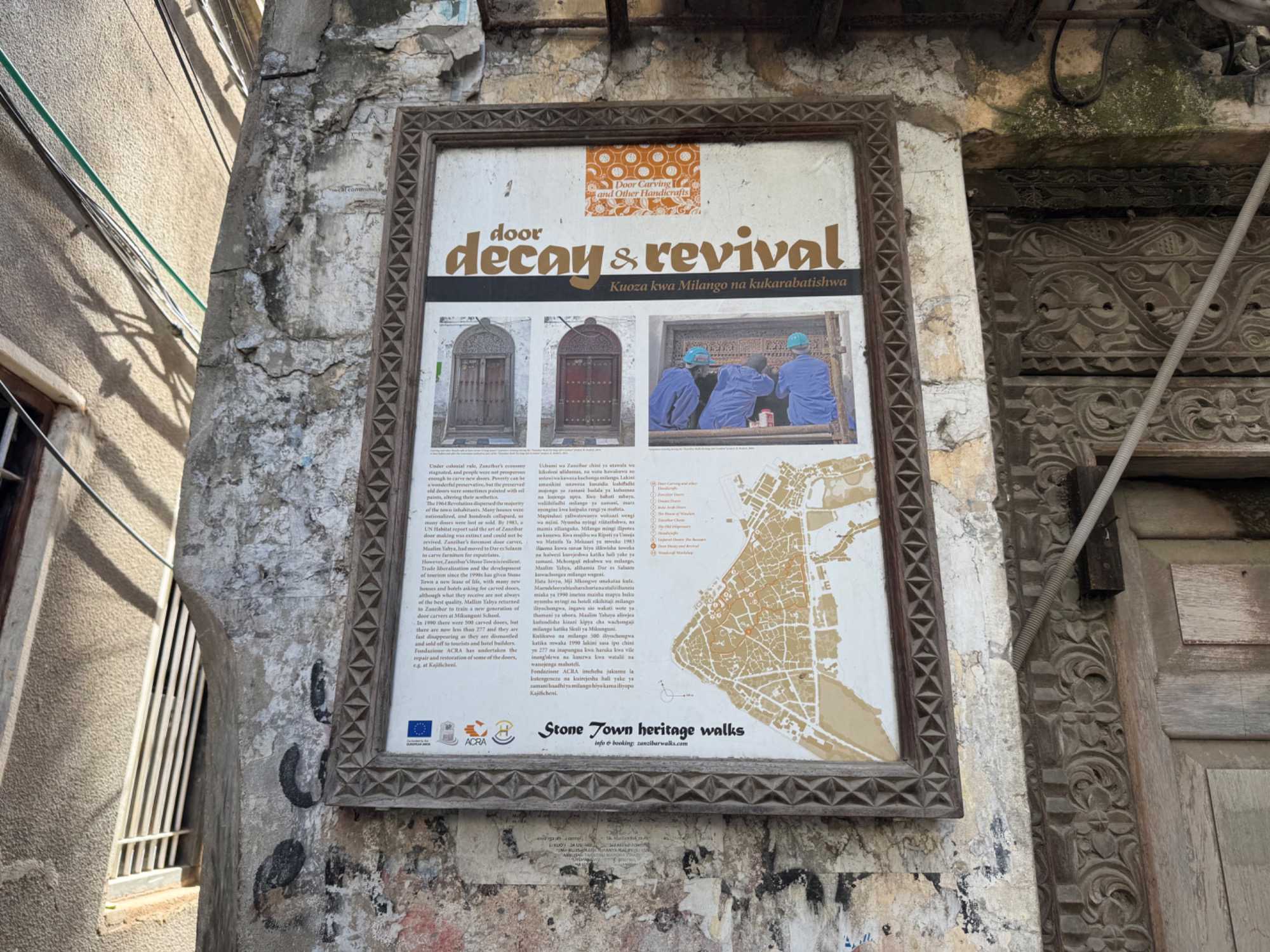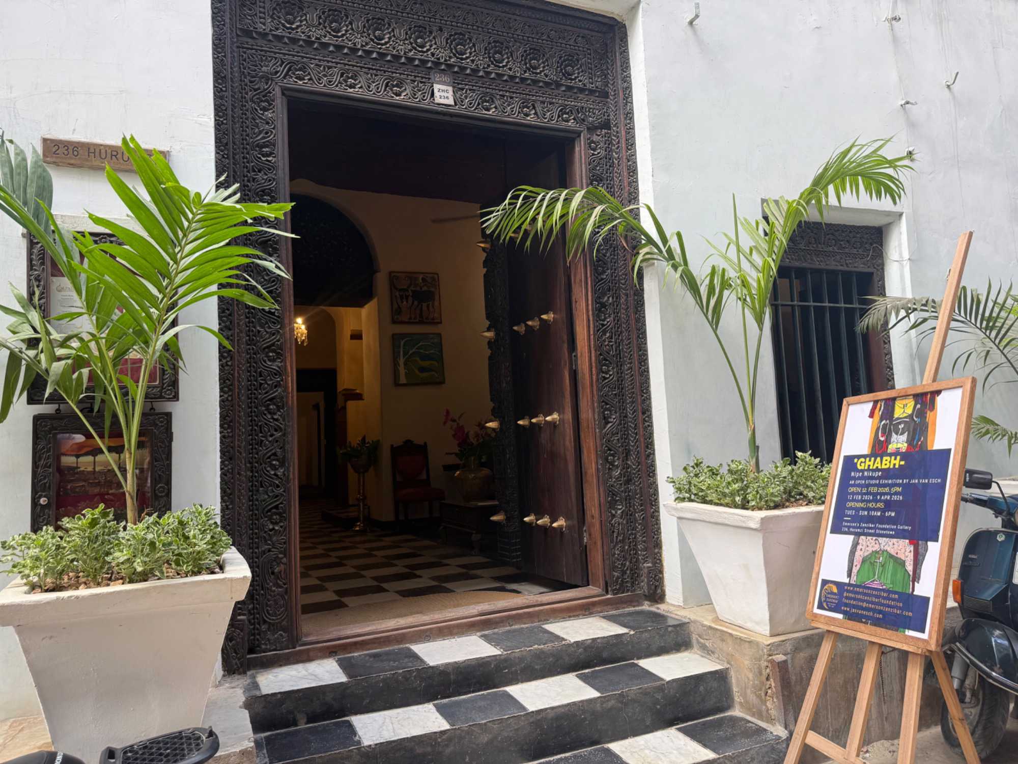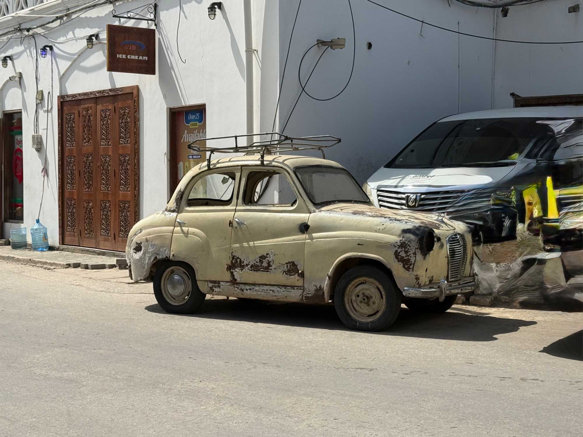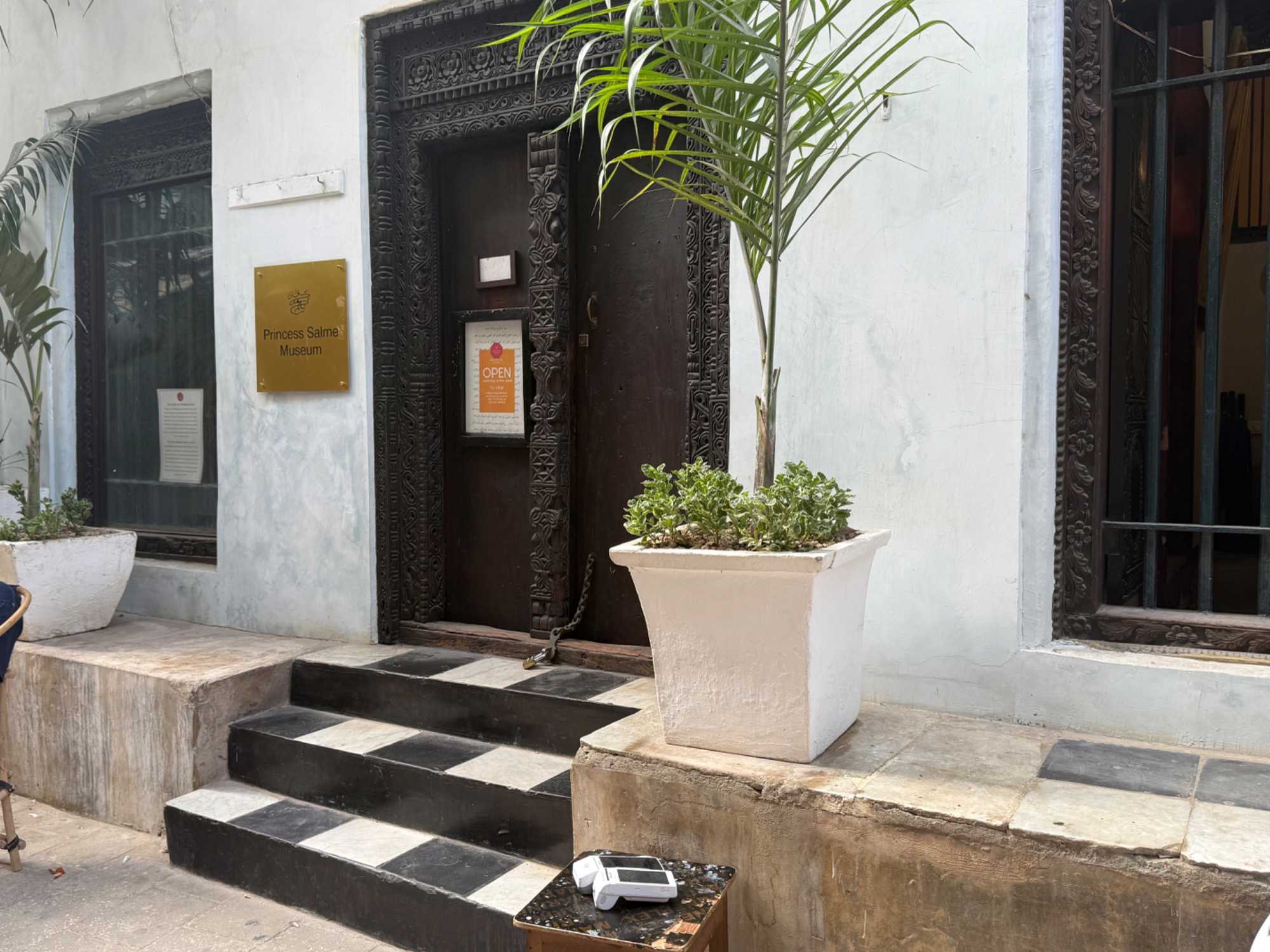 Stone Town, la vieille ville historique, tire son nom des maisons construites en pierre de corail au XIXᵉ siècle, remplaçant les habitations plus rudimentaires d’autrefois. Classée au patrimoine mondial de l’UNESCO, elle nous charme immédiatement par ses ruelles étroites, sinueuses et animées. Nous sommes fascinés par ses célèbres portes sculptées, véritables symboles de richesse et de statut social. Certaines, d’inspiration indienne, arborent des clous en laiton pointus. Contrairement à la légende souvent racontée, ces pics ne servaient pas à repousser des éléphants à Zanzibar — il n’y en a jamais eu sur l’île — mais cette tradition décorative vient d’Inde, où ils protégeaient les portes des charges d’éléphants. Les portes d’influence arabe, quant à elles, se distinguent par leurs motifs géométriques et leurs inscriptions coraniques.