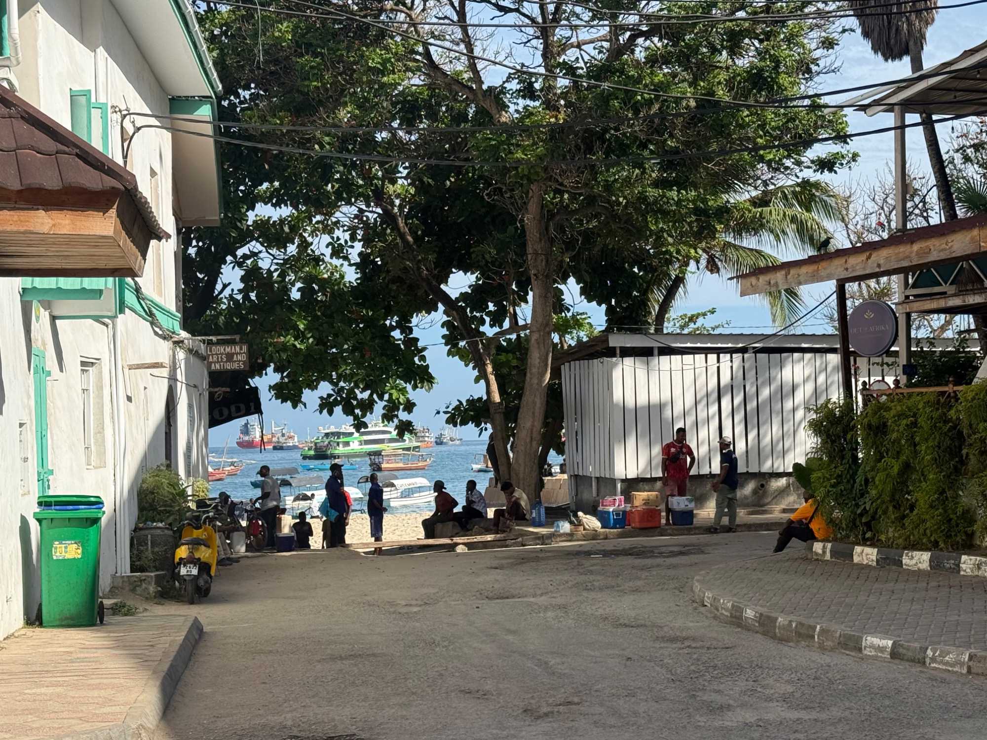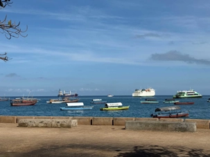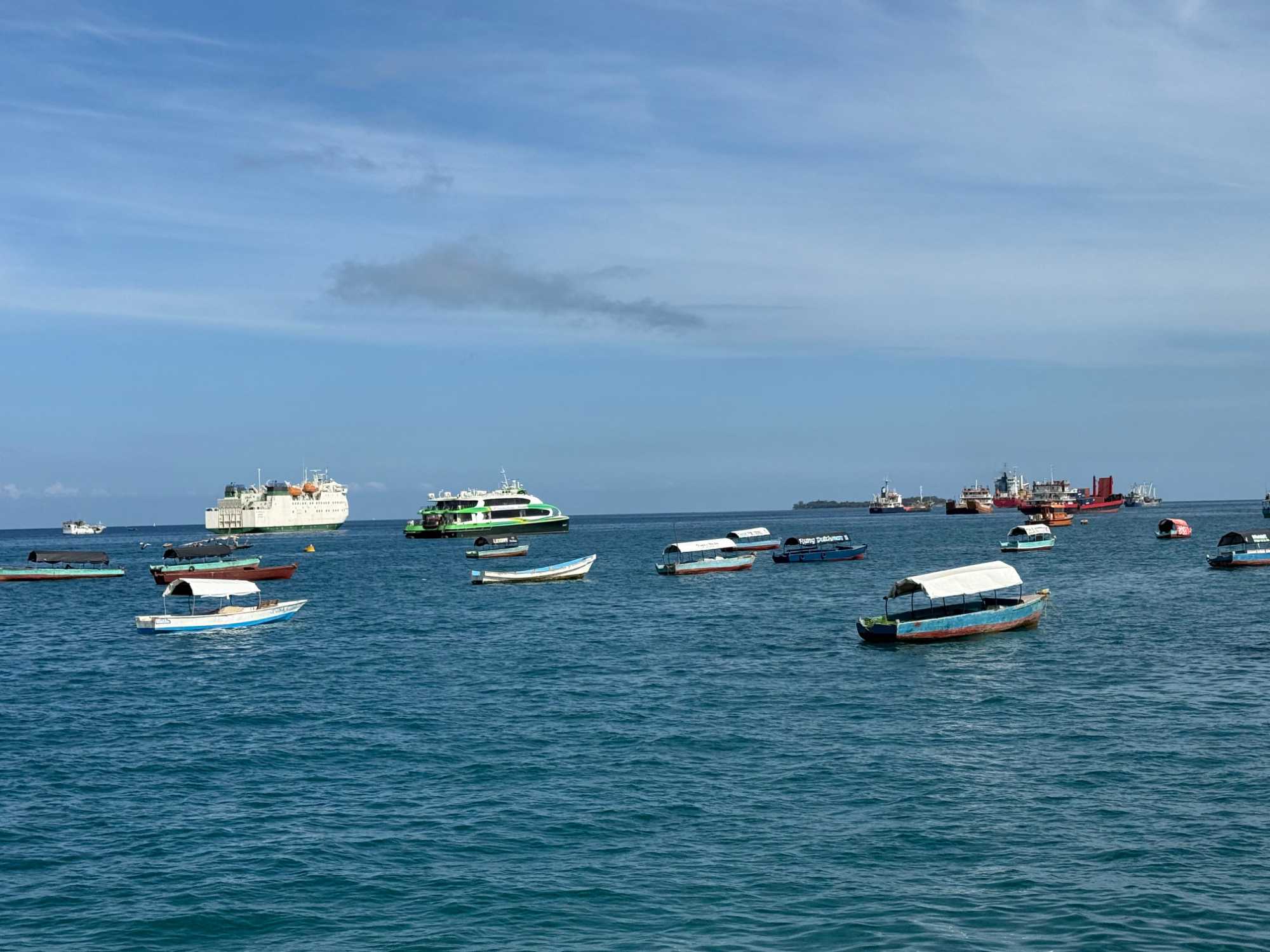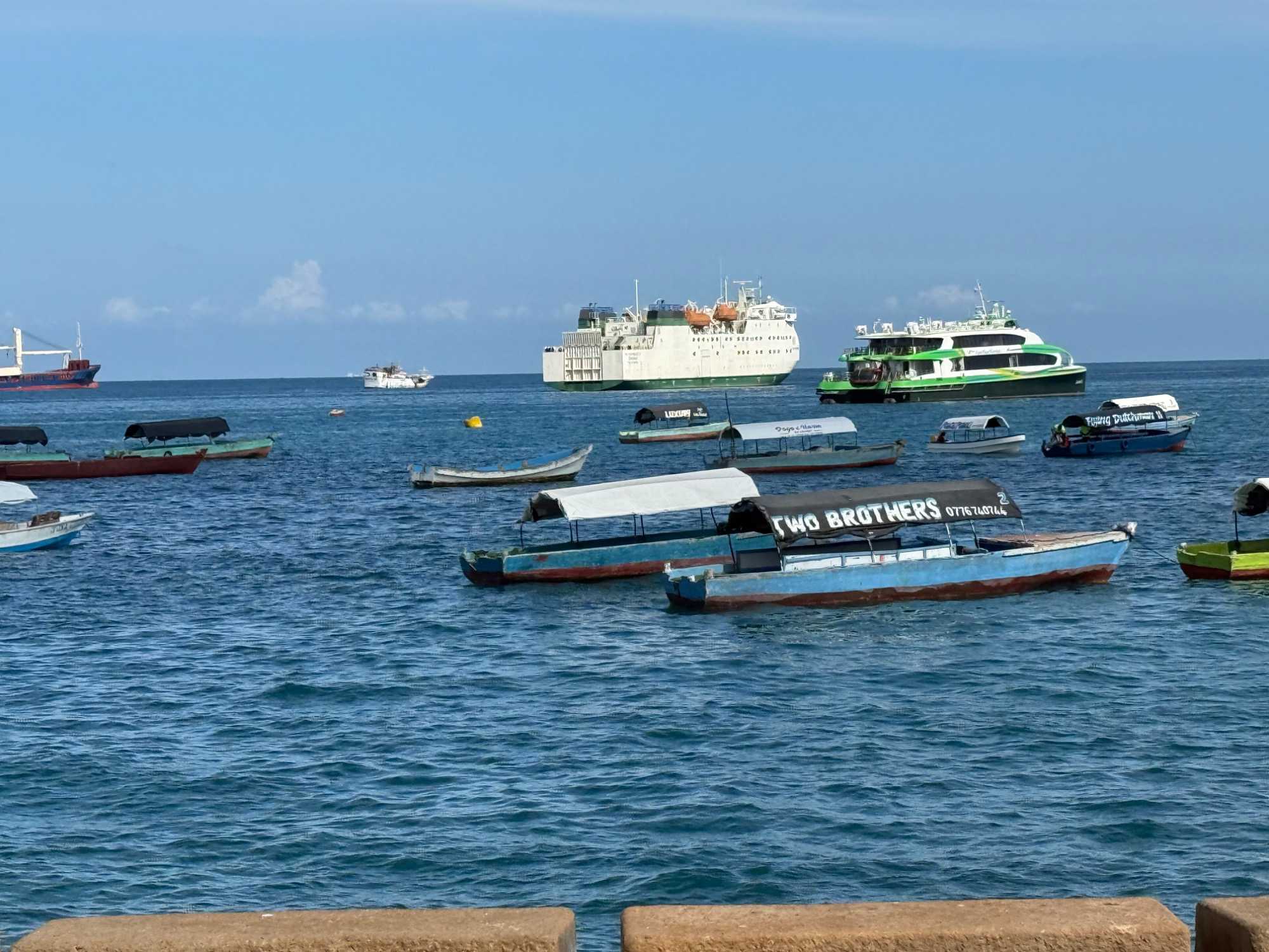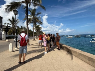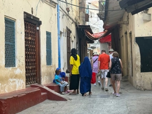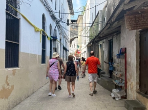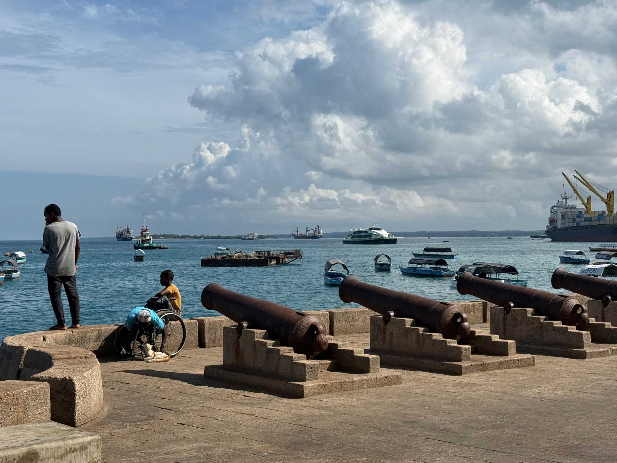 Nous visitons le Vieux Fort, construit par les Omanais au XVIIᵉ siècle pour repousser les Portugais, puis nous longeons le bord de mer où accostent les ferries reliant Zanzibar à Dar es Salaam ainsi qu’aux îles voisines. De nombreux petits bateaux transportent aussi les amateurs de plongée en apnée vers les récifs coralliens et les eaux cristallines peuplées de poissons tropicaux et de tortues. Nous immortalisons de magnifiques scènes de rue, croisons une multitude de chats — omniprésents dans la ville — et faisons quelques achats dans les boutiques locales.