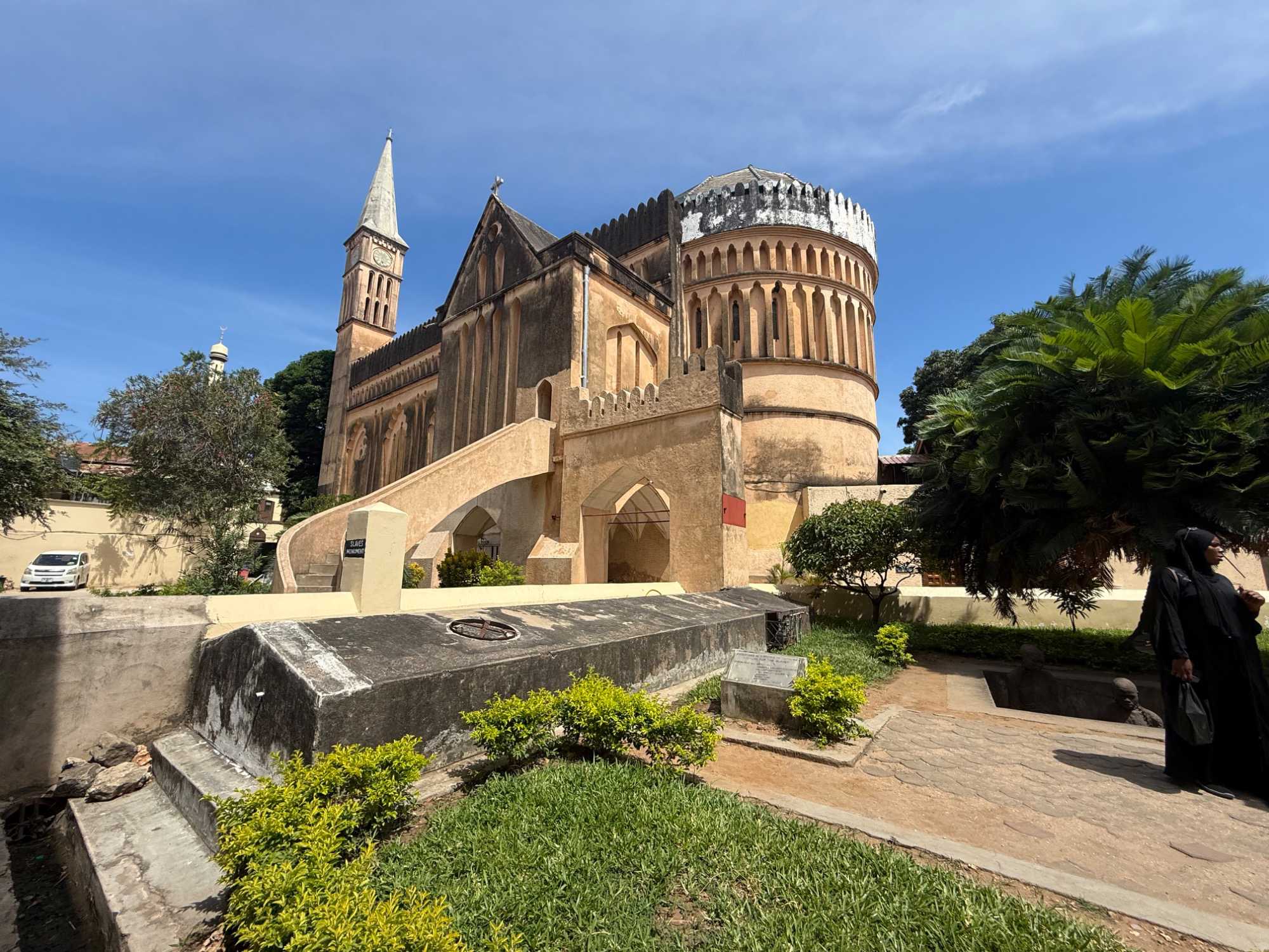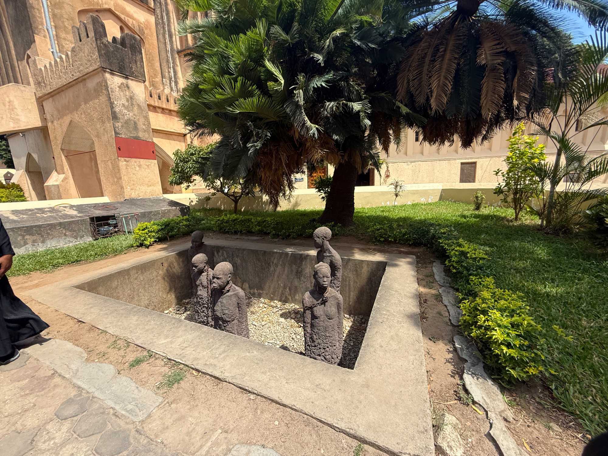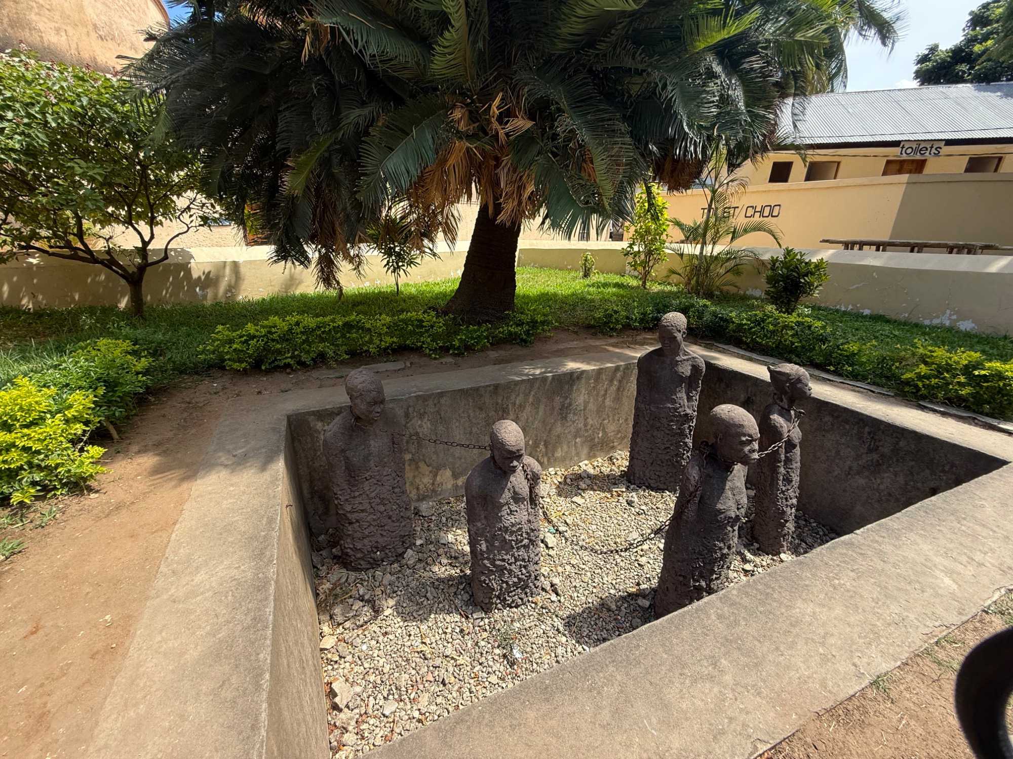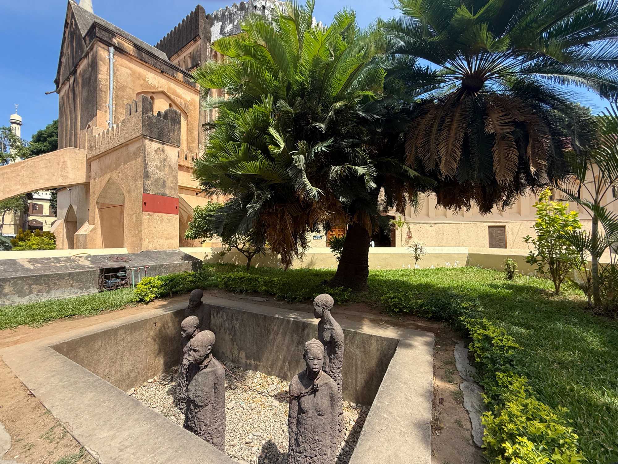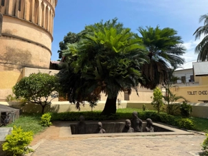 Le moment le plus marquant demeure toutefois la visite du site de l’ancien marché aux esclaves. Zanzibar fut l’un des centres majeurs du commerce d’esclaves en Afrique de l’Est au XIXᵉ siècle. Nous entrons dans l’église anglicane Christ Church, construite à l’endroit même où se trouvait autrefois le marché. En ce dimanche matin, la messe rassemble de nombreux fidèles. Les chants, en anglais et en swahili, résonnent avec intensité. À l’extérieur, la poignante statue des esclaves enchaînés — représentant cinq figures captives dans une fosse — rend hommage aux victimes de cette période sombre de l’histoire. L’émotion est palpable.