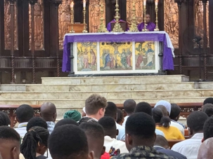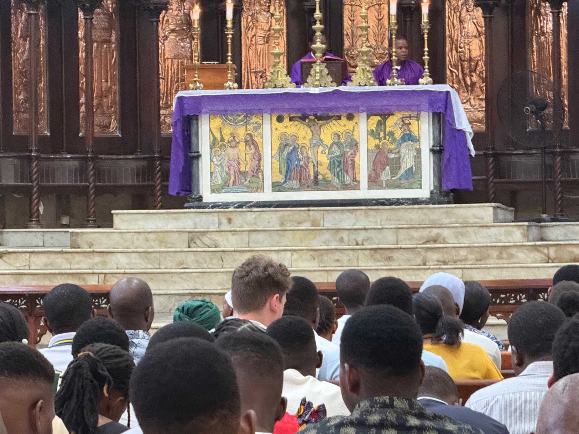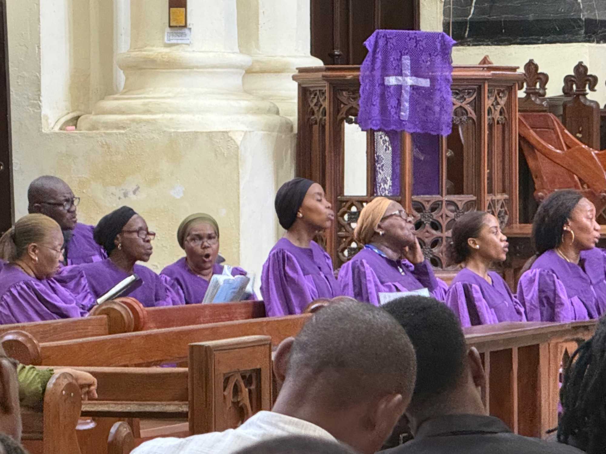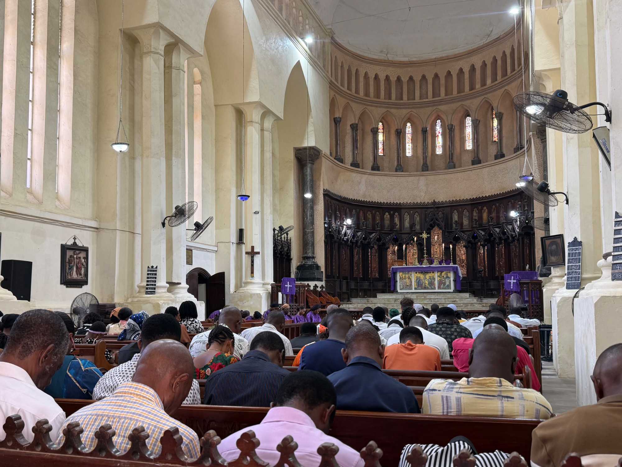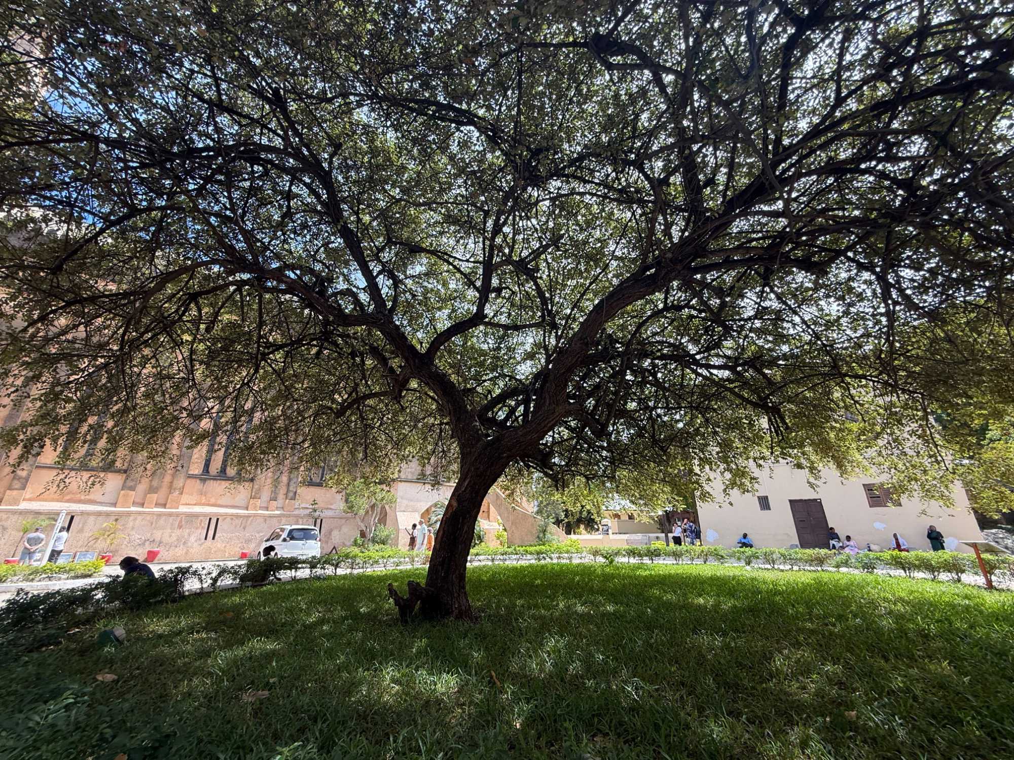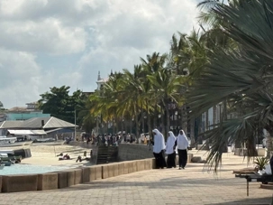 Le moment le plus marquant demeure toutefois la visite du site de l’ancien marché aux esclaves. Zanzibar fut l’un des centres majeurs du commerce d’esclaves en Afrique de l’Est au XIXᵉ siècle. Nous entrons dans l’église anglicane Christ Church, construite à l’endroit même où se trouvait autrefois le marché. En ce dimanche matin, la messe rassemble de nombreux fidèles. Les chants, en anglais et en swahili, résonnent avec intensité. À l’extérieur, la poignante statue des esclaves enchaînés — représentant cinq figures captives dans une fosse — rend hommage aux victimes de cette période sombre de l’histoire. L’émotion est palpable.
