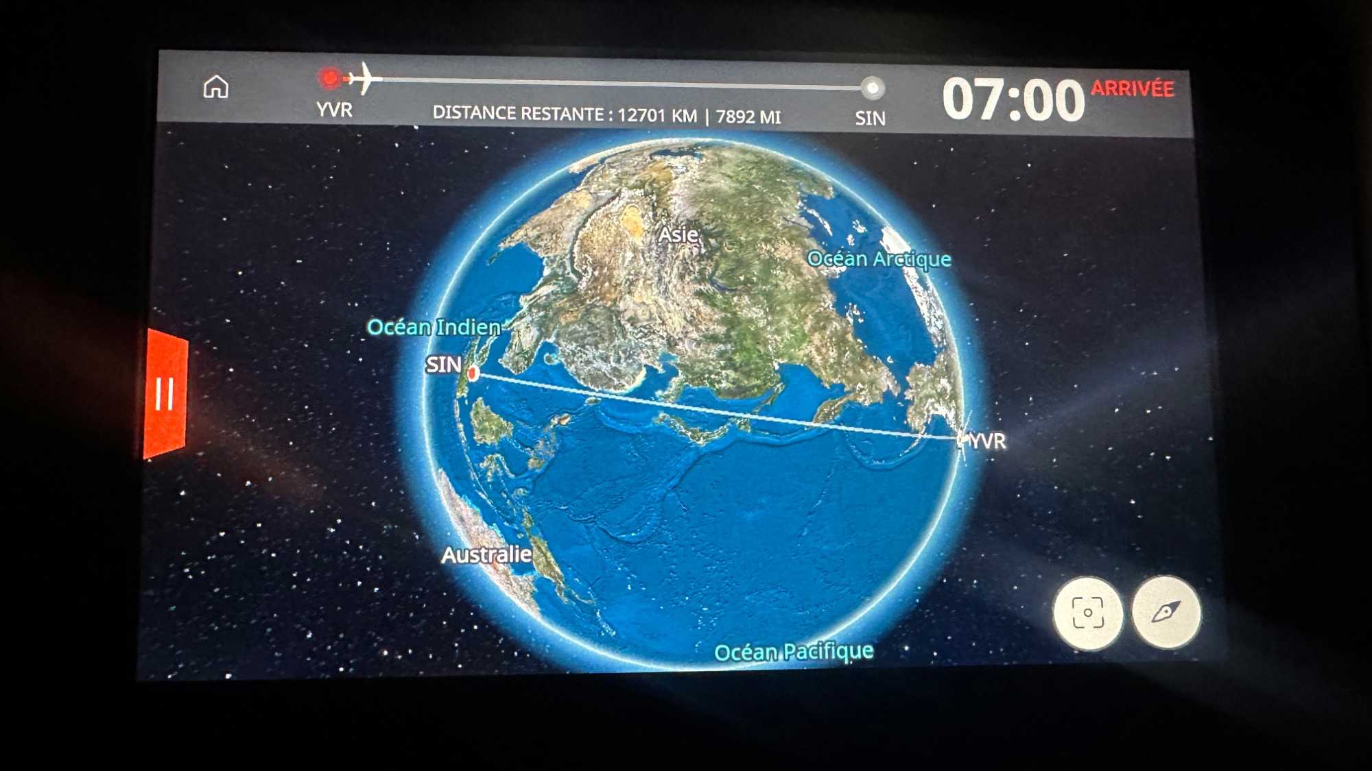 Bonjour me semble le meilleur souhait pour cette journée du 20 février qui restera un fait d’arme dans notre jeune ou longue carrière de voyageur. Au risque de me répéter, nous accomplissons le plus long segment de vol d’Air Canada en ce moment. On parle de 13000 km. Deux équipages complets vont se relayer à mi-chemin pour notre sécurité et notre plus grand confort. Trois services de repas: l’inévitable souper "pâtes ou poulet" après avoir décollé, un dîner léger constitué d’une très fraîche sandwich de blé à la salade de poulet et un déjeuner bien protéiné d’oeufs brouillés nous ont été servis. Je dois dire que tout était bon, chaud, ça a fait le travail. C’est en Boeing 787-9, assez récent, que nous accomplirons cette épique traversée de la planète. Vous vous demandez quel fut le trajet aérien? Voyez plus bas la photo prise, mais en gros, direction nord-ouest vers l’Alaska, traversée de l’océan Pacifique où débutent les îles aléoutiennes, pour ensuite longer le sud de la péninsule du Kamchatka (Russie). En direction sud, nous traversons le nord du Japon puis suivons les côtes de la Chine près de Shanghai. Enfin, en ligne droite vers Singapour. Nous survolons presque Hong Kong, Ho Chi Minh (Vietnam) au passage. En fait, en regardant cet itinéraire, je réalise que l’on survole littéralement la partie nord de ce qu’on appelle “la ceinture de feu du Pacifique” qui n’est rien de moins que la ligne où se concentre la principale activité volcanique du Pacifique. Nous sommes donc bien placés pour un éventuel spectacle volcanique. Je vous rassure, rien de tout ceci n’est arrivé !