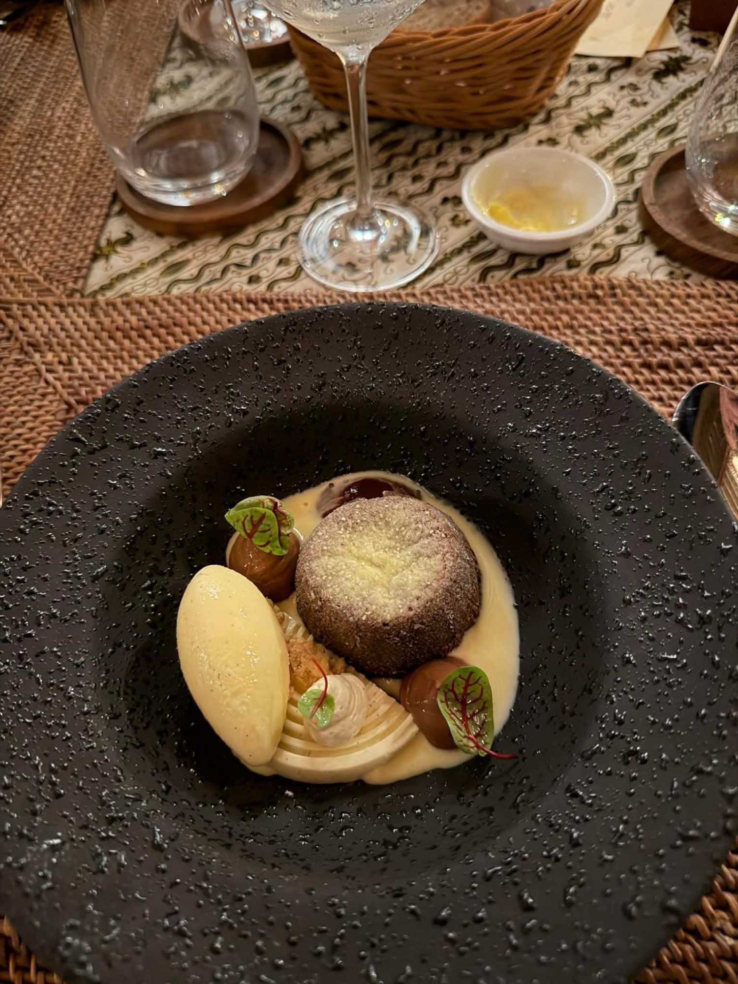 Le souper se prend tranquillement, sans se presser. Terrine au canard, excellent potage aux poireaux , des “crevettes king prawns” au menu principal, dessert fabuleux: un fondant au chocolat avec fruits frais et crème glacée à la vanille. Le musicien chanteur a bien animé la soirée avec des succès qu’on fredonnait à son grand plaisir!