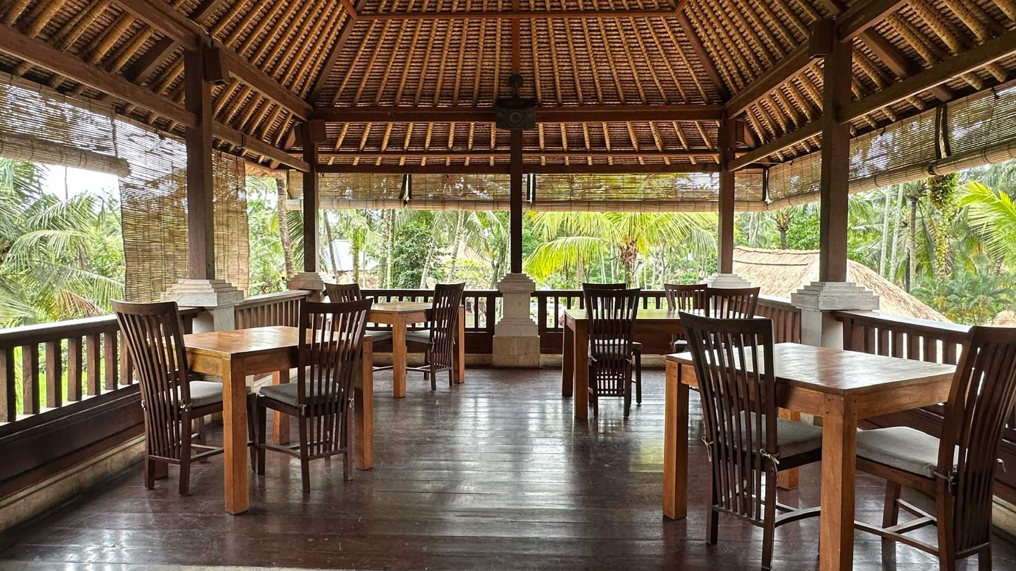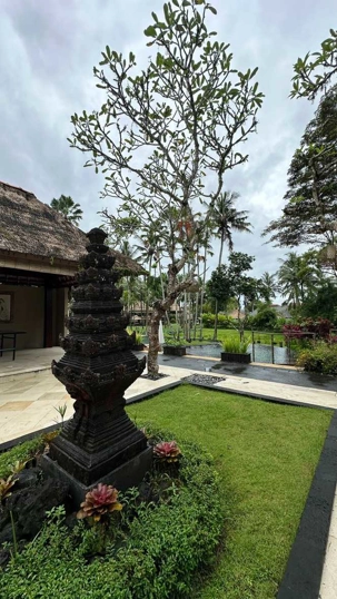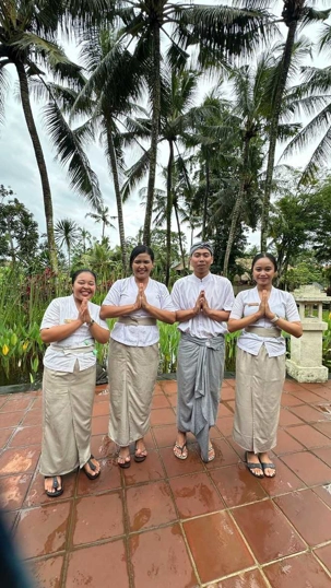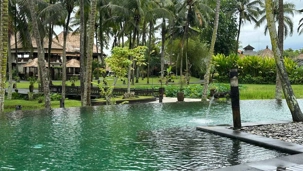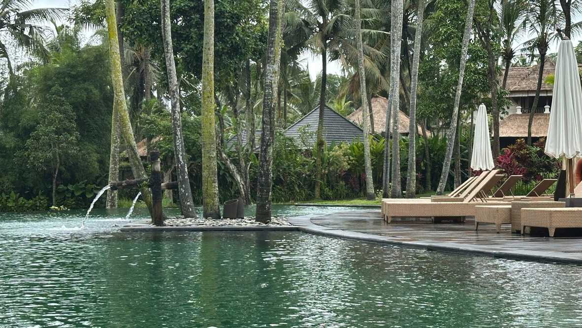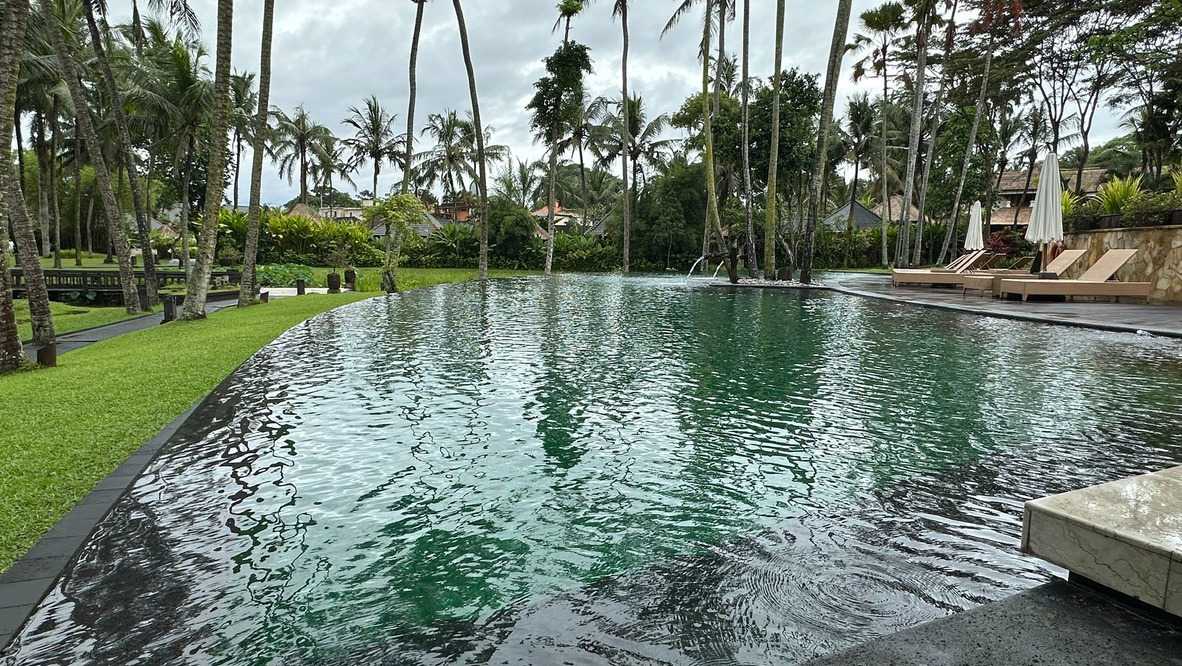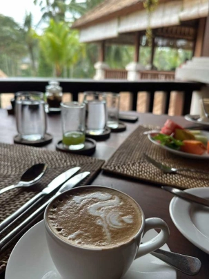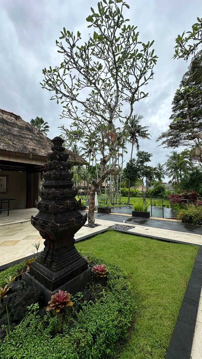 Le réveil se fait naturellement, bercé par les sons de la nature. Les oiseaux se chargent de remplacer toute alarme, Certains émergent tôt, attirés par la fraîcheur relative du matin, tandis que d’autres savourent le luxe de ne rien avoir à faire. De mon côté, j’ai même eu le privilège de pousser quelques longueurs de piscine tôt ce matin. Le petit-déjeuner est un moment bien unique. Servi dans un décor idyllique, il invite à la gourmandise et à la contemplation : fruits tropicaux, jus frais, spécialités locales et café balinais. Les conversations sont tranquilles, encore un peu endormies, mais déjà empreintes de cette sérénité que Bali semble distiller sans effort. On a même pu profiter d’un 10 minutes de soleil. Nous avons tout de même appris une leçon de base: Ne sortez jamais sans le parapluie que l’hôtel fournit gracieusement, heureusement!