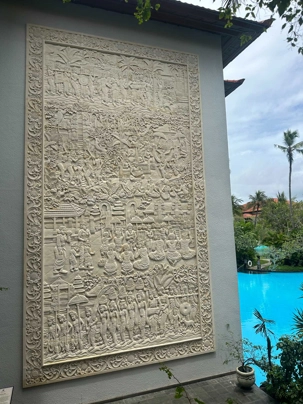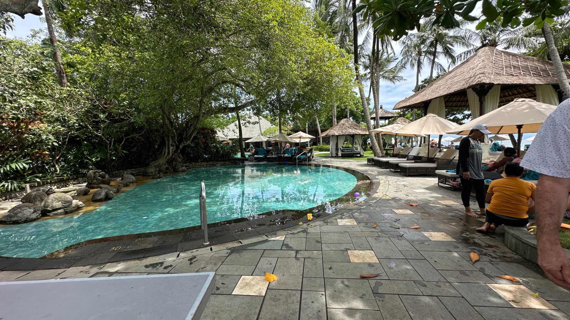 Rien de moins que la plus belle journée météo de notre voyage! Dame nature fut réellement clémente pour notre beau groupe en nous octroyant un soleil radieux, un ciel parsemé de quelques nuages protecteurs de nos peaux toutes blanches, une douce brise venue directement de l’océan Indien. Nous nous sommes réveillés doucement ce matin en se pinçant d’être dans cet oasis que nous n’avons même pas encore découvert. La seule vue des piscines longeant tout l’édifice dont une salée au sud, une autre à l’eau douce au nord, la végétation digne d’une jungle tropicale façonnée en bosquets bien fournis et taillée par des dizaines de jardiniers au sourire bienveillant. C’est ce que nous pouvons apercevoir pour l’instant à part le grand soin que le personnel porte à fournir tout ce dont nous pourrions avoir besoin. L’hospitalité balinaise est poussée ici à un extrême raffinement. Je vous en reparlerai un peu plus loin.