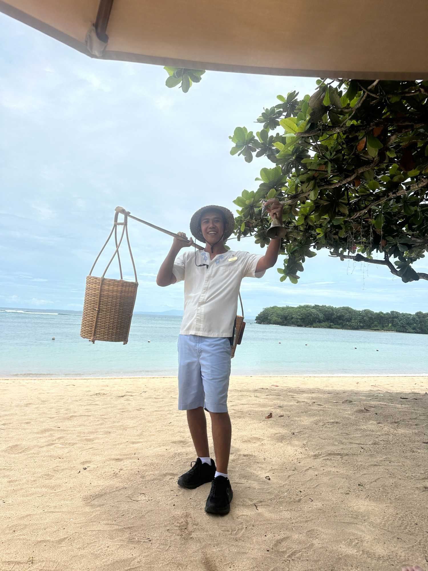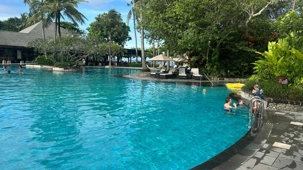Donc, au programme aujourd'hui: farniente. Une journée entièrement libre pour profiter à notre guise des installations du Laguna Resort & Spa ou pour partir à la découverte des environs, observer les surfeurs à la pointe de Pura Nusa et même continuer par la plage vers l’autre presqu’île. Une navette gratuite a emmené quelques magasineurs.euses au Bali Collection Shopping Mall. On a profité de l’eau de mer salée pour soigner notre peau. Les chaises longues à l’ombre d’arbres aux larges feuilles nous protégeant du soleil de plomb. D’ailleurs, si vous trouvez que vos proches ont un teint un peu plus basané, c’est que nous arborons nos premiers coups de soleil dont l’origine date de notre randonnée dans les rizières hier.