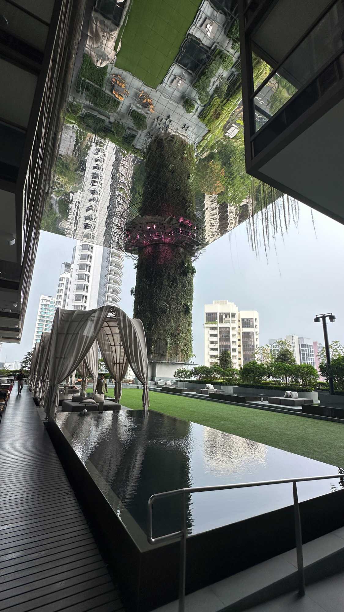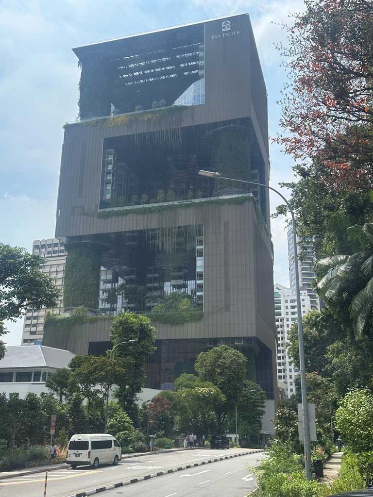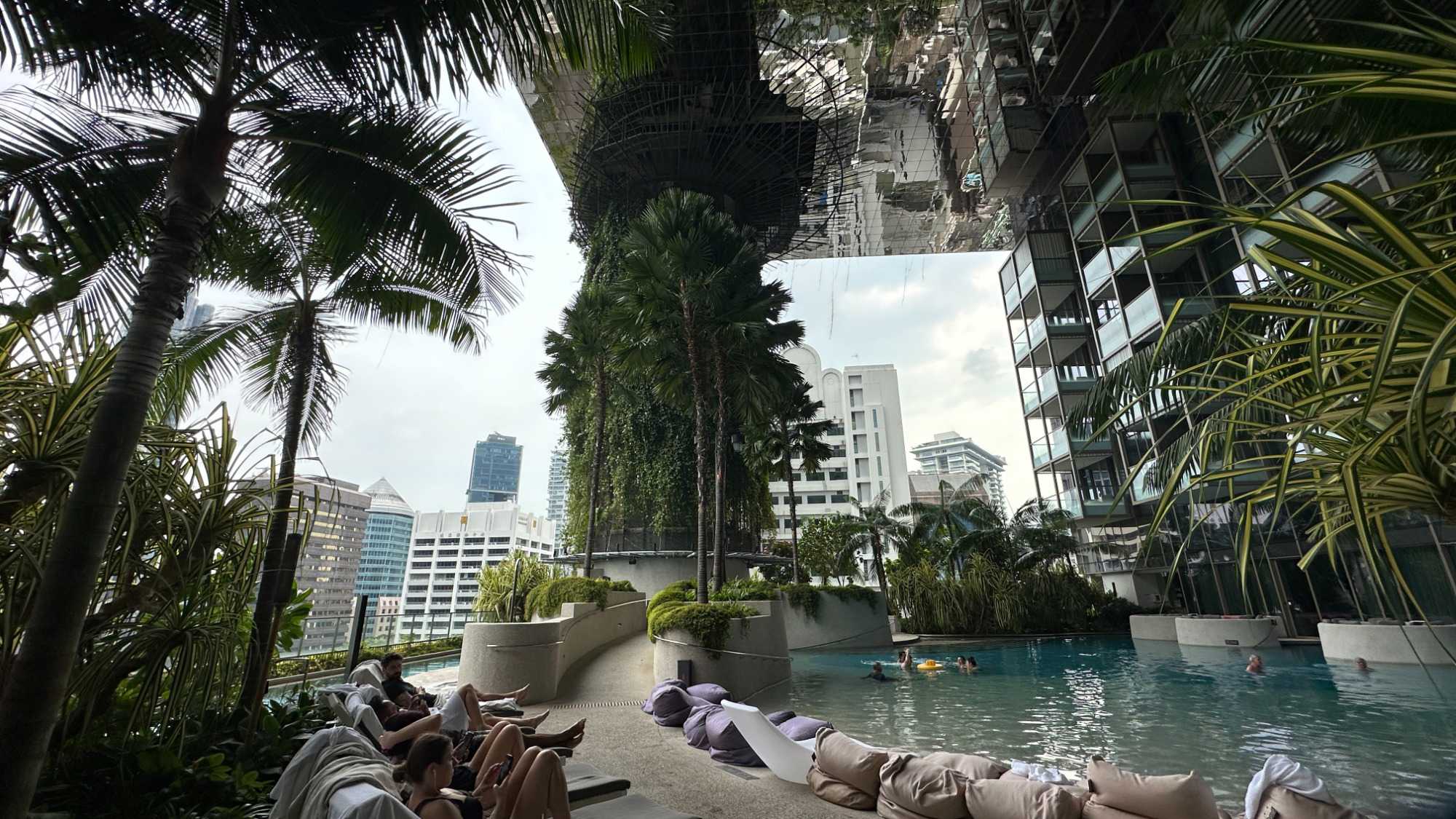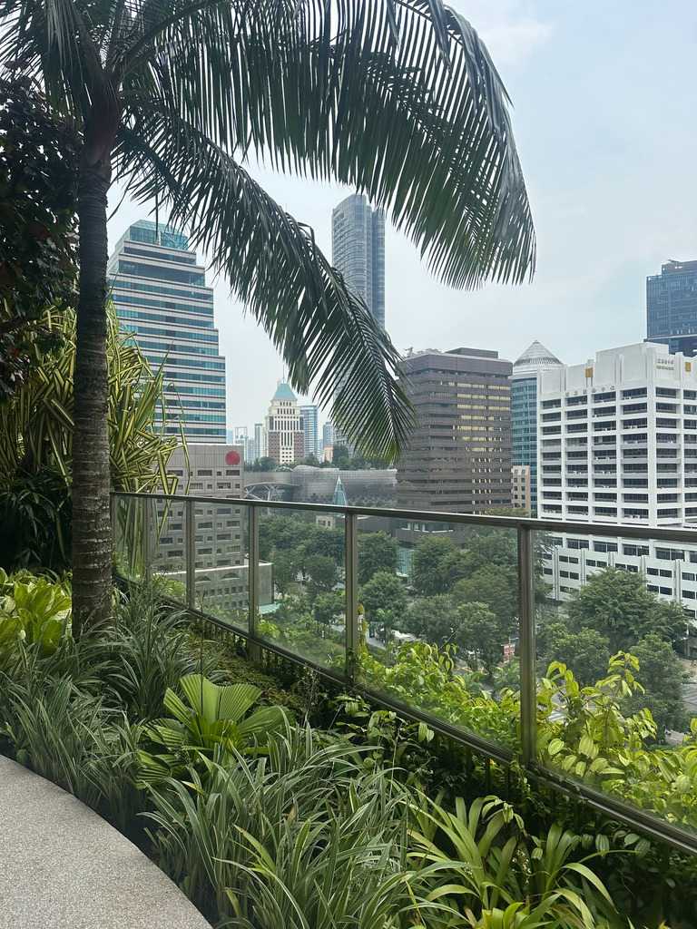 Transfert au centre-ville vers notre hôtel, le Pan Pacific. Même si nous avions peu de temps avant de ressortir pour la mini-croisière ce soir, nous nous sommes réunis à l’immense piscine du 5e étage de l’hôtel, suspendue telle une terrasse verdoyante. Cet hôtel a d’ailleurs gagné un prix pour avoir intégré autant de végétation. Nous ne manquons pas de visiter le 11e étage où l’on retrouve une magnifique terrasse.