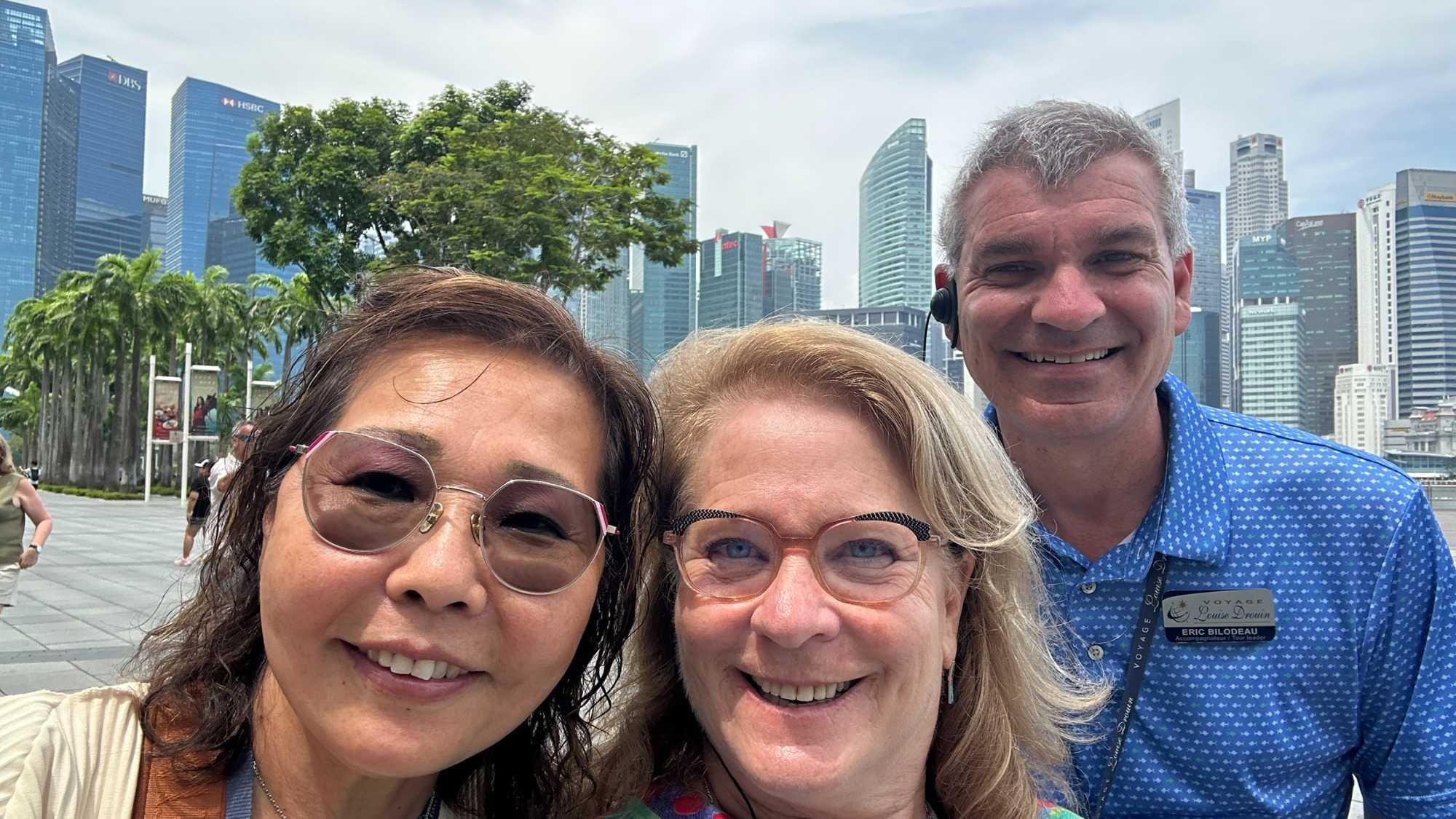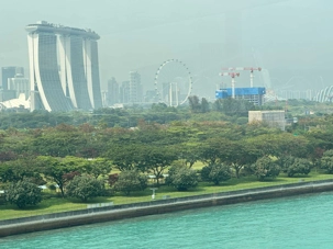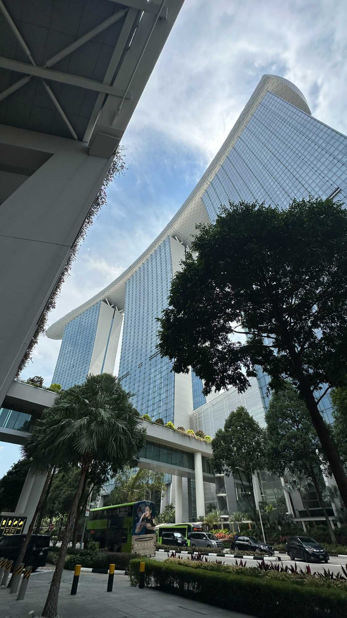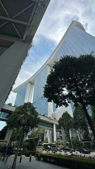 En nous rendant au terminal de croisière, nous nous arrêtons au centre des congrès du Marina Bay, pour avoir la pleine conscience de la dimension de ce complexe d’où, ….scoop, une quatrième tour jaillira prochainement. Le Marina Bay Sands Hôtel attire particulièrement notre regard. Cet immense complexe hôtelier est composé de trois tours imposantes, chacune haute de 55 étages, culminant à environ 200 mètres. Reliées par une terrasse spectaculaire sur le toit en forme de bateau – le SkyPark – les tours dessinent une silhouette unique dans le ciel singapourien. Le SkyPark, avec sa fameuse piscine à débordement perchée sur le toit, est non seulement une prouesse d’ingénierie, mais offre aussi une vue imprenable sur la ville. Conçu par l’architecte Moshe Safdie et inauguré en 2010, le Marina Bay Sands est un symbole d’audace et de luxe, intégrant des systèmes avancés pour assurer la stabilité et la sécurité, même face aux rares tremblements de terre ou vents violents que pourrait connaître la région.