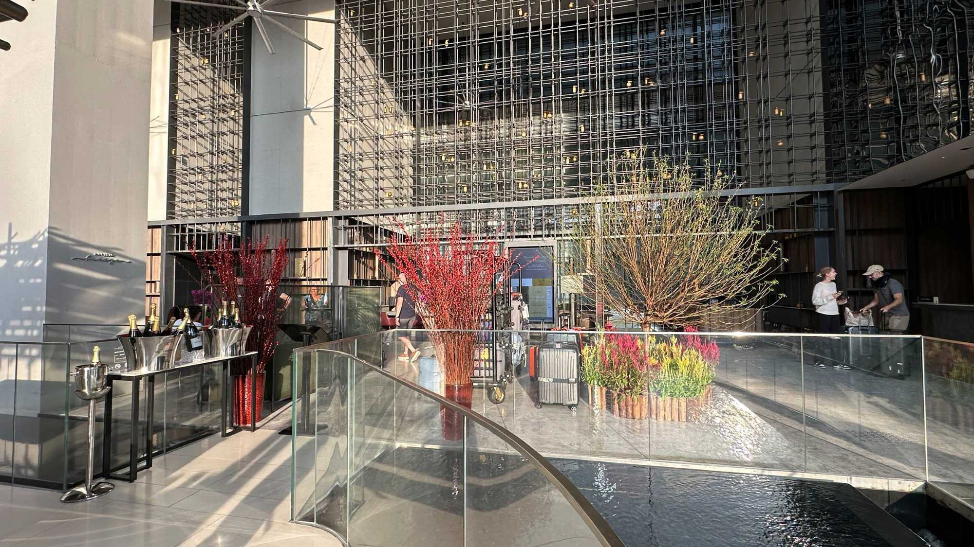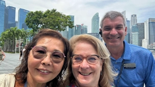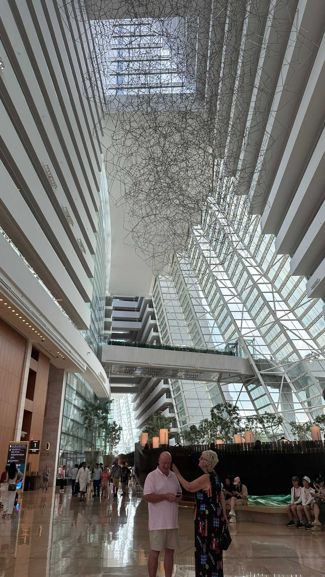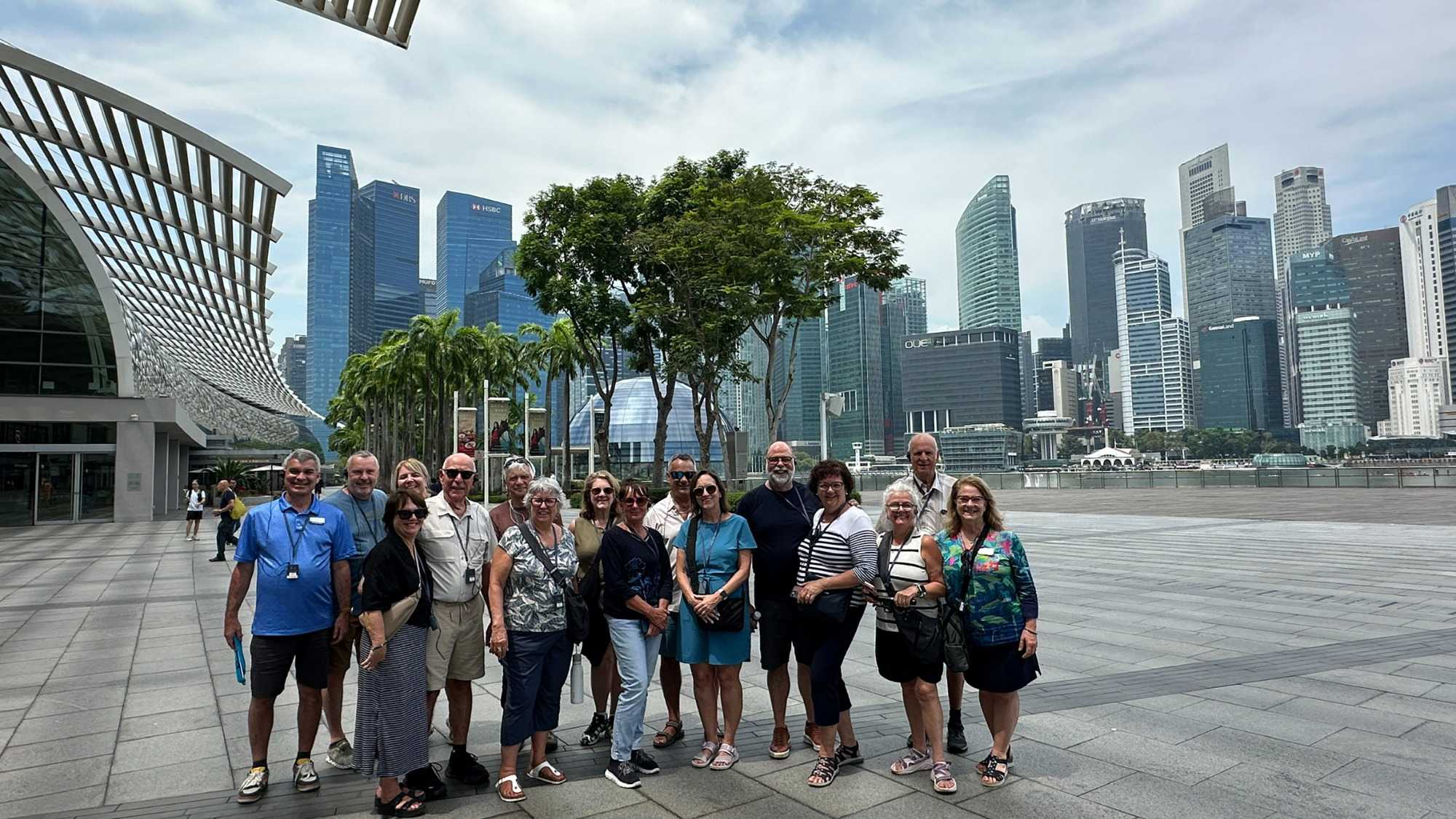 En nous rendant au terminal de croisière, nous nous arrêtons au centre des congrès du Marina Bay, pour avoir la pleine conscience de la dimension de ce complexe d’où, ….scoop, une quatrième tour jaillira prochainement. Le Marina Bay Sands Hôtel attire particulièrement notre regard. Cet immense complexe hôtelier est composé de trois tours imposantes, chacune haute de 55 étages, culminant à environ 200 mètres. Reliées par une terrasse spectaculaire sur le toit en forme de bateau – le SkyPark – les tours dessinent une silhouette unique dans le ciel singapourien. Le SkyPark, avec sa fameuse piscine à débordement perchée sur le toit, est non seulement une prouesse d’ingénierie, mais offre aussi une vue imprenable sur la ville. Conçu par l’architecte Moshe Safdie et inauguré en 2010, le Marina Bay Sands est un symbole d’audace et de luxe, intégrant des systèmes avancés pour assurer la stabilité et la sécurité, même face aux rares tremblements de terre ou vents violents que pourrait connaître la région.